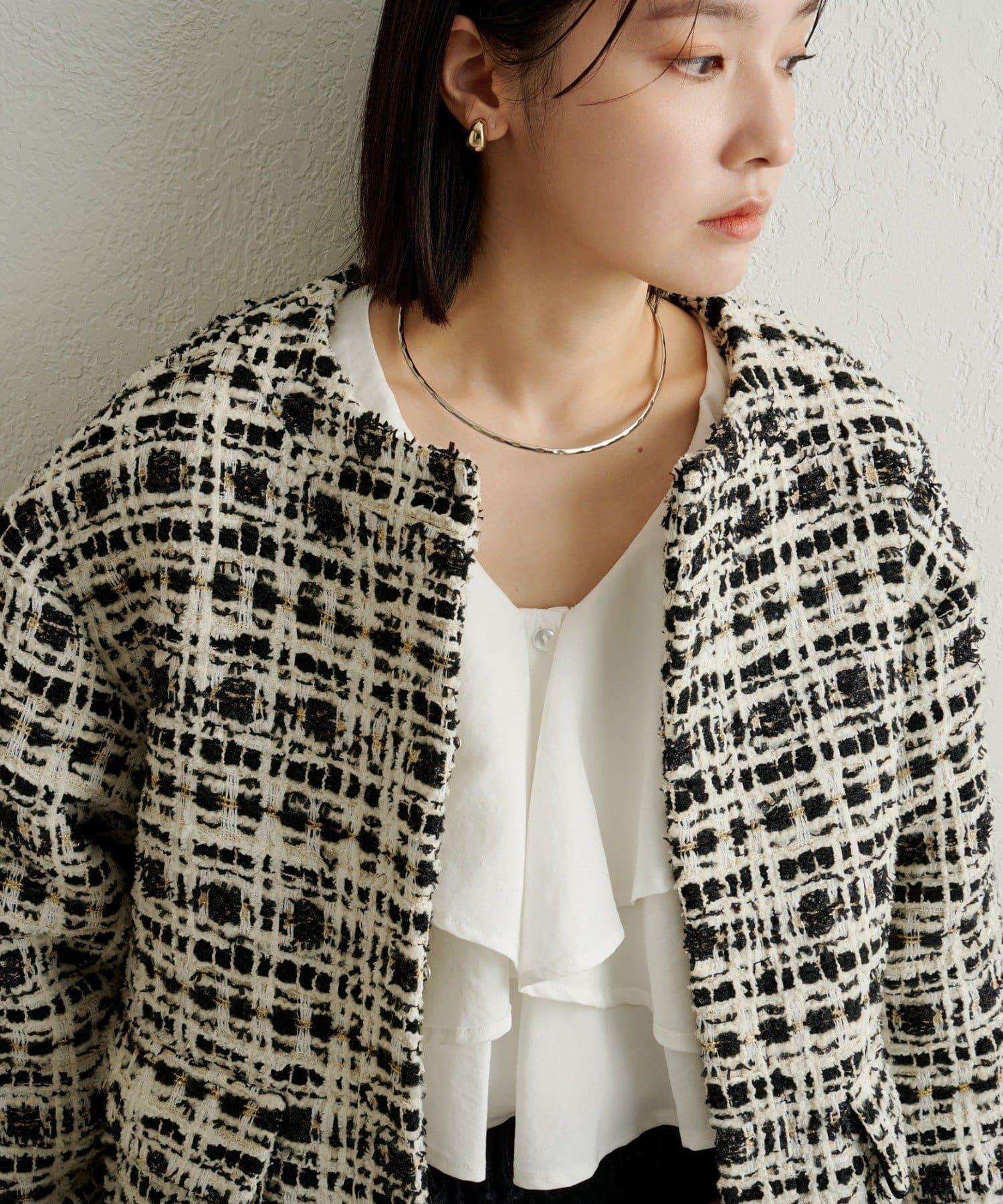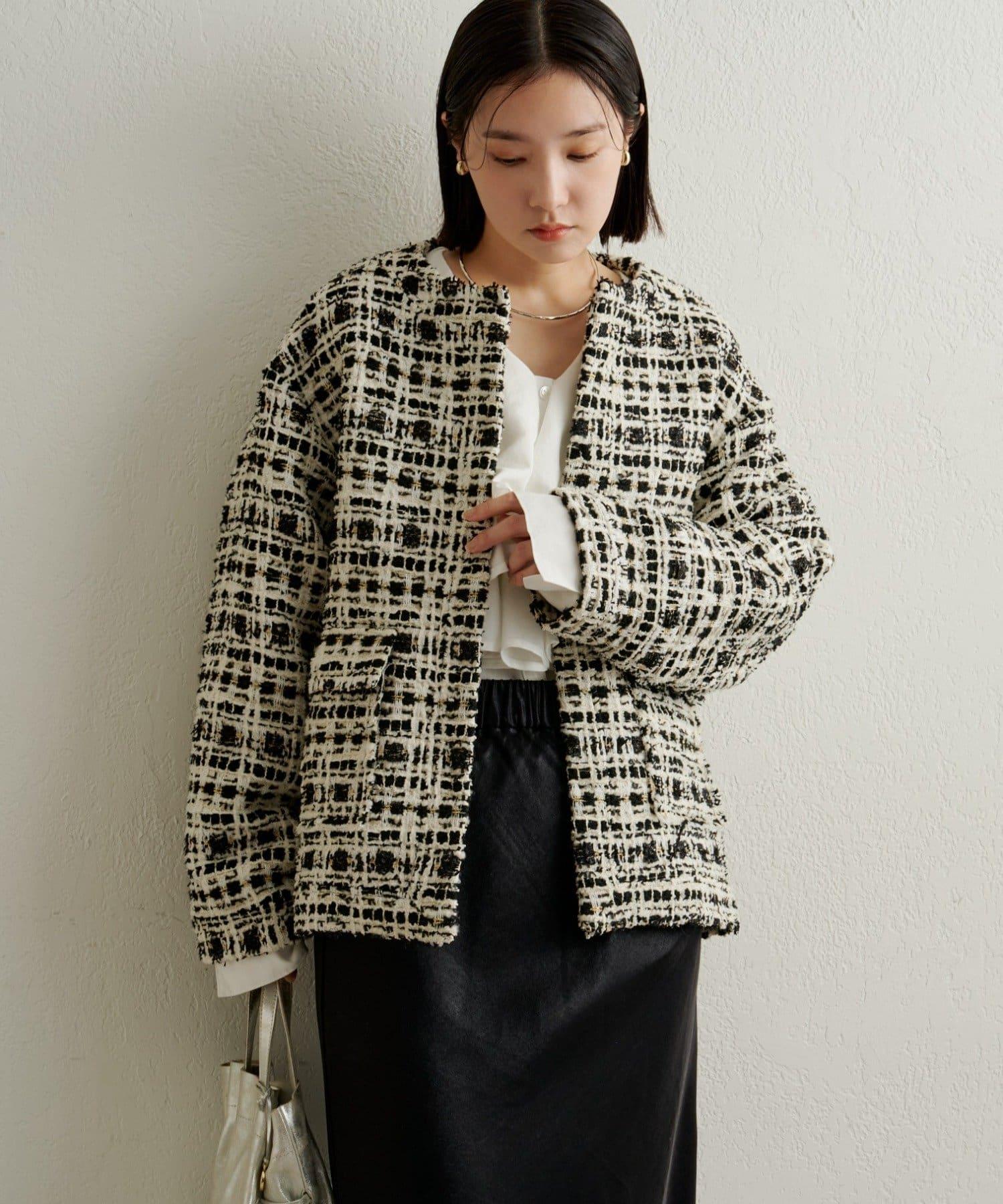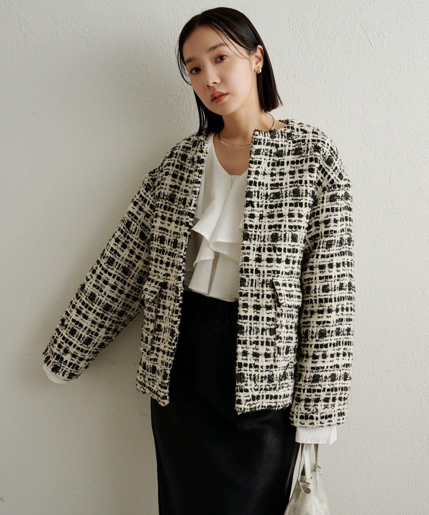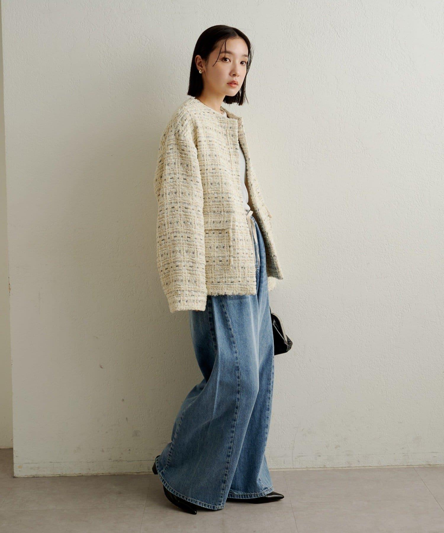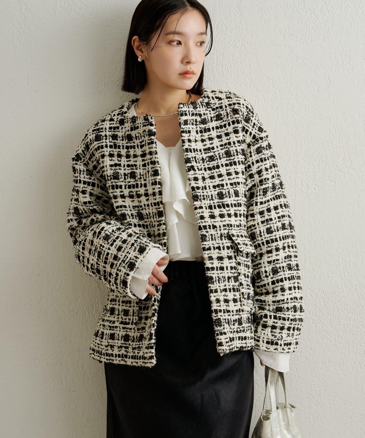 精緻編織的無領斜紋軟呢外套極具吸引力