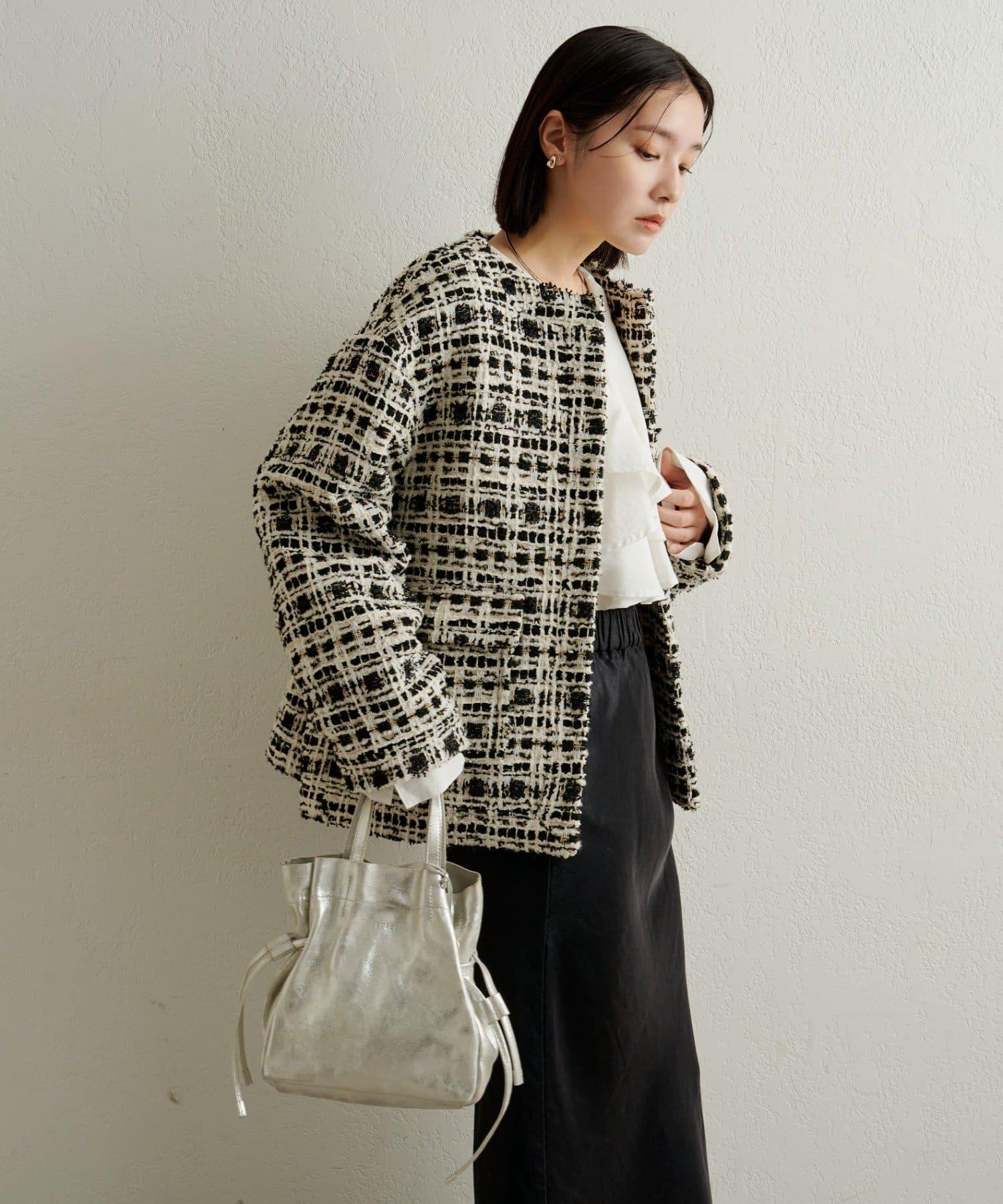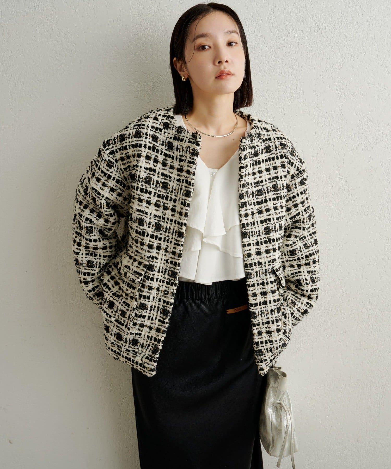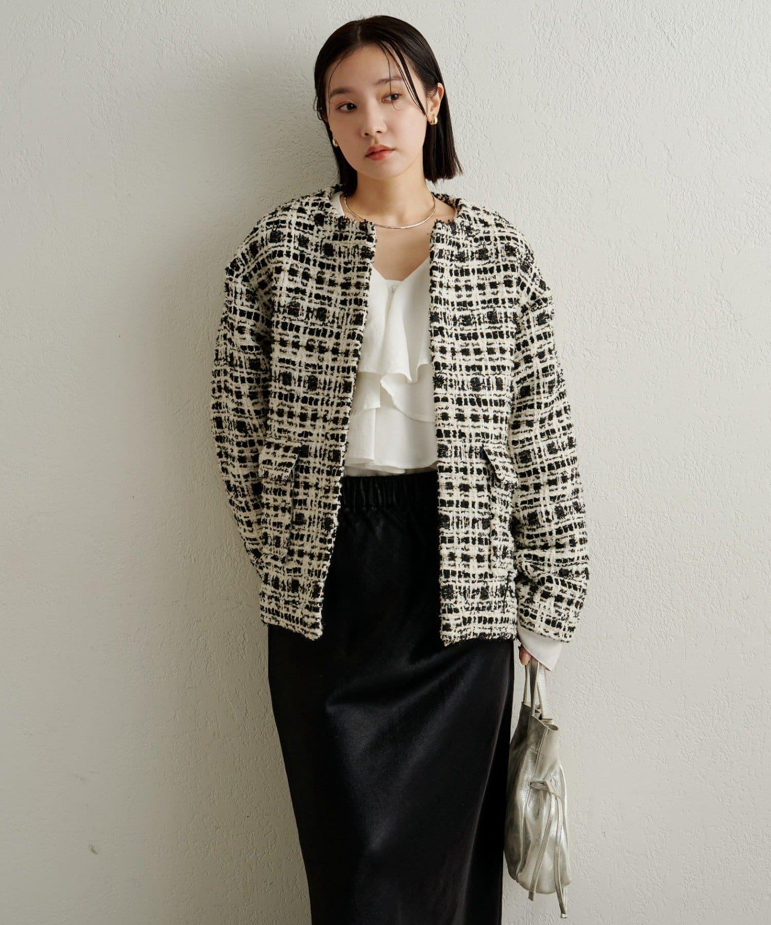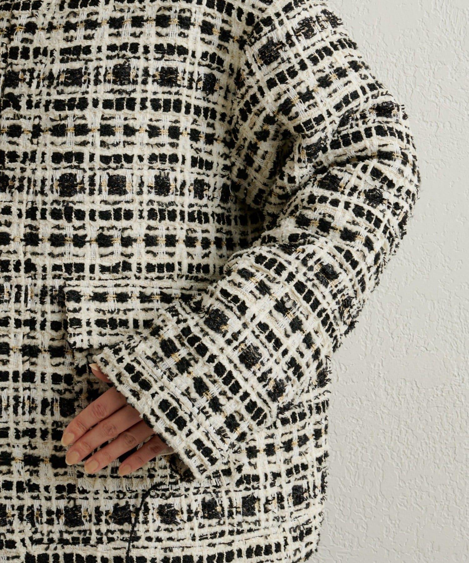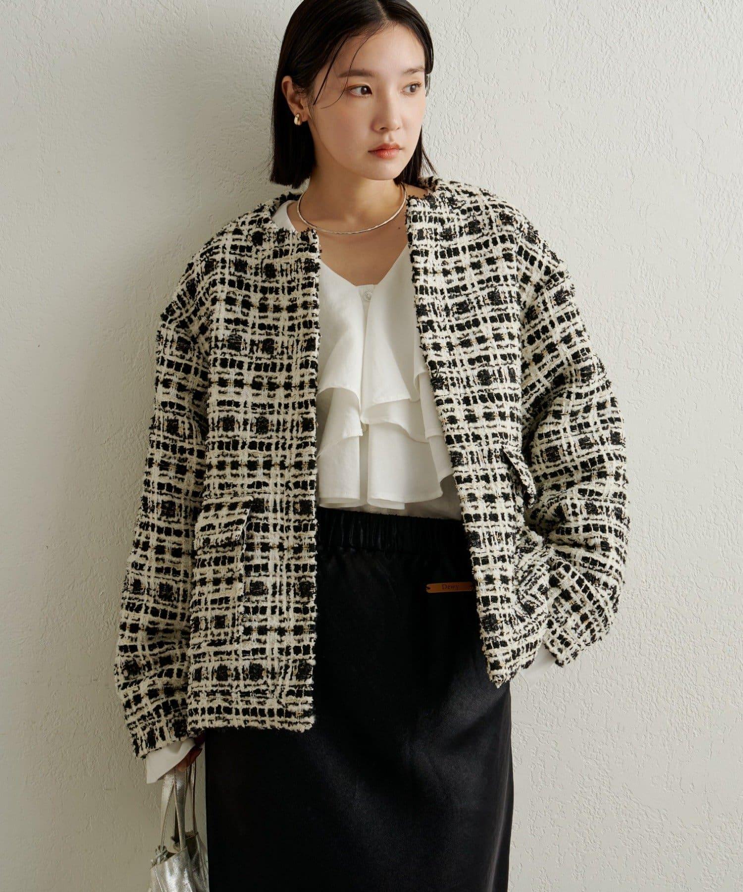 精緻編織的無領斜紋軟呢外套極具吸引力