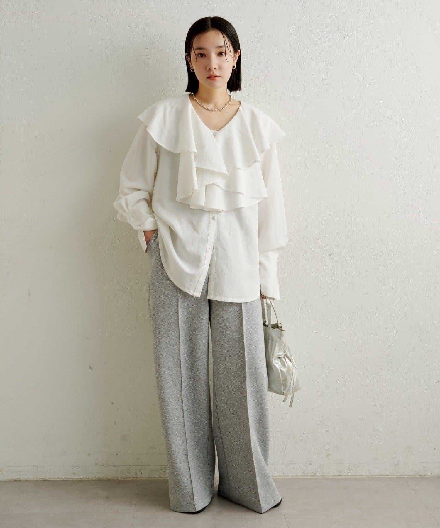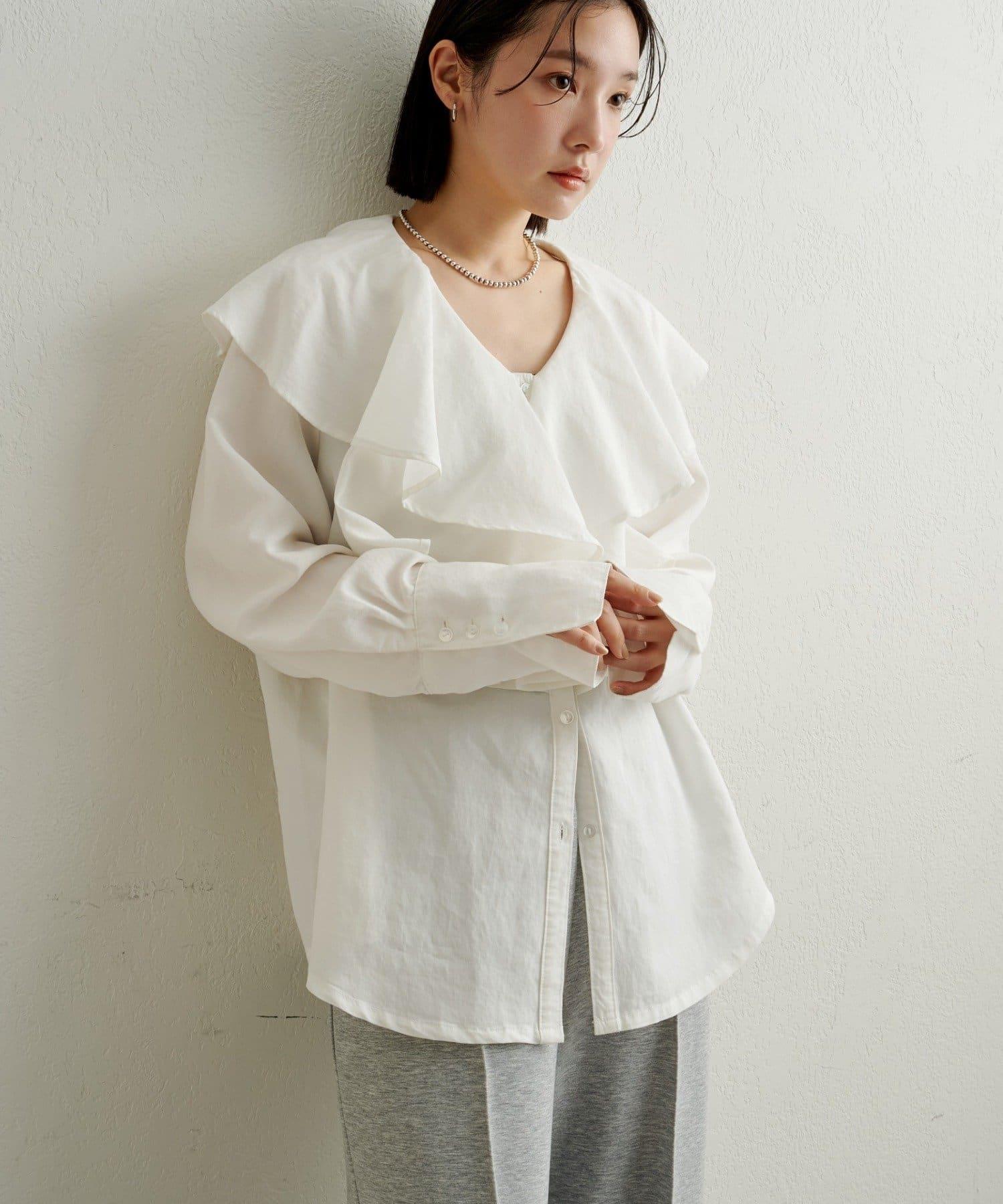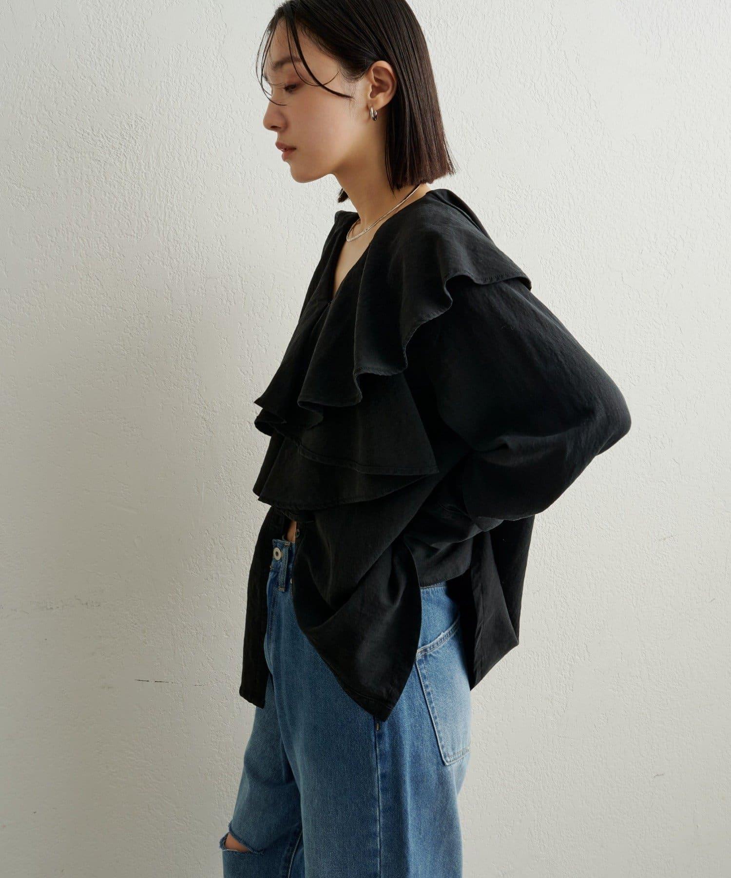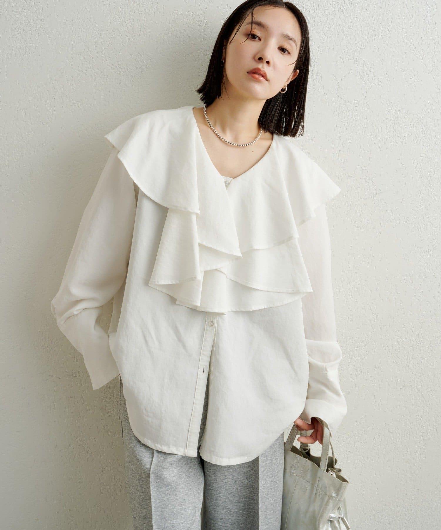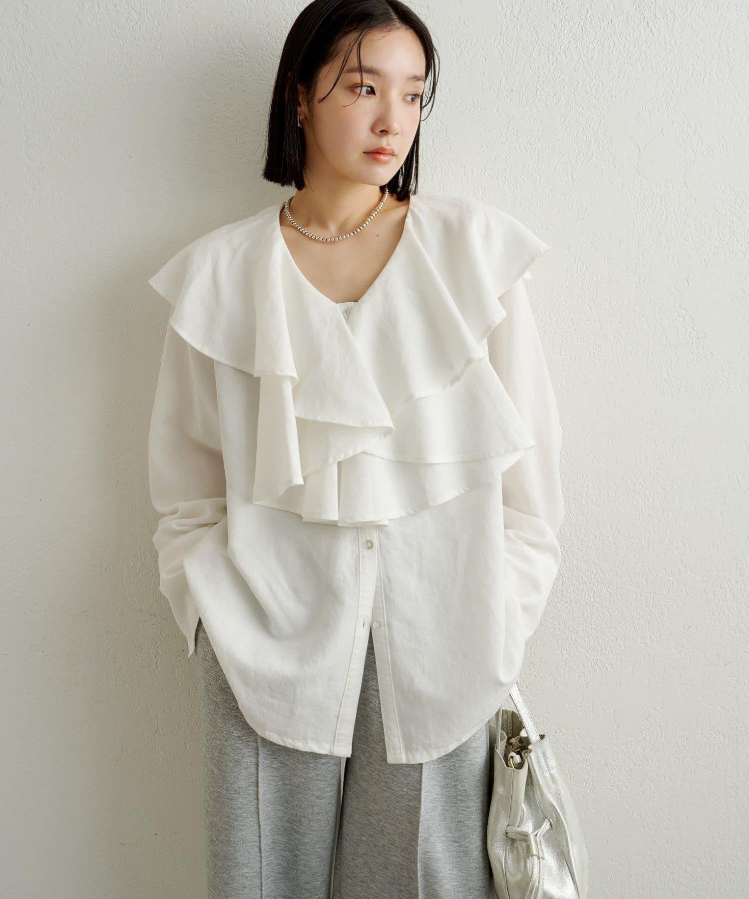 只有一件單品!褶邊襯衫,佔據中心位置。