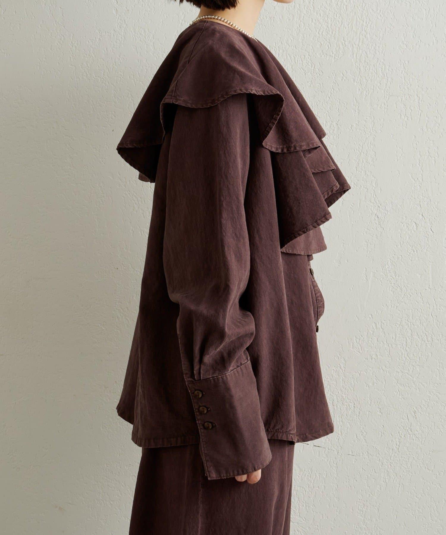 V 領的設計讓臉部看起來乾淨寬鬆,而大面積的荷葉邊則增添了一絲魅力。