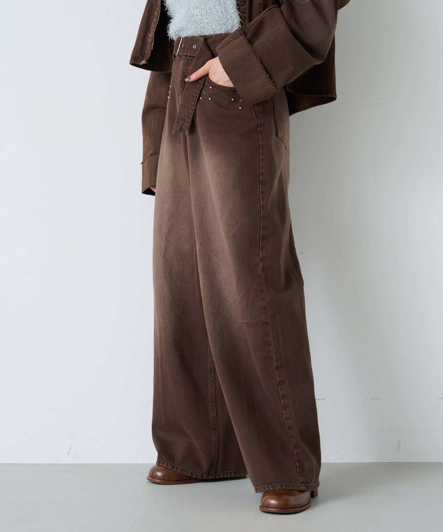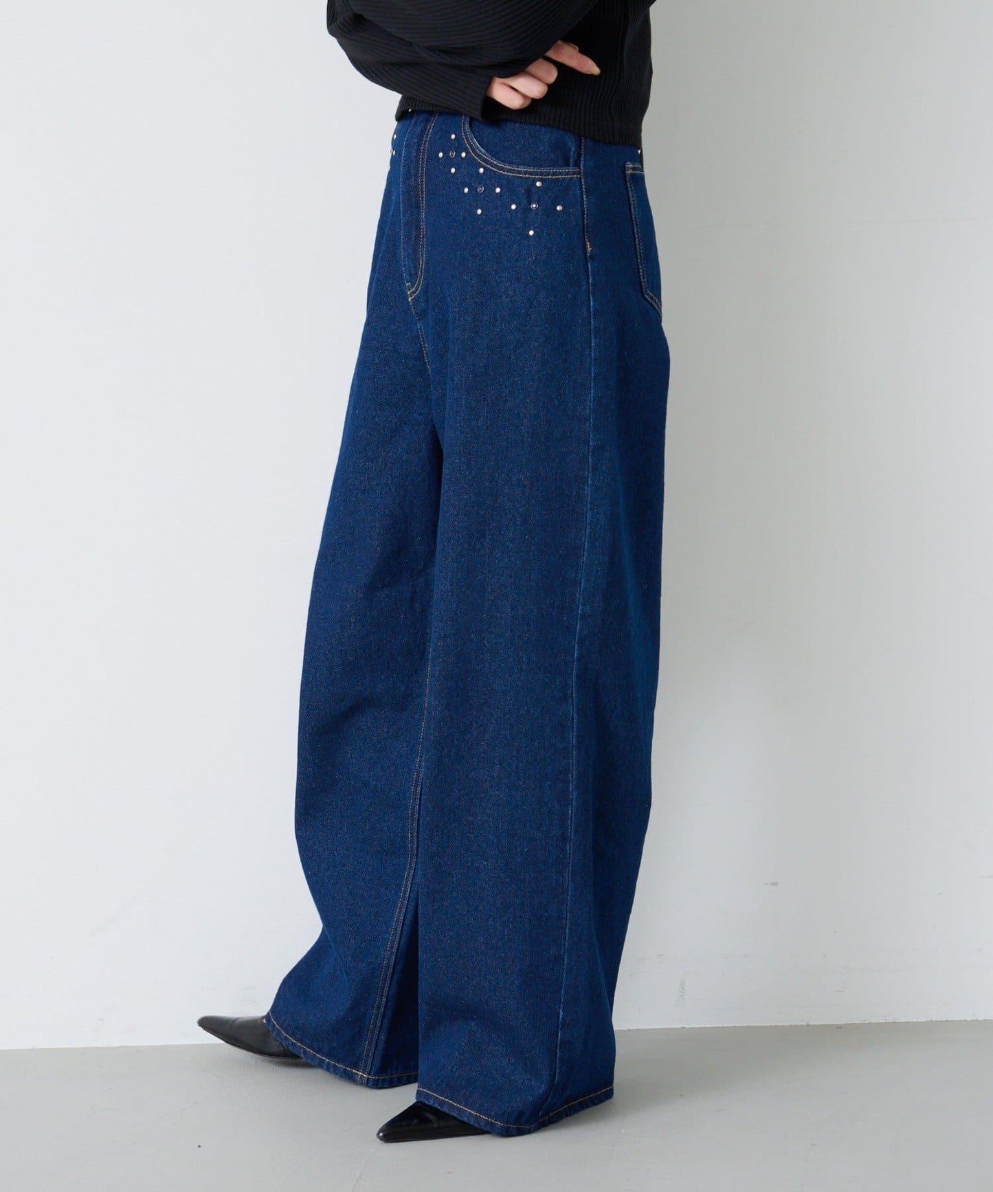牛仔長褲,腰部飾有寶石。