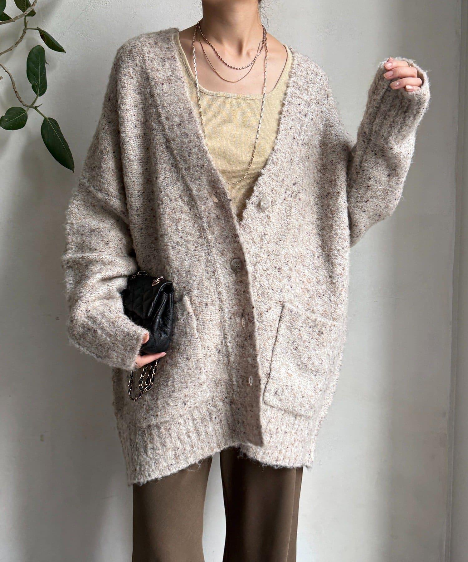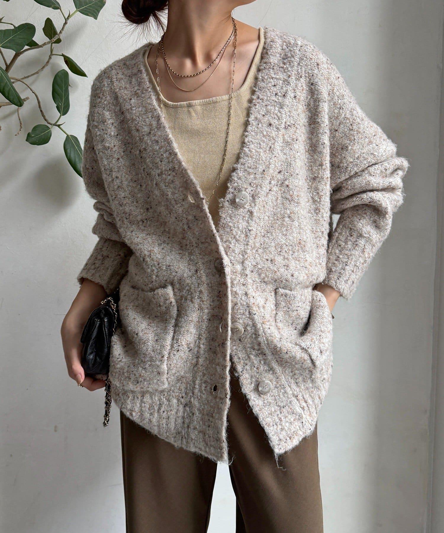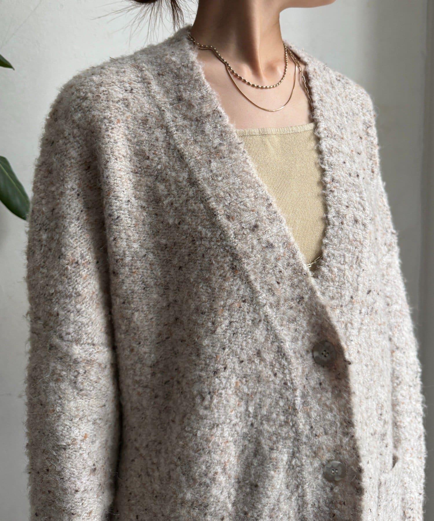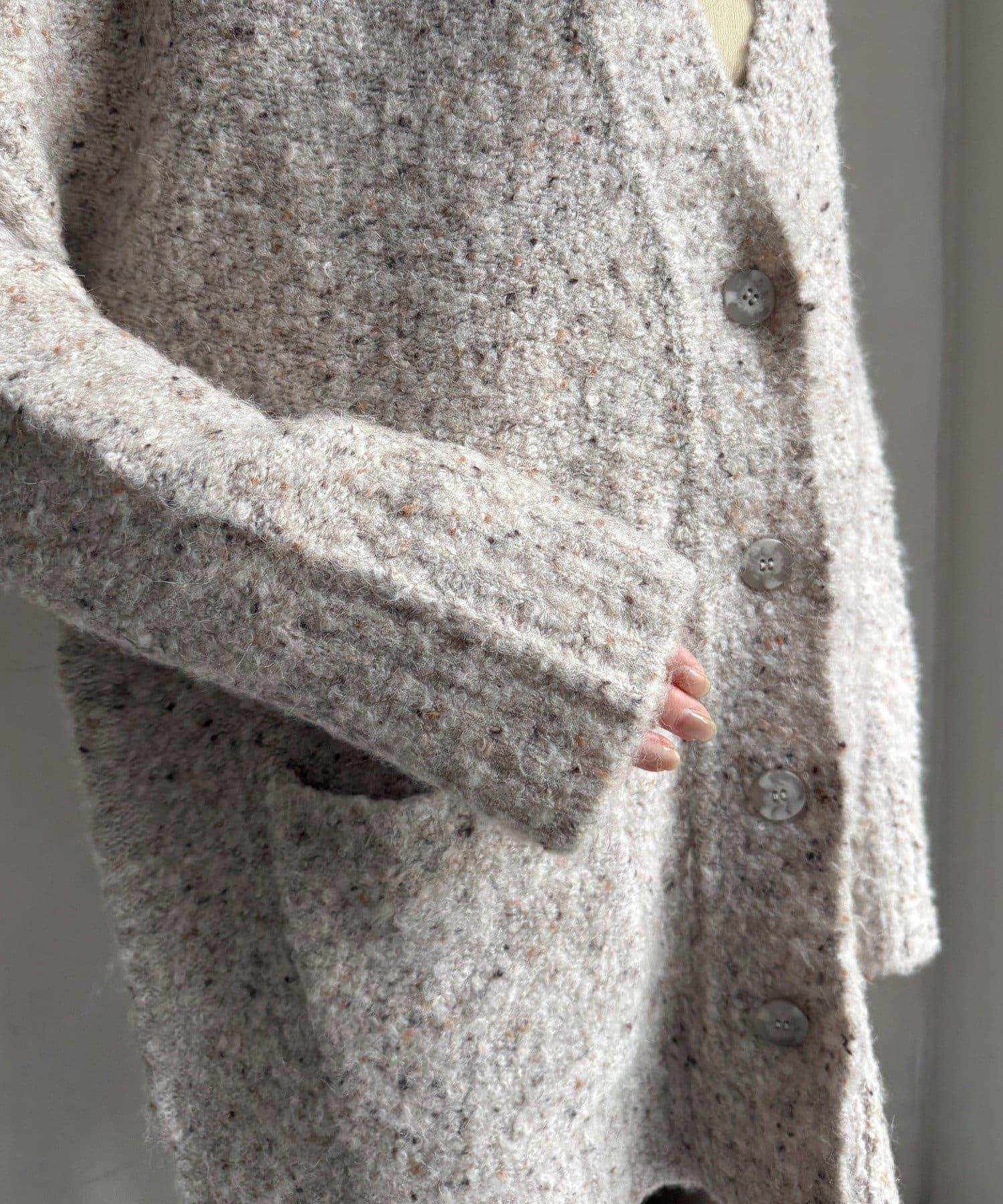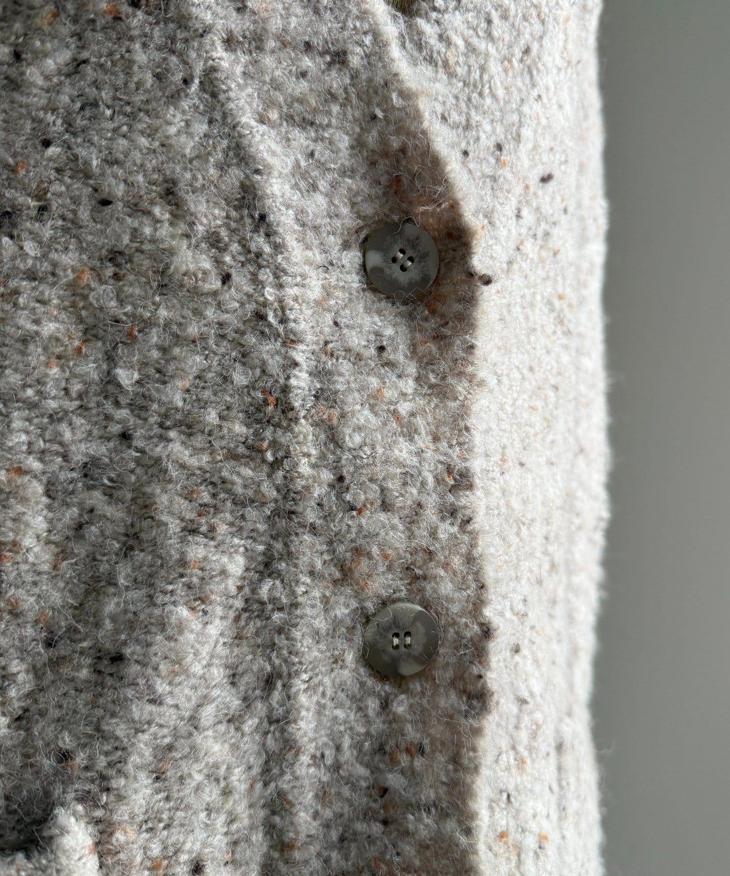 這款開襟羊毛衫上散落著五顏六色的棉結。