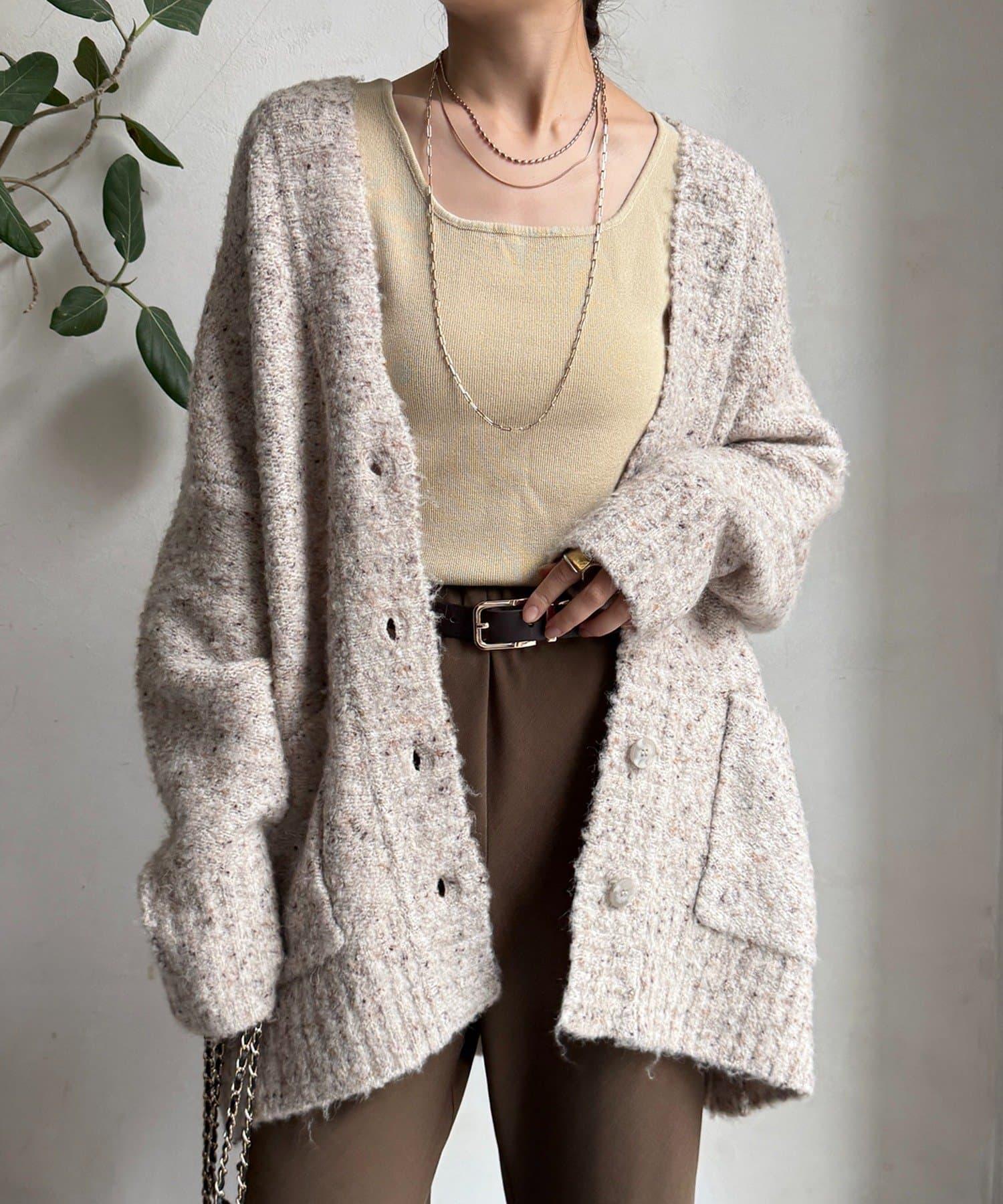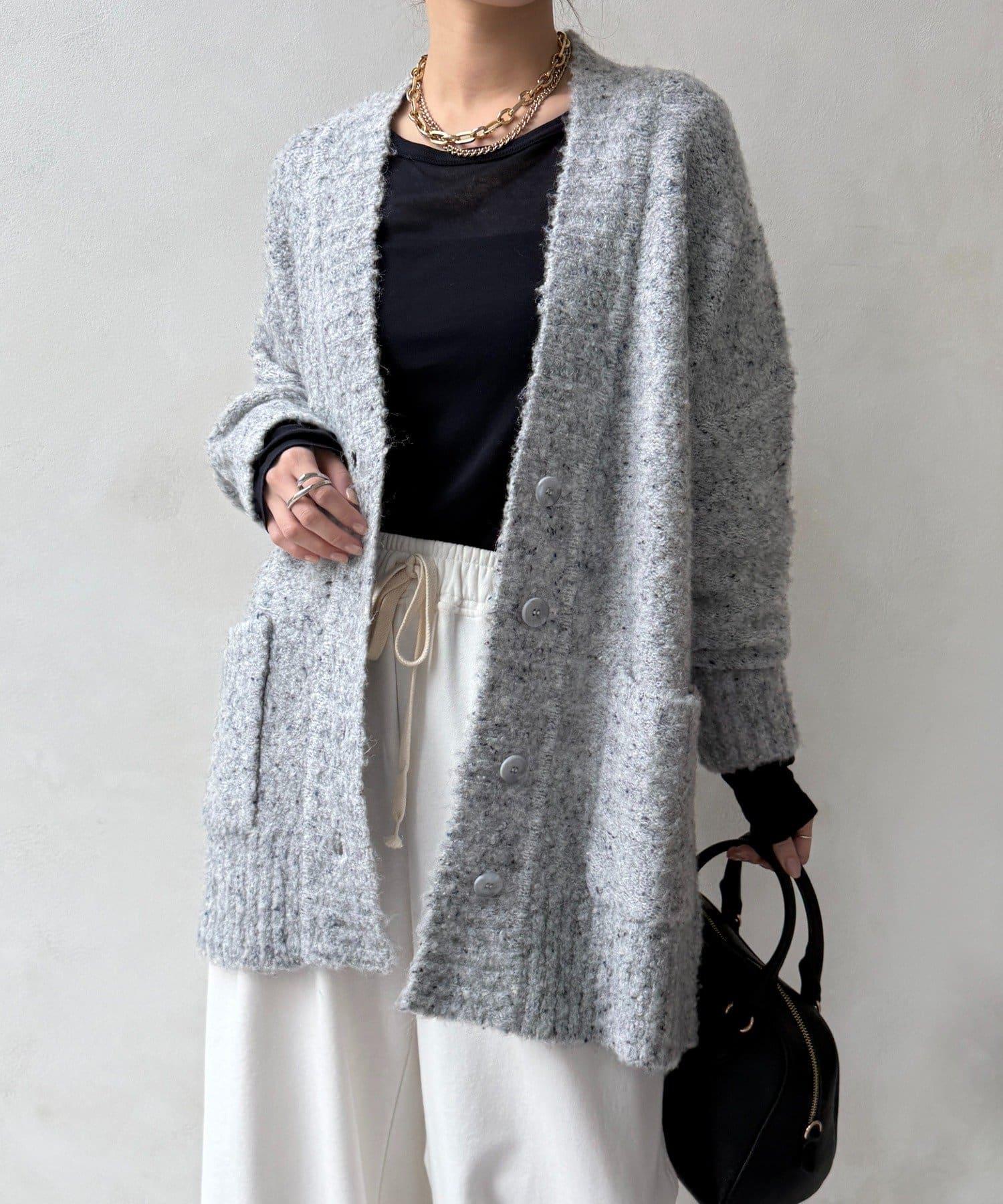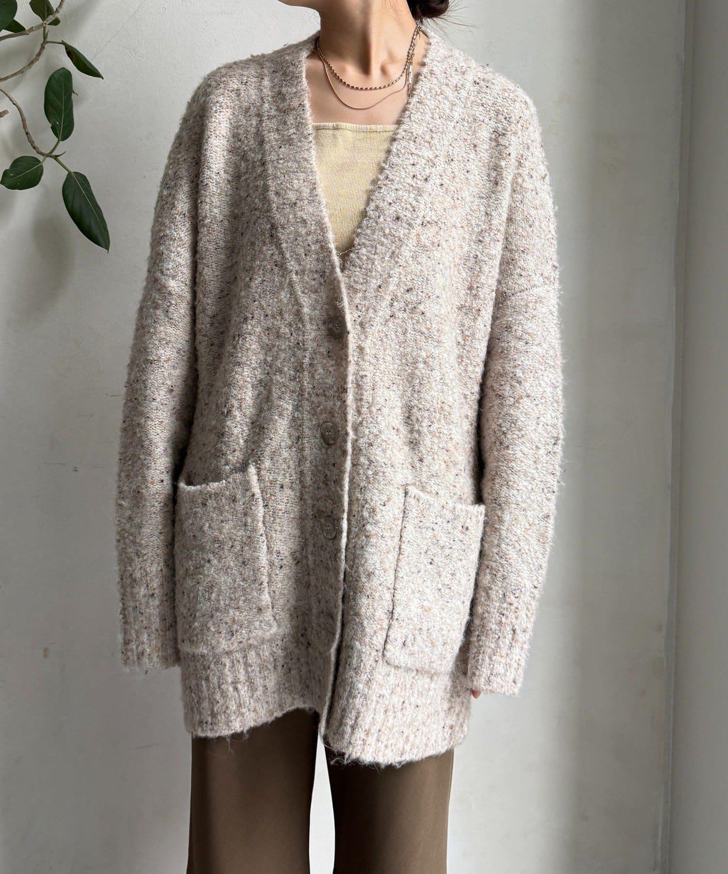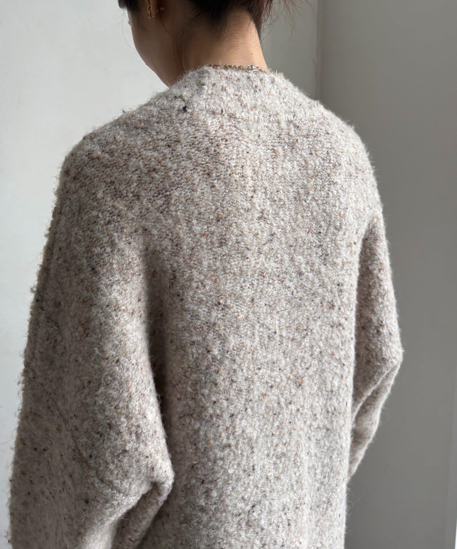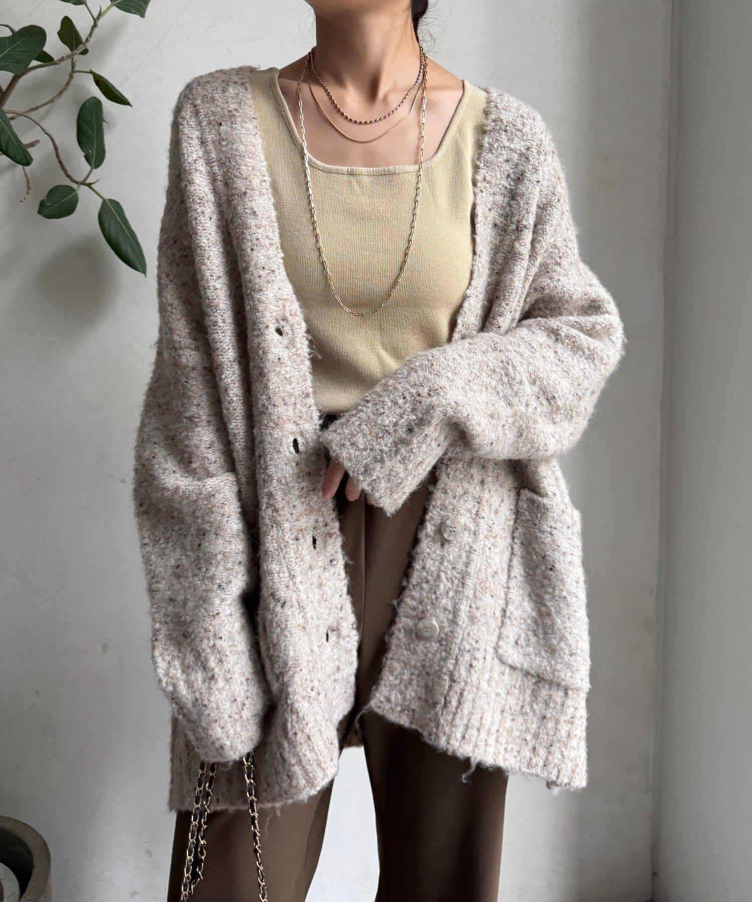 這款開襟羊毛衫上散落著五顏六色的棉結。