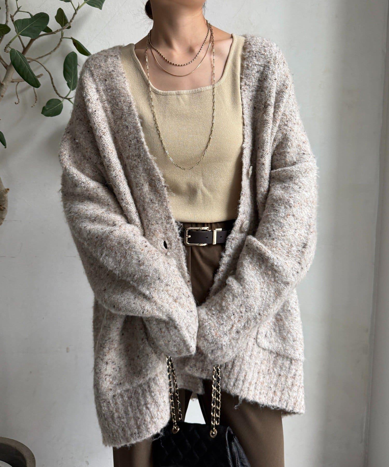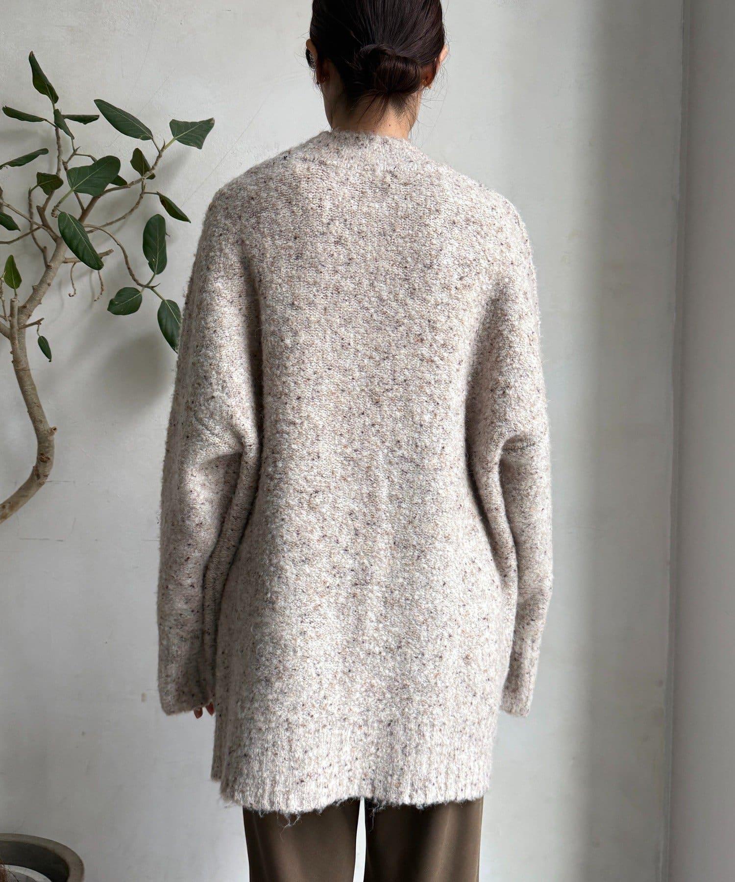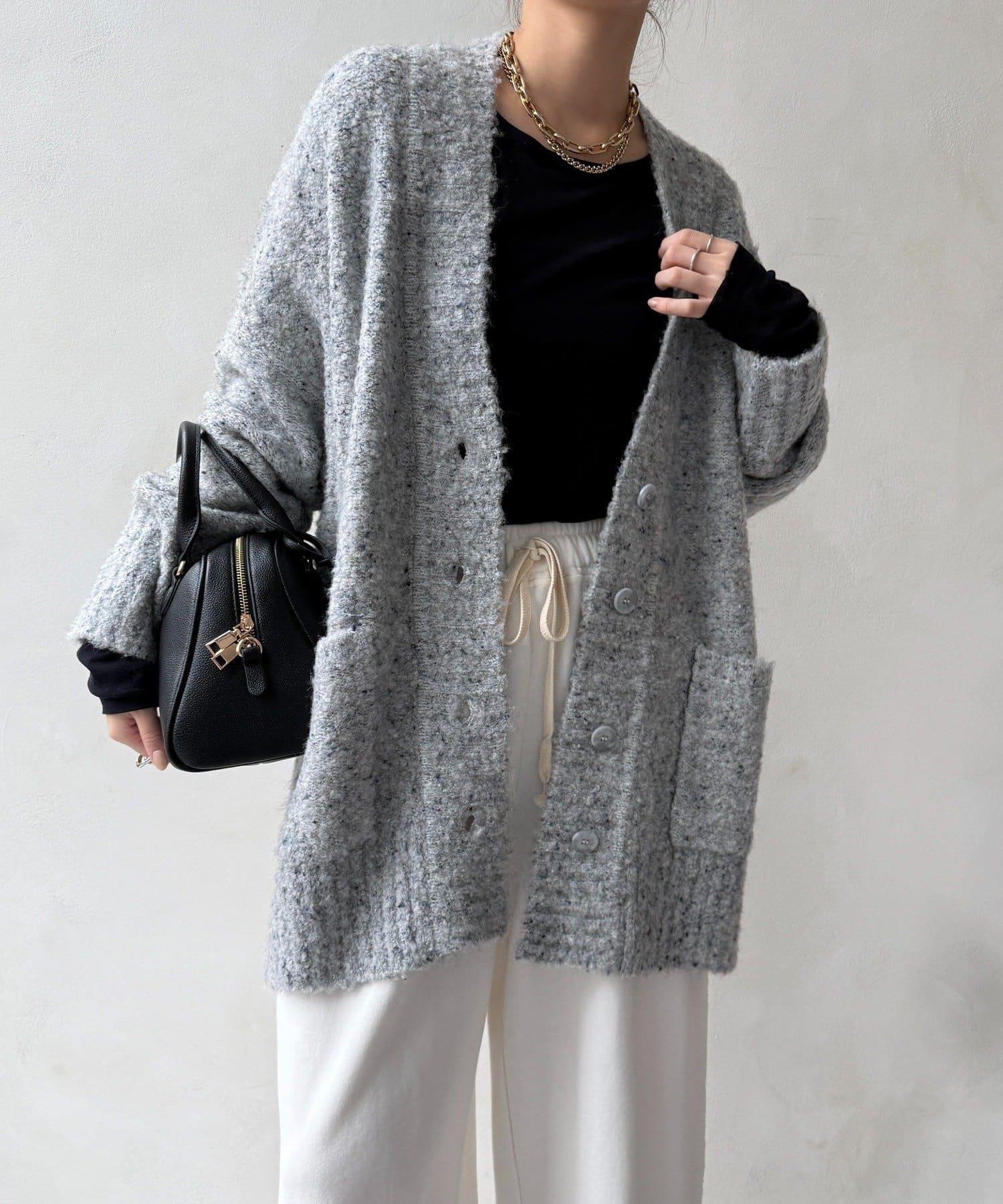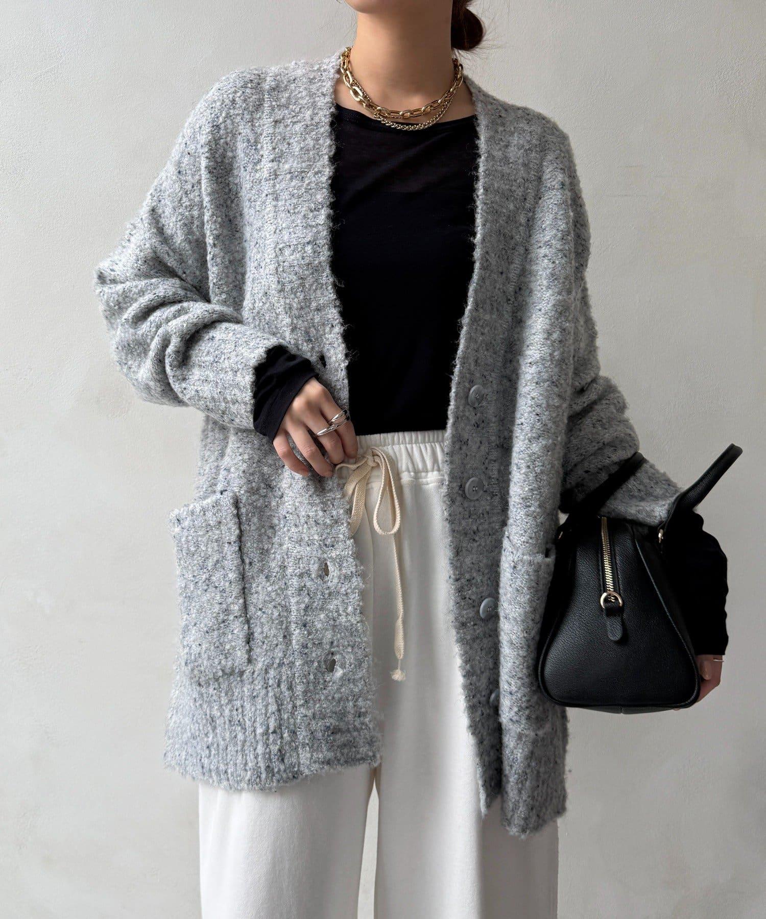 這款開襟羊毛衫上散落著五顏六色的棉結。