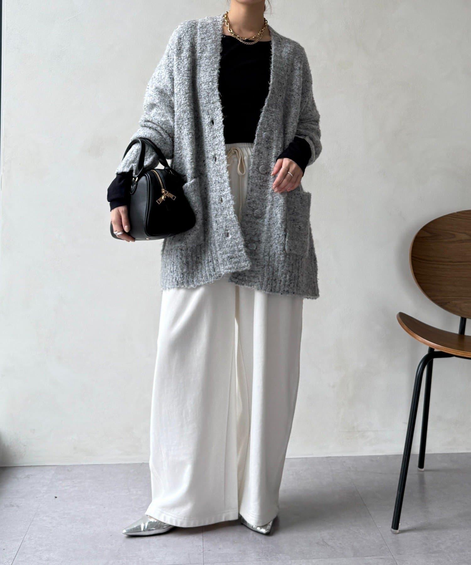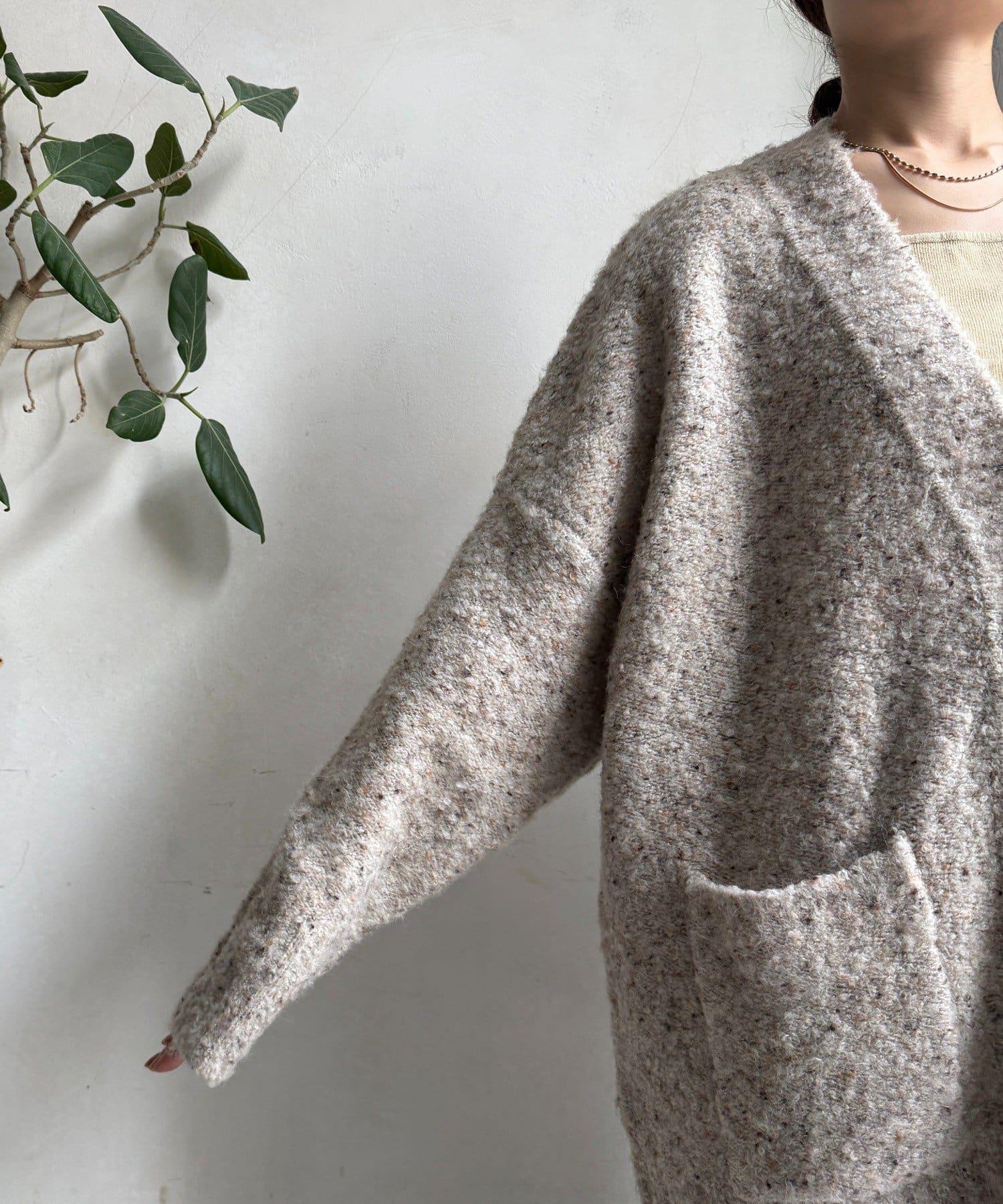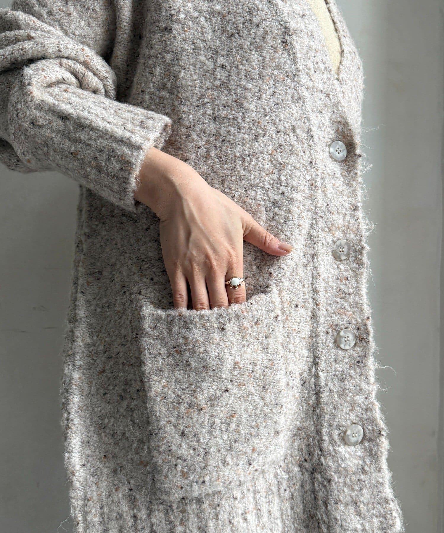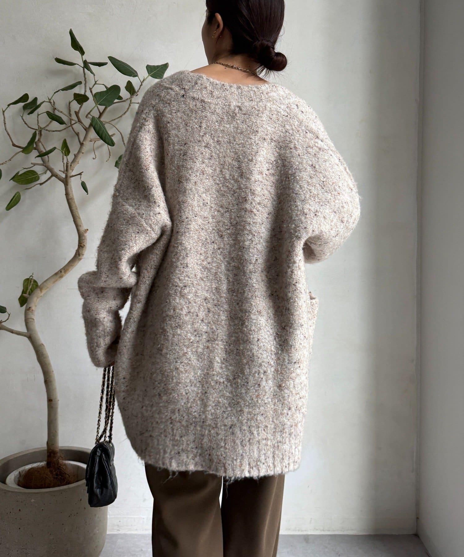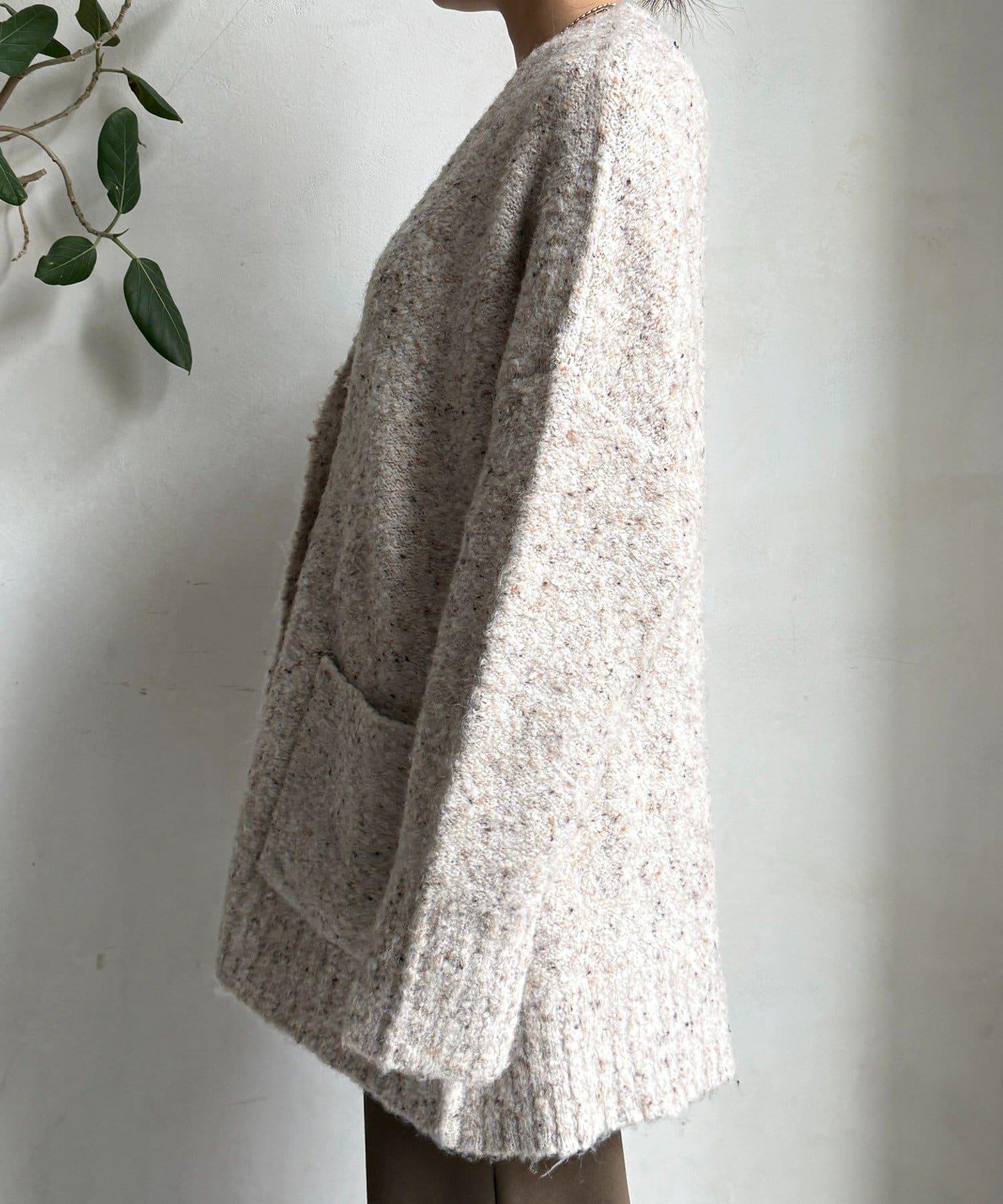 這款開襟羊毛衫上散落著五顏六色的棉結。