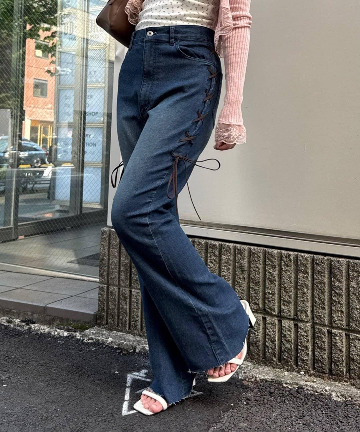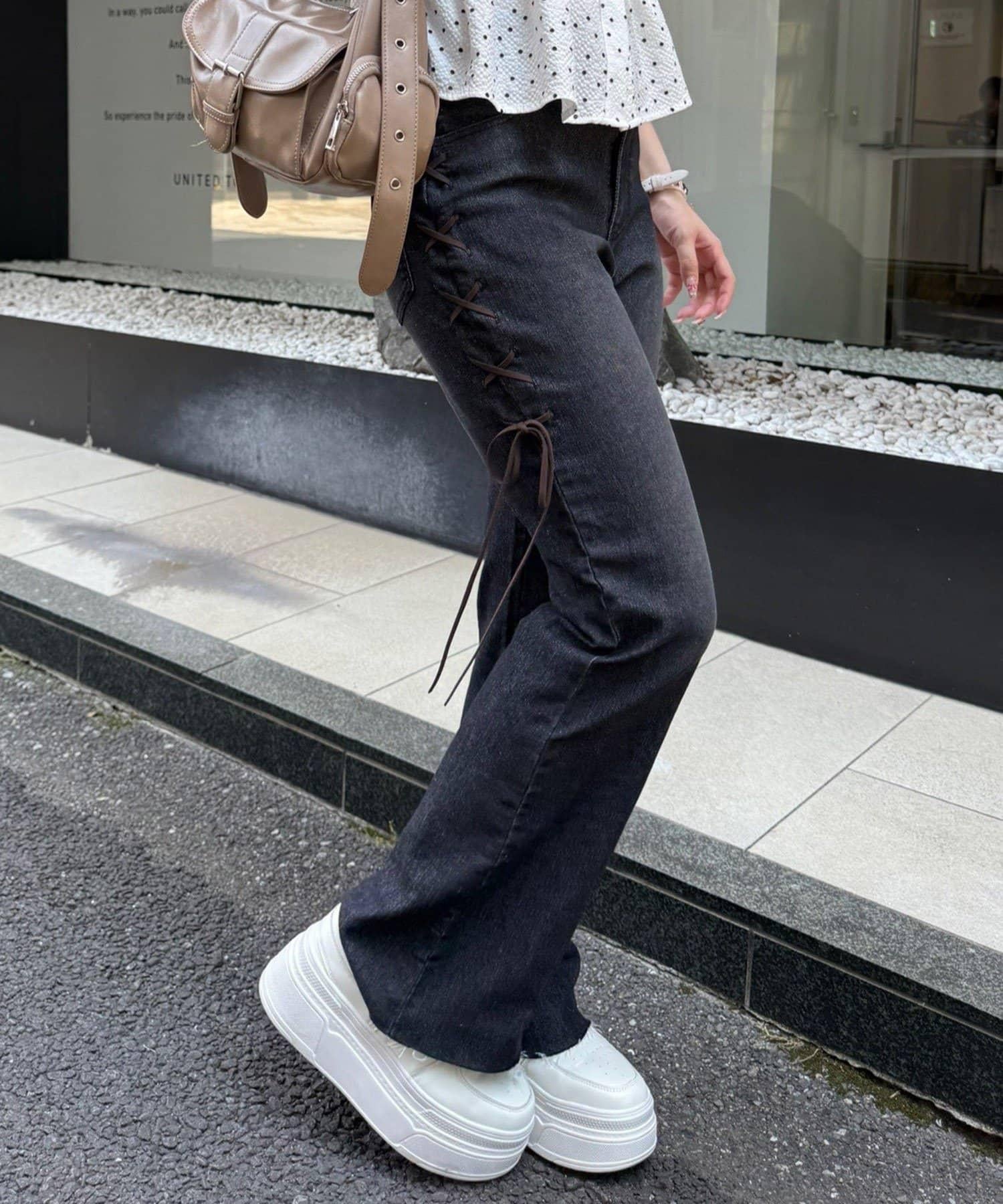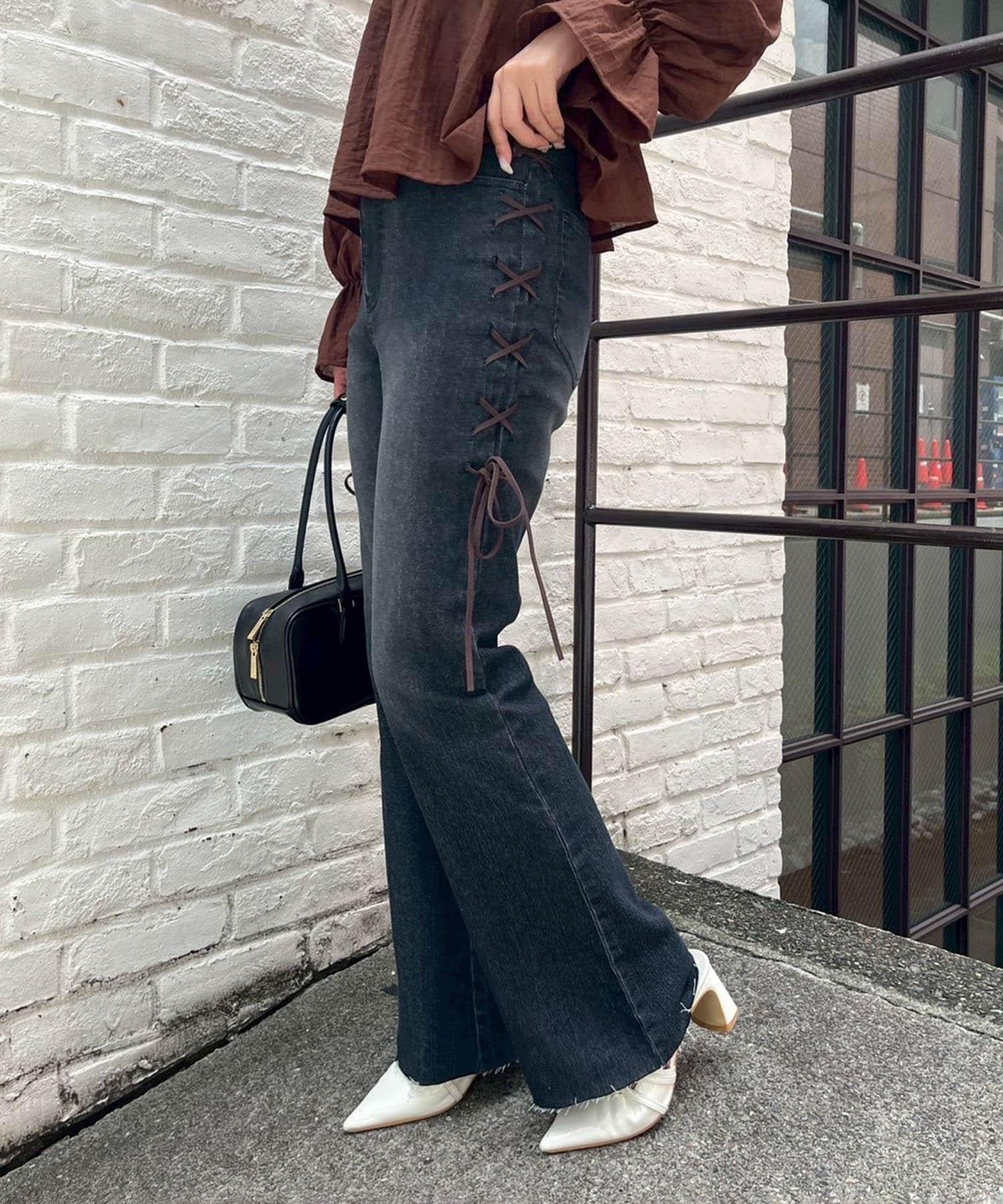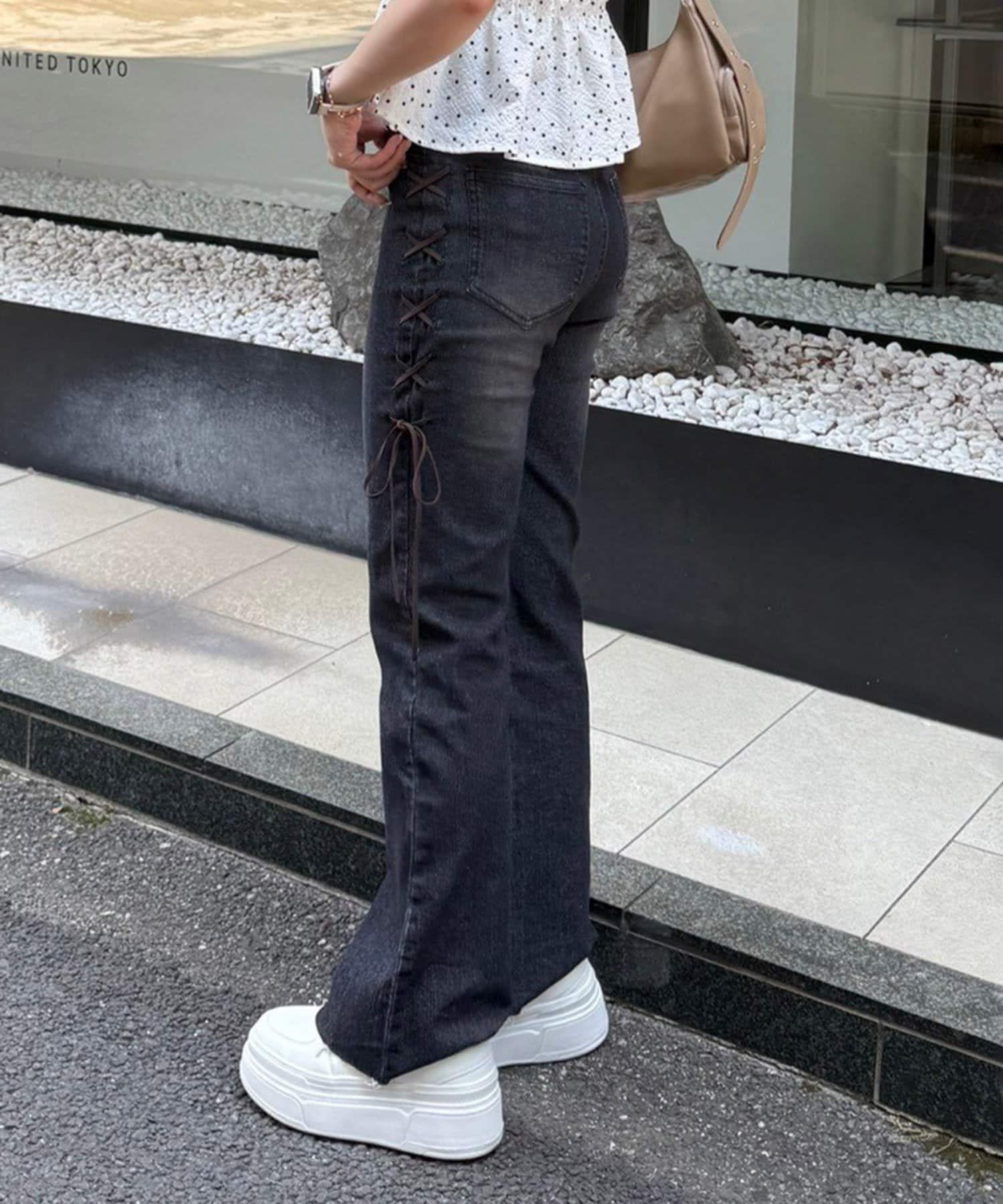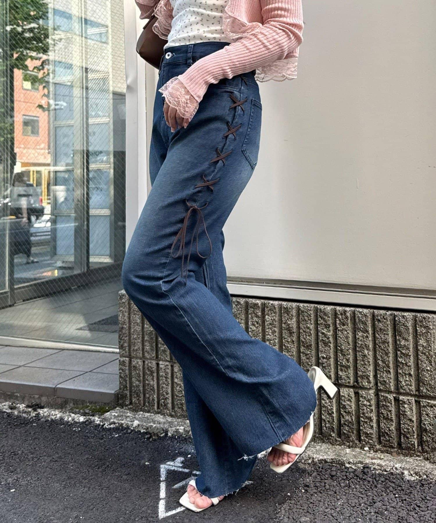喇叭形牛仔褲,兩條大腿兩側均有繫帶設計。
