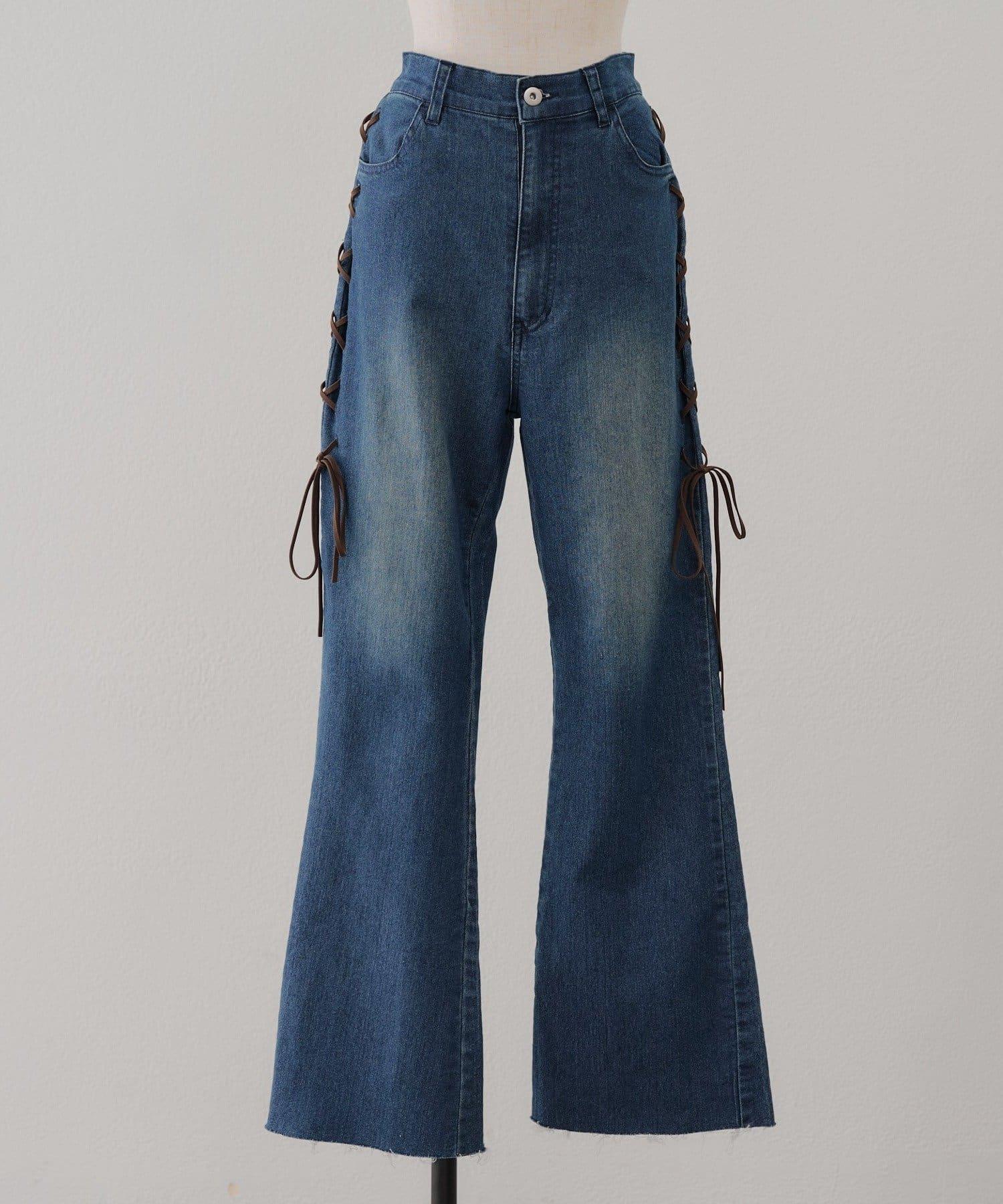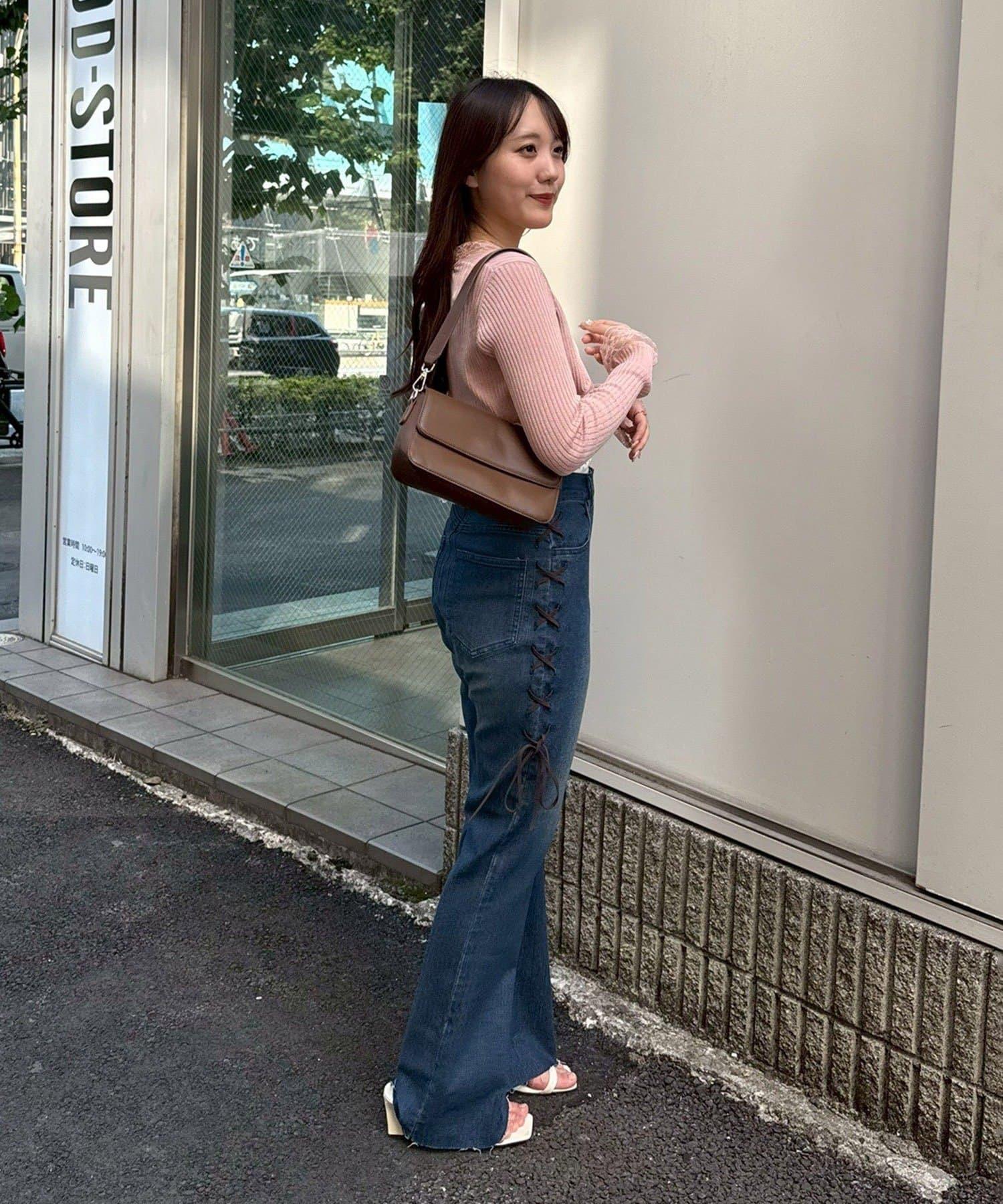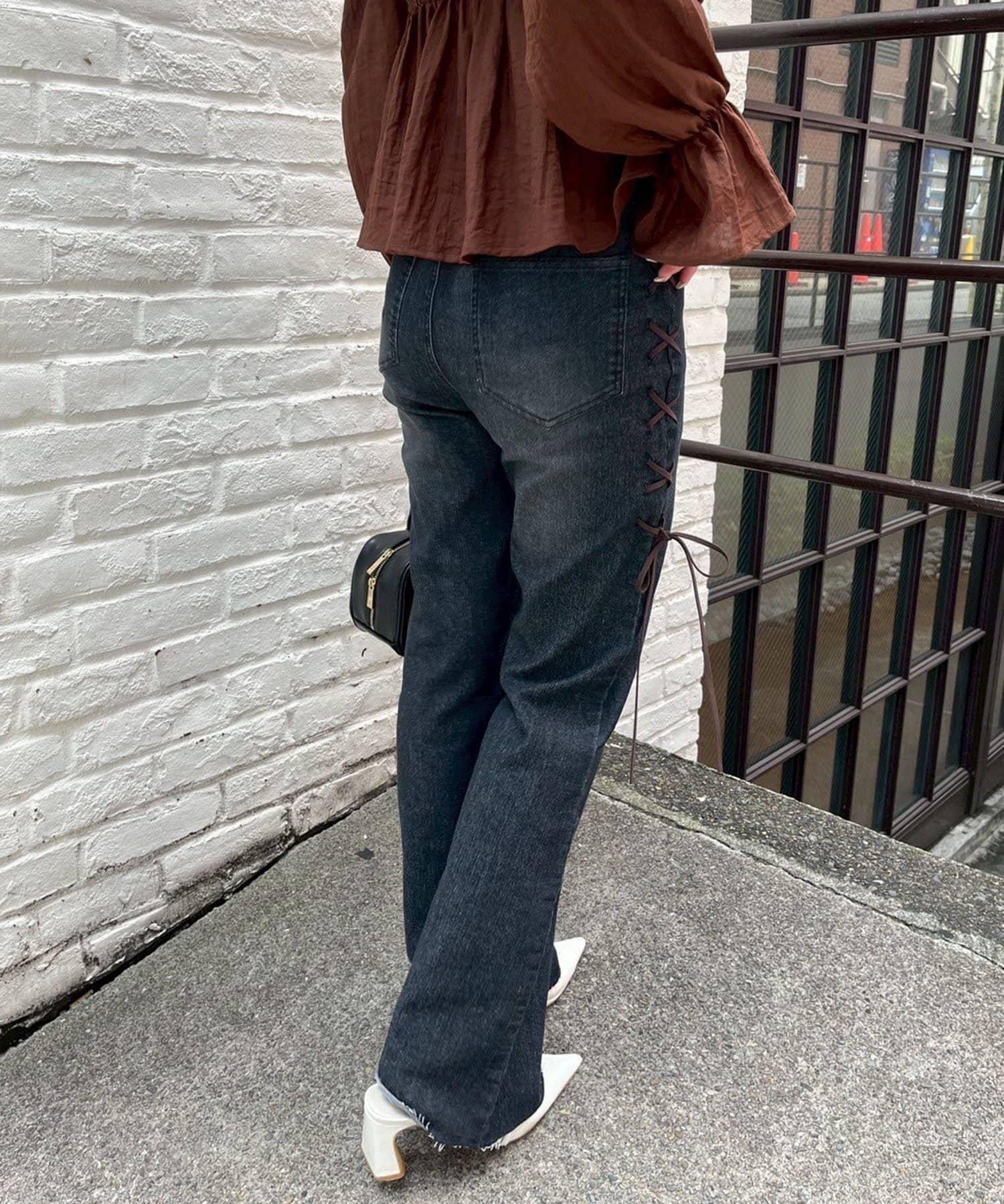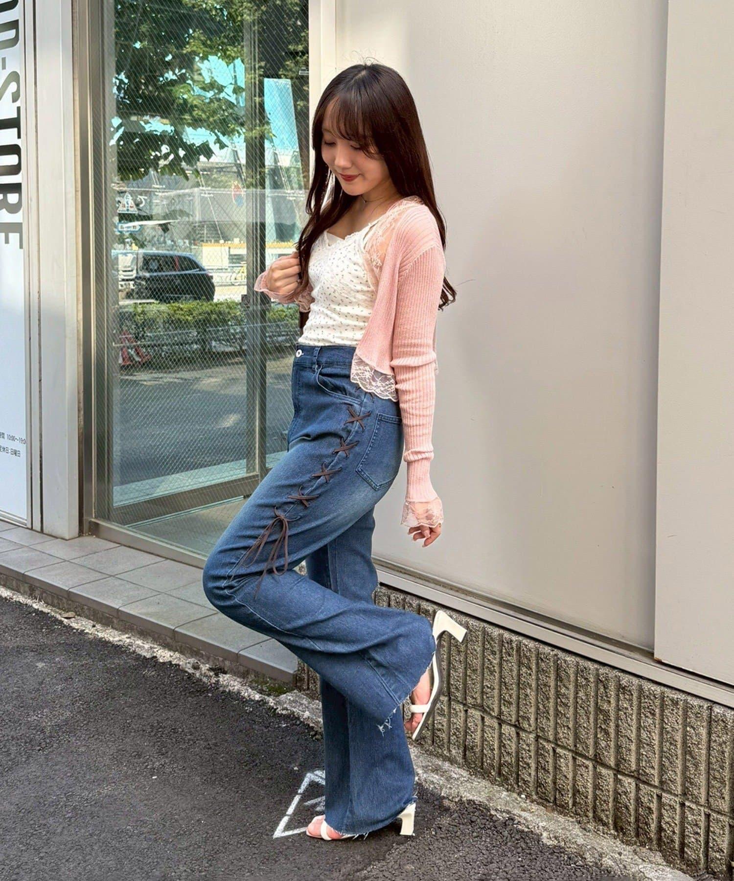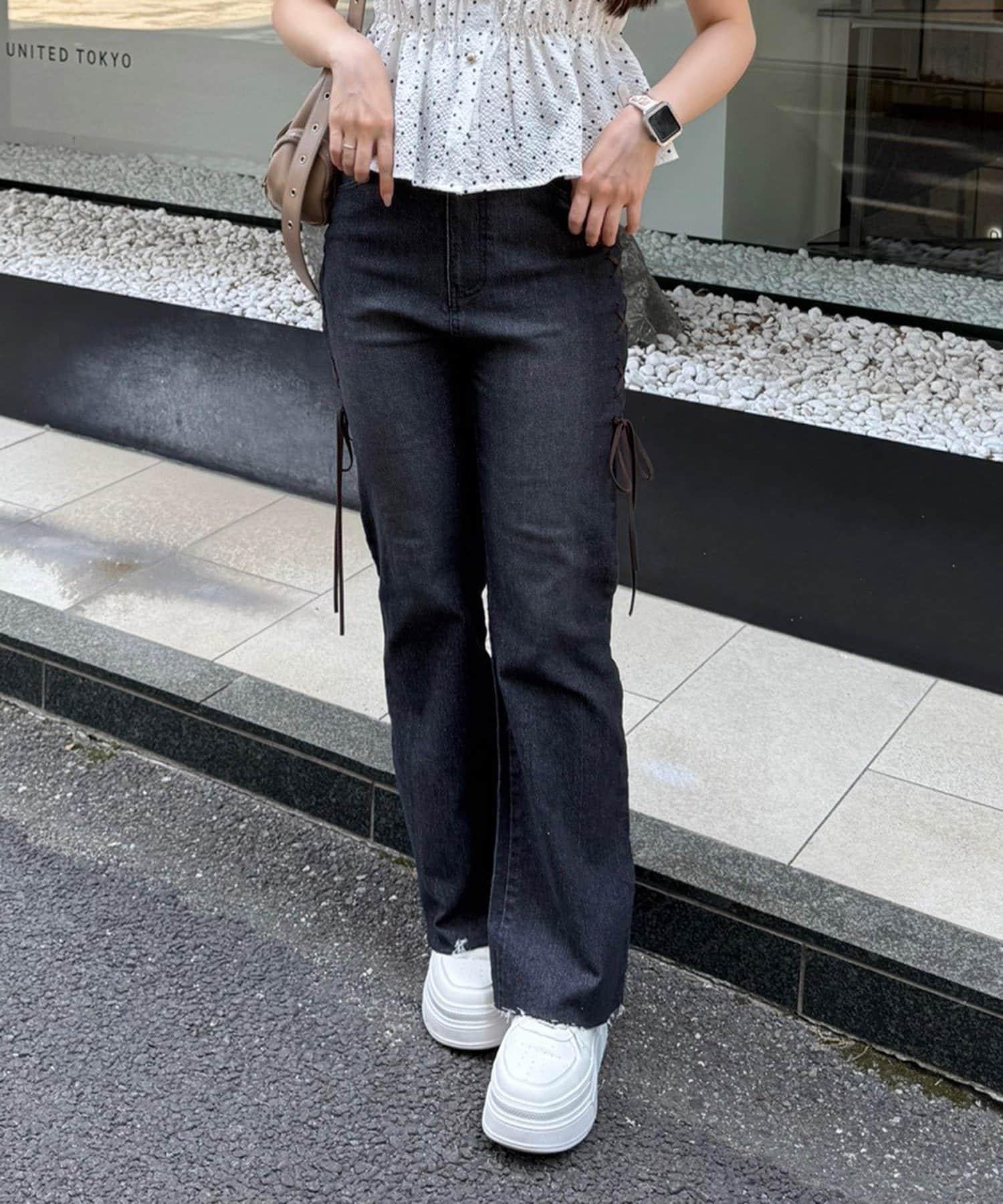 喇叭形牛仔褲,兩條大腿兩側均有繫帶設計。