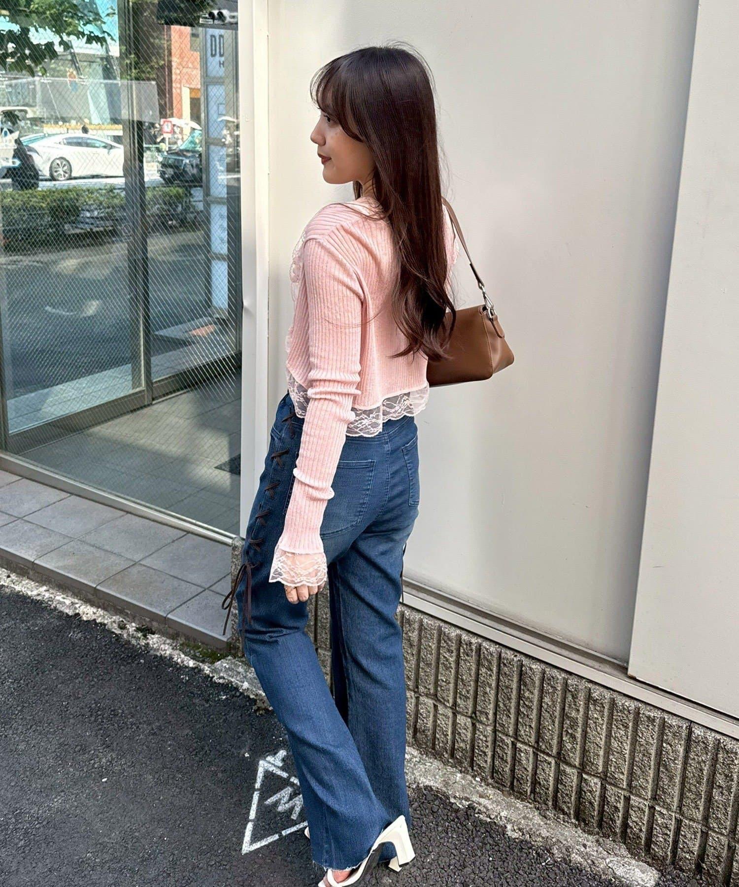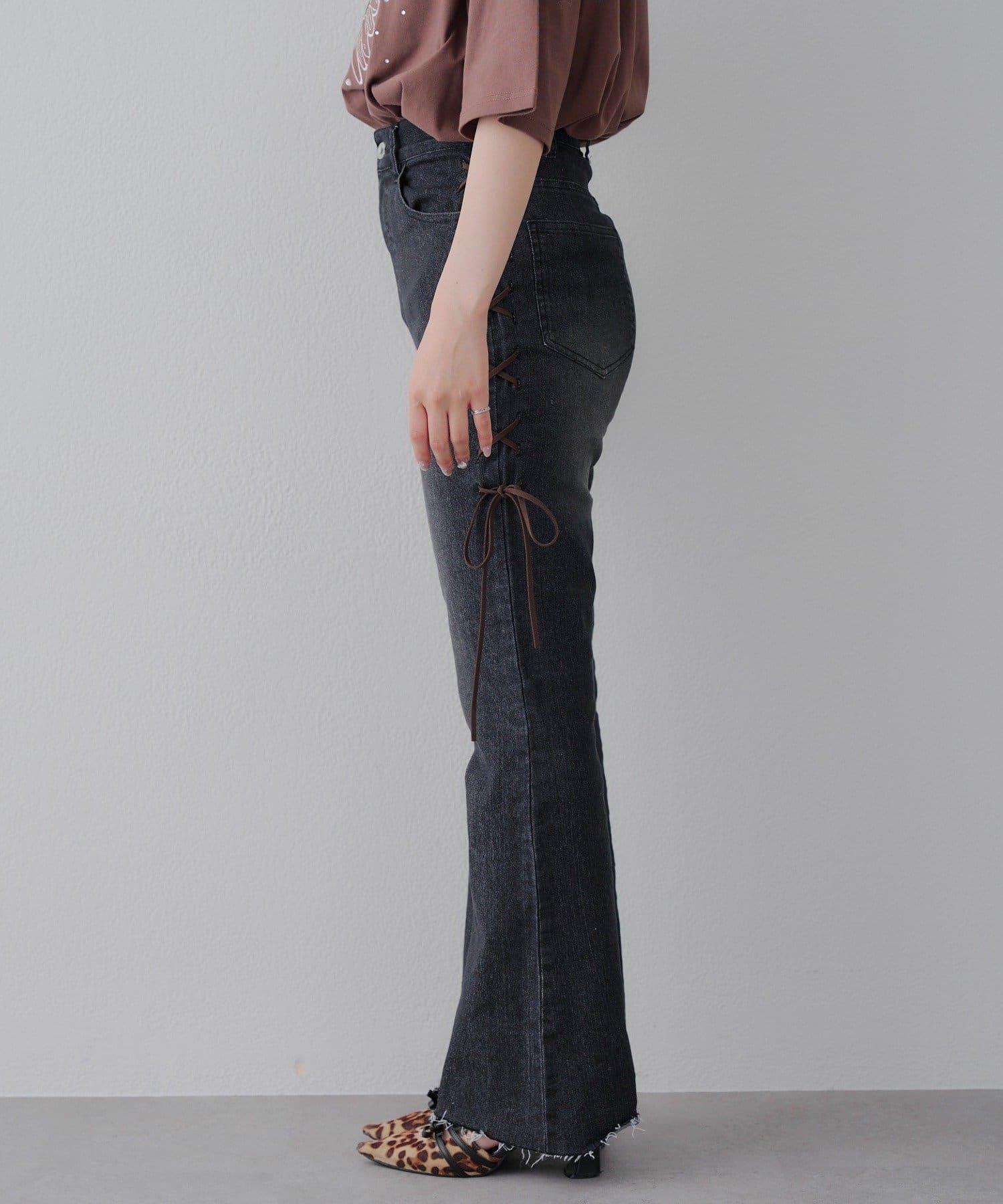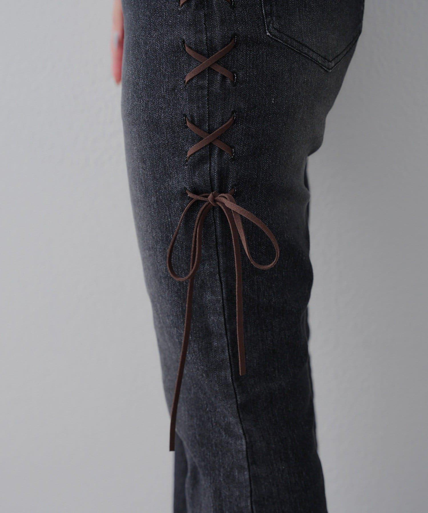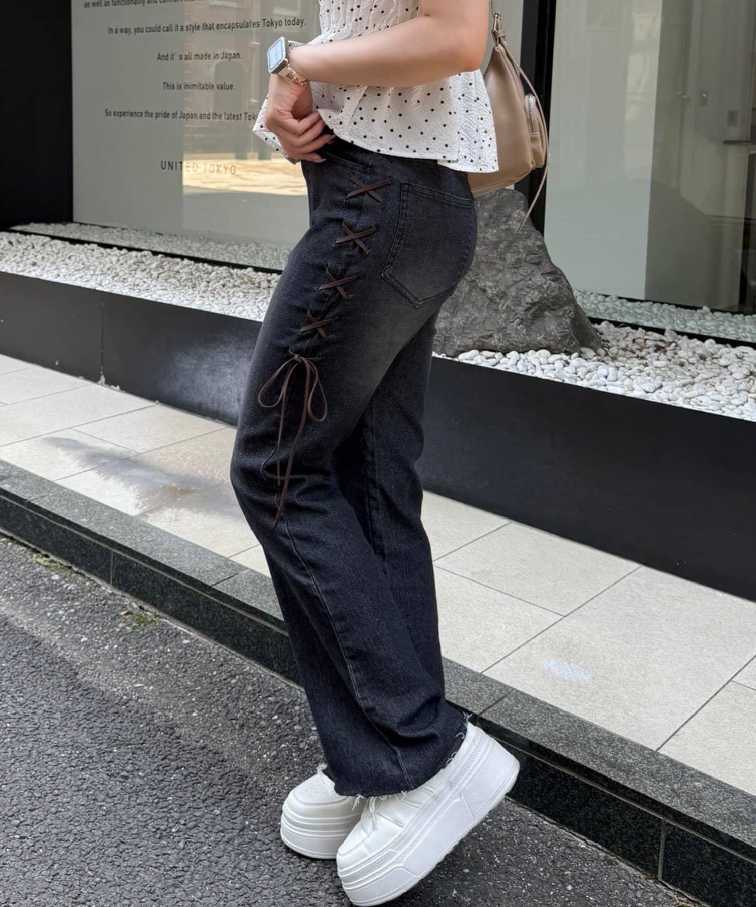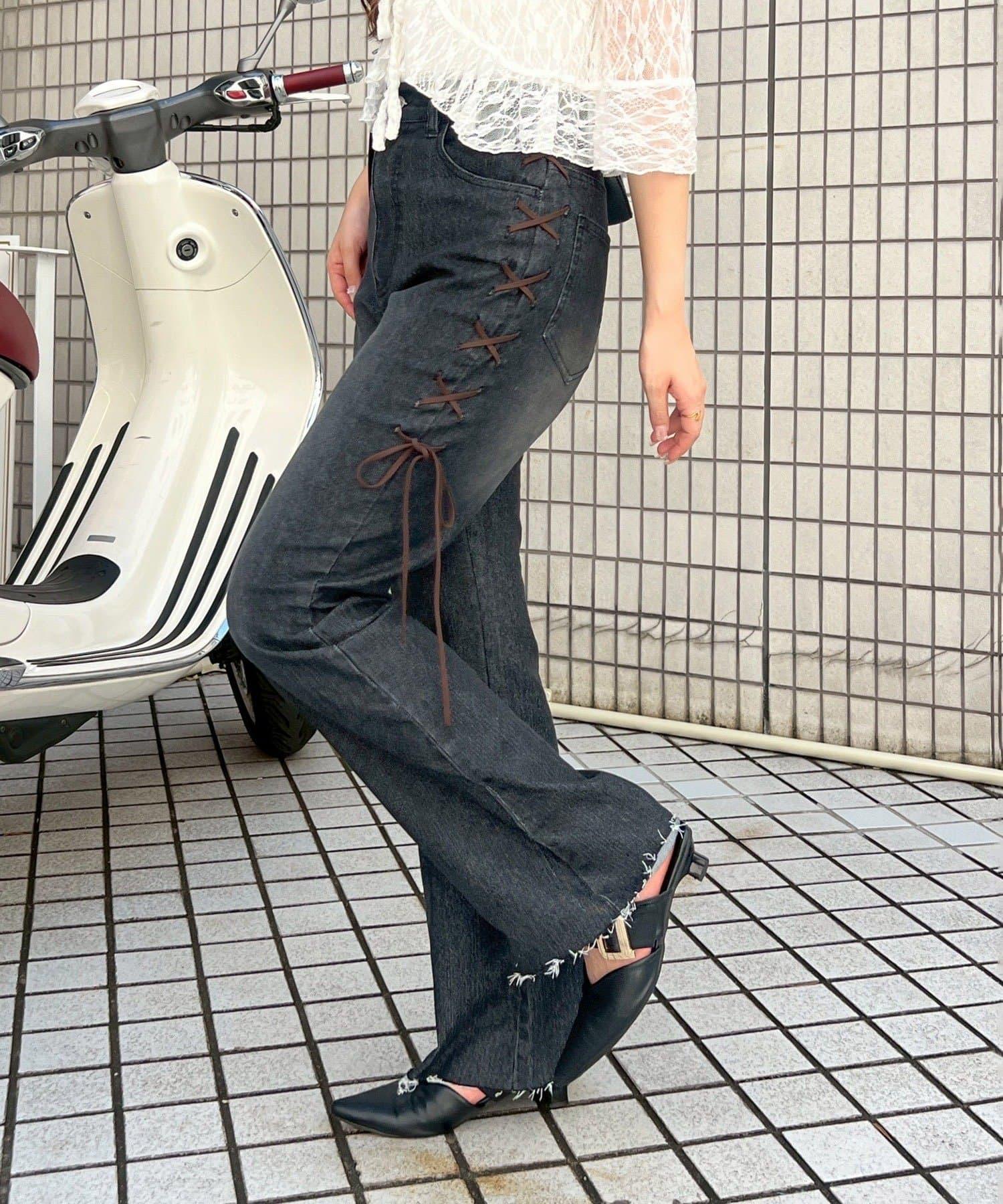 喇叭形牛仔褲,兩條大腿兩側均有繫帶設計。