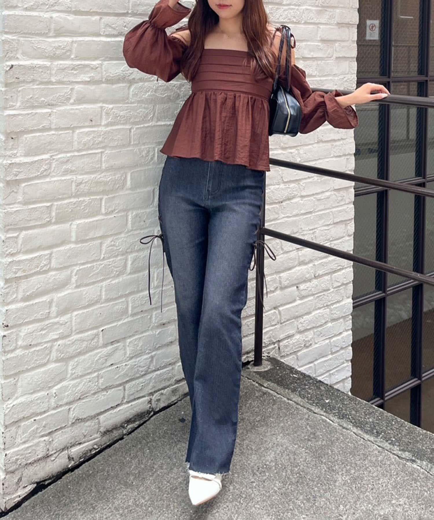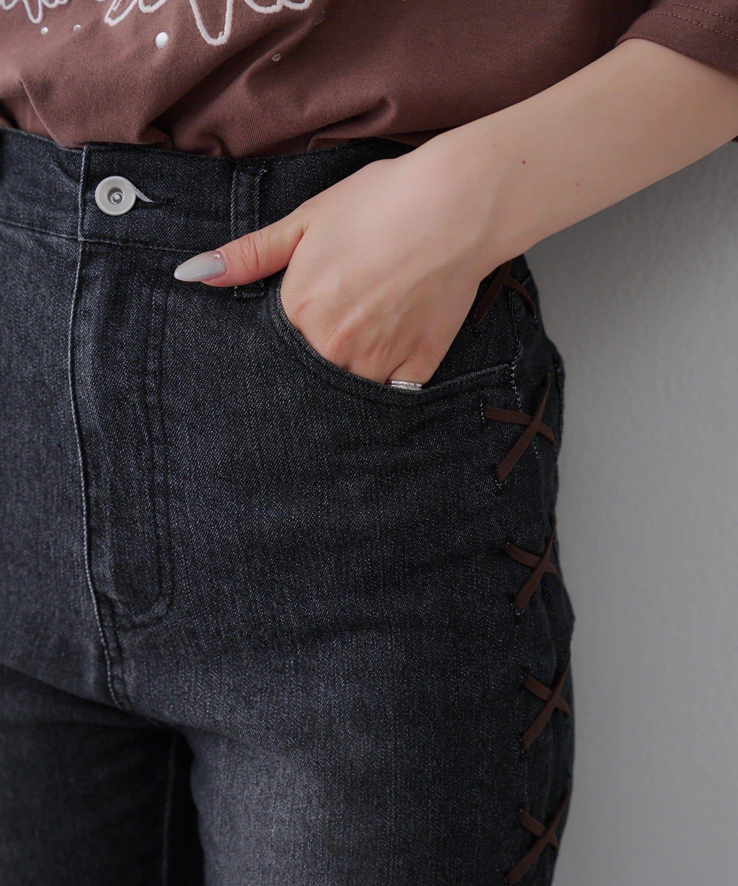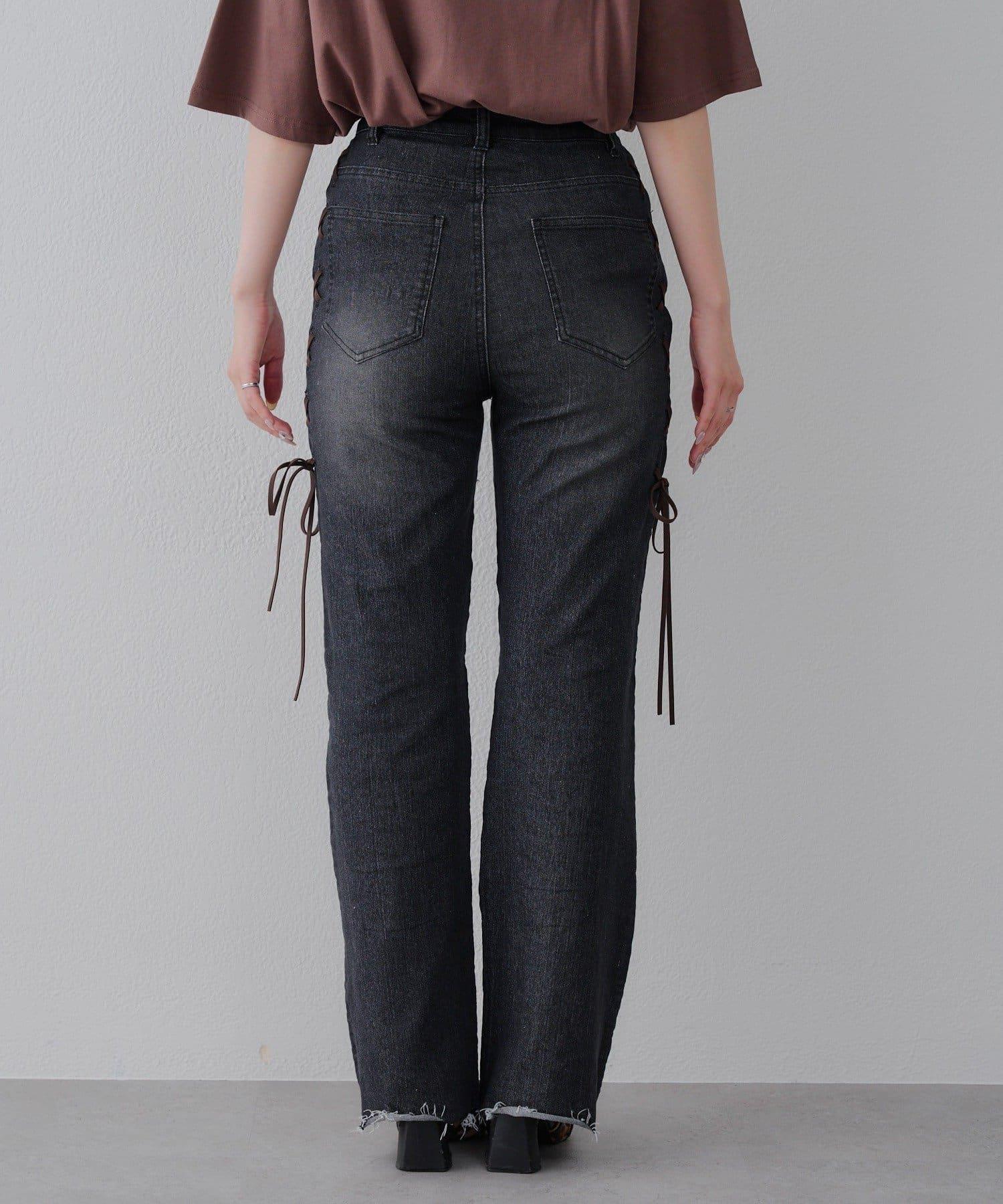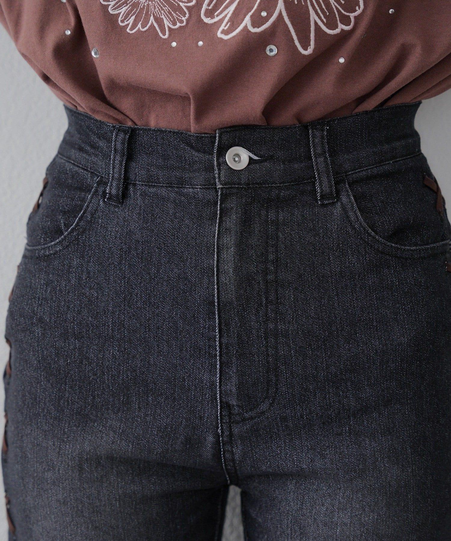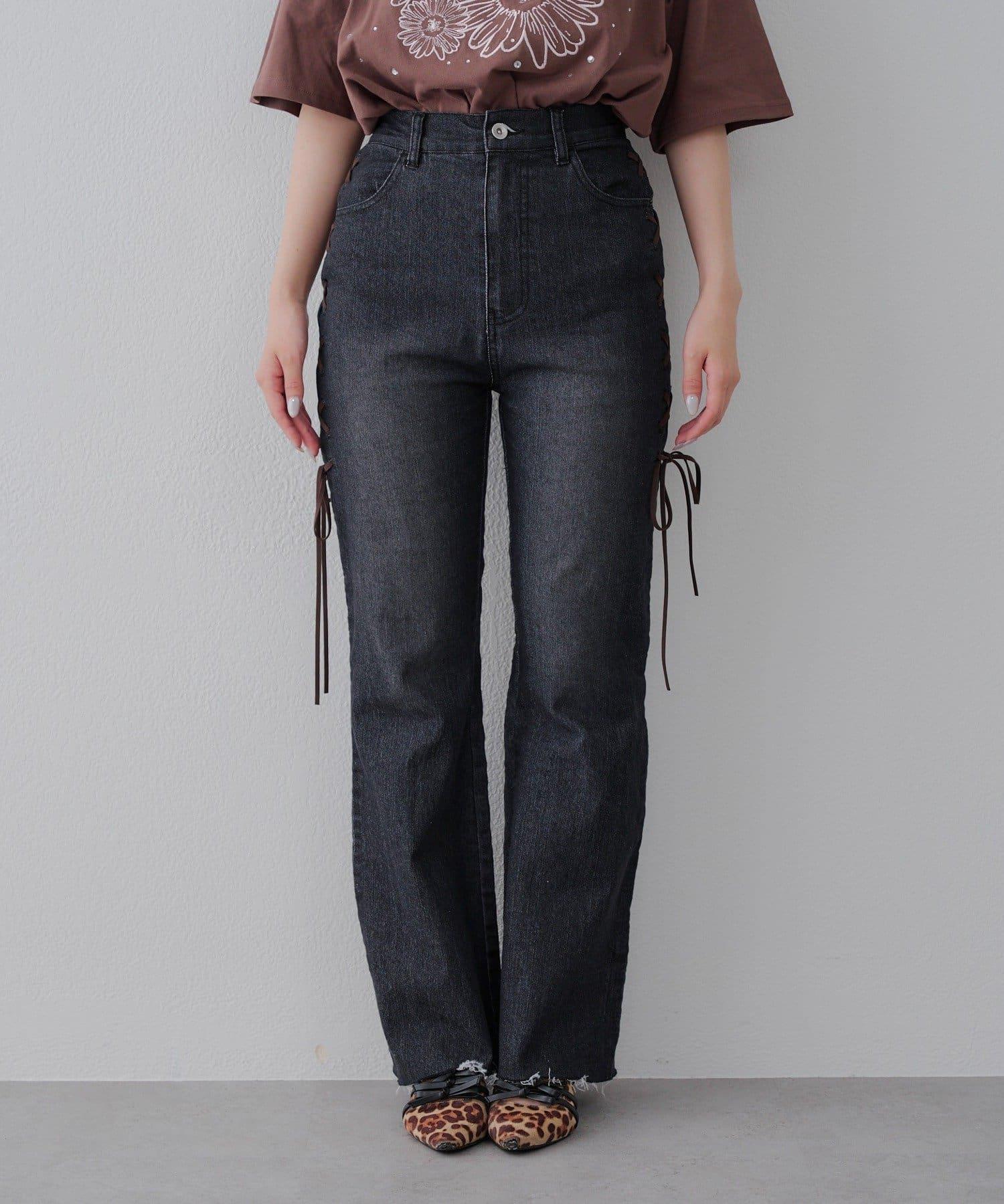 喇叭形牛仔褲,兩條大腿兩側均有繫帶設計。