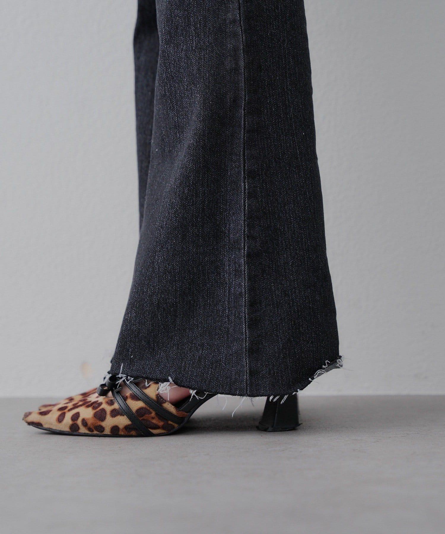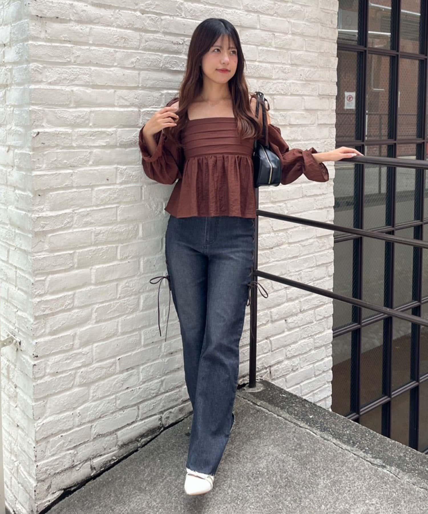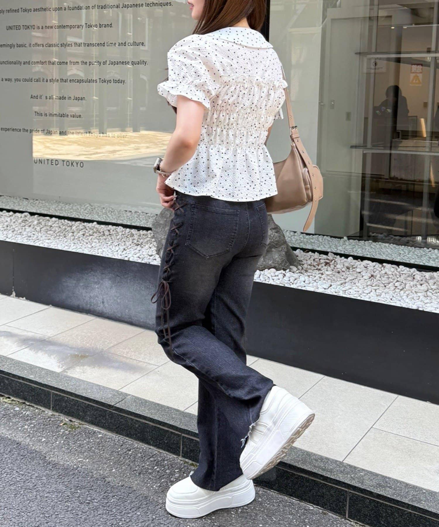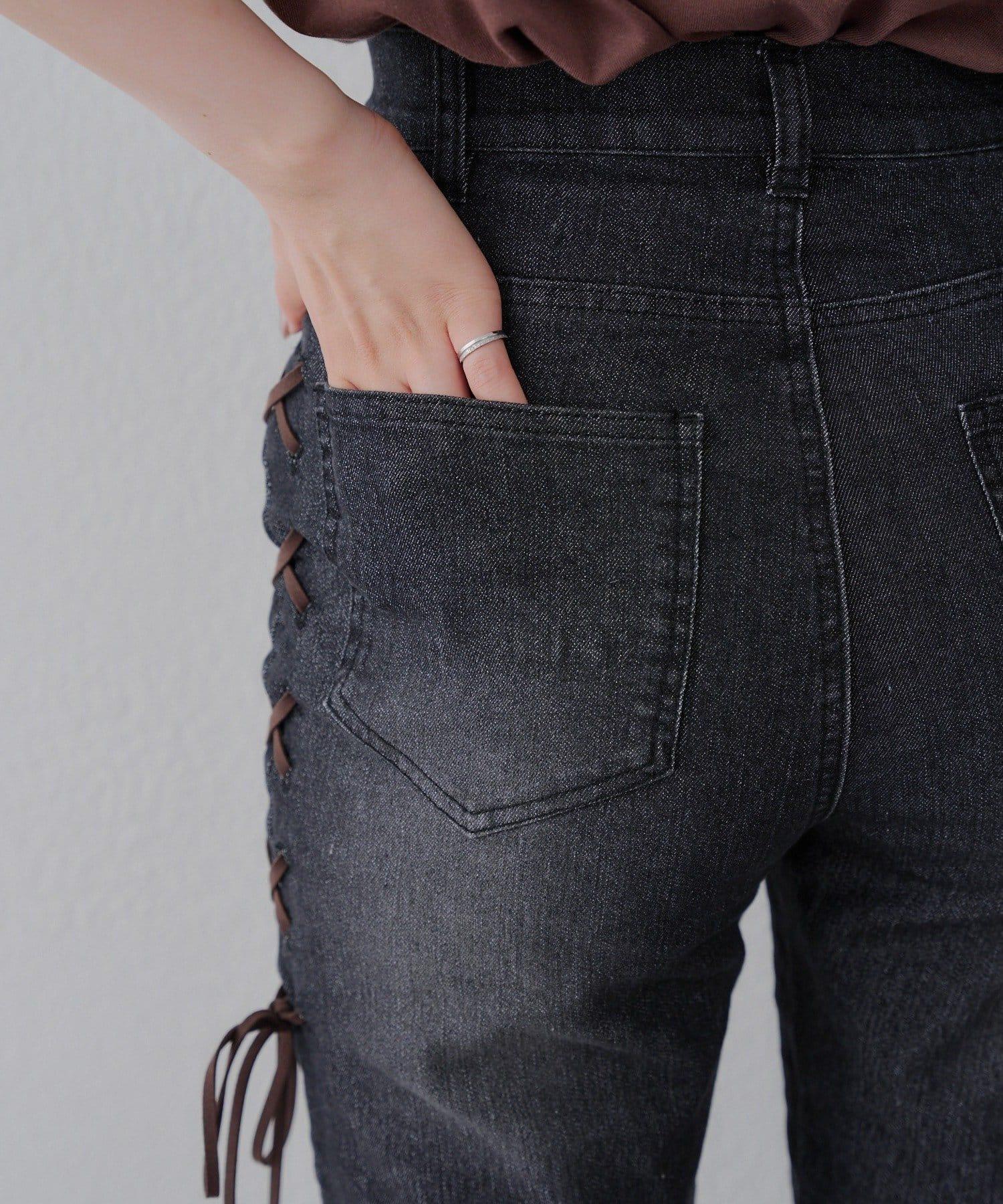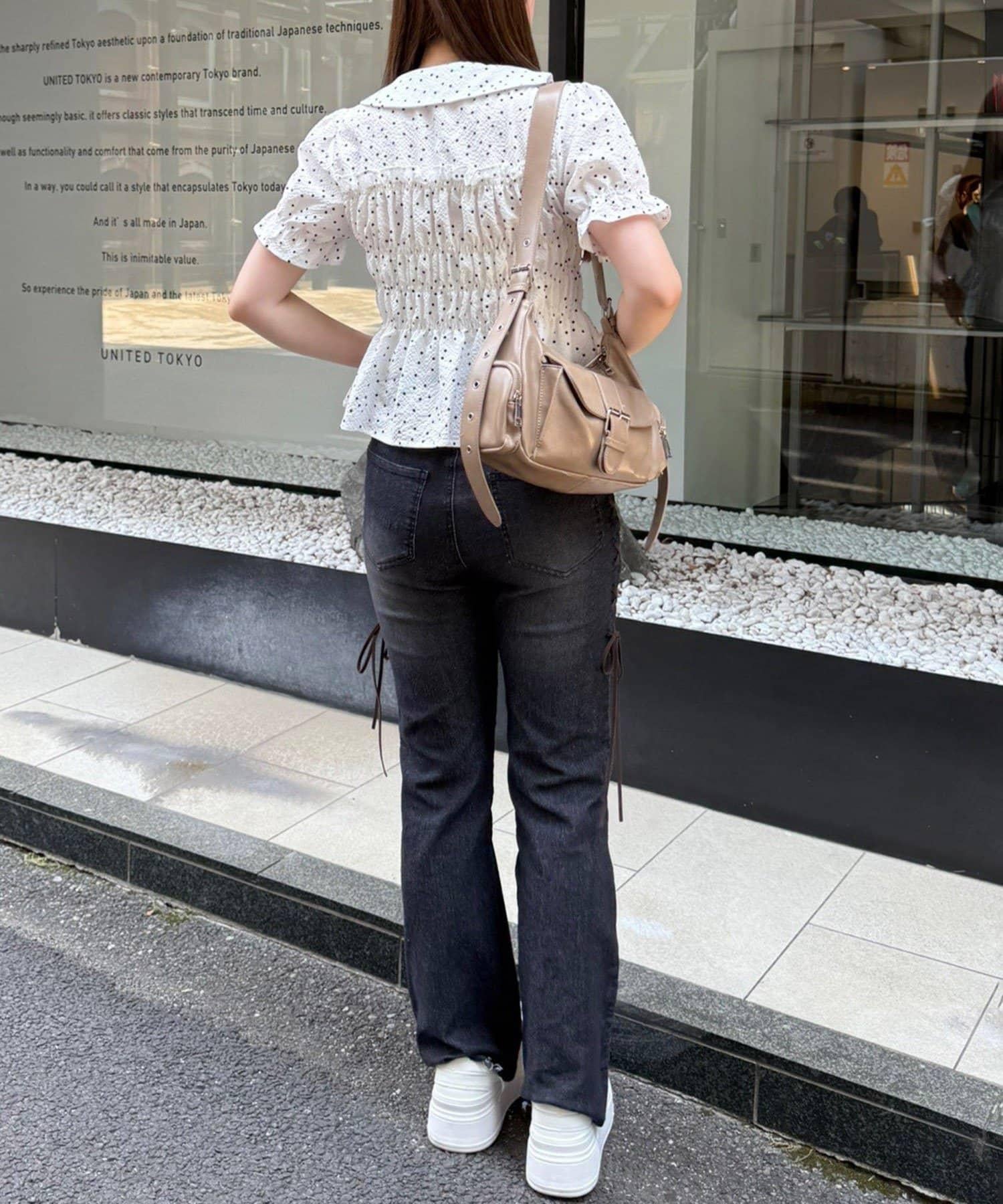 喇叭形牛仔褲,兩條大腿兩側均有繫帶設計。