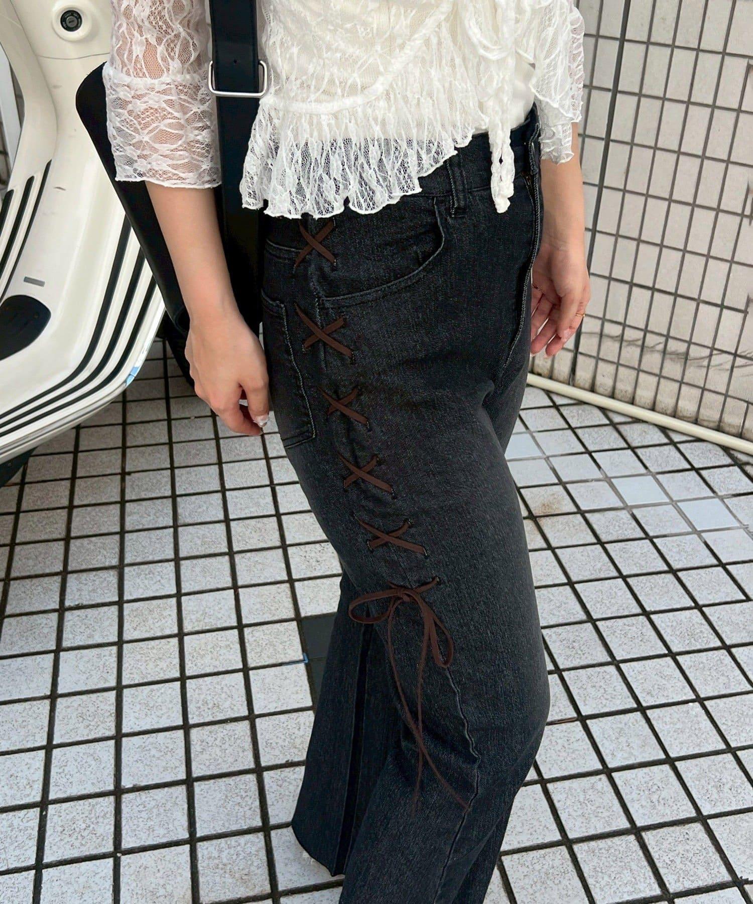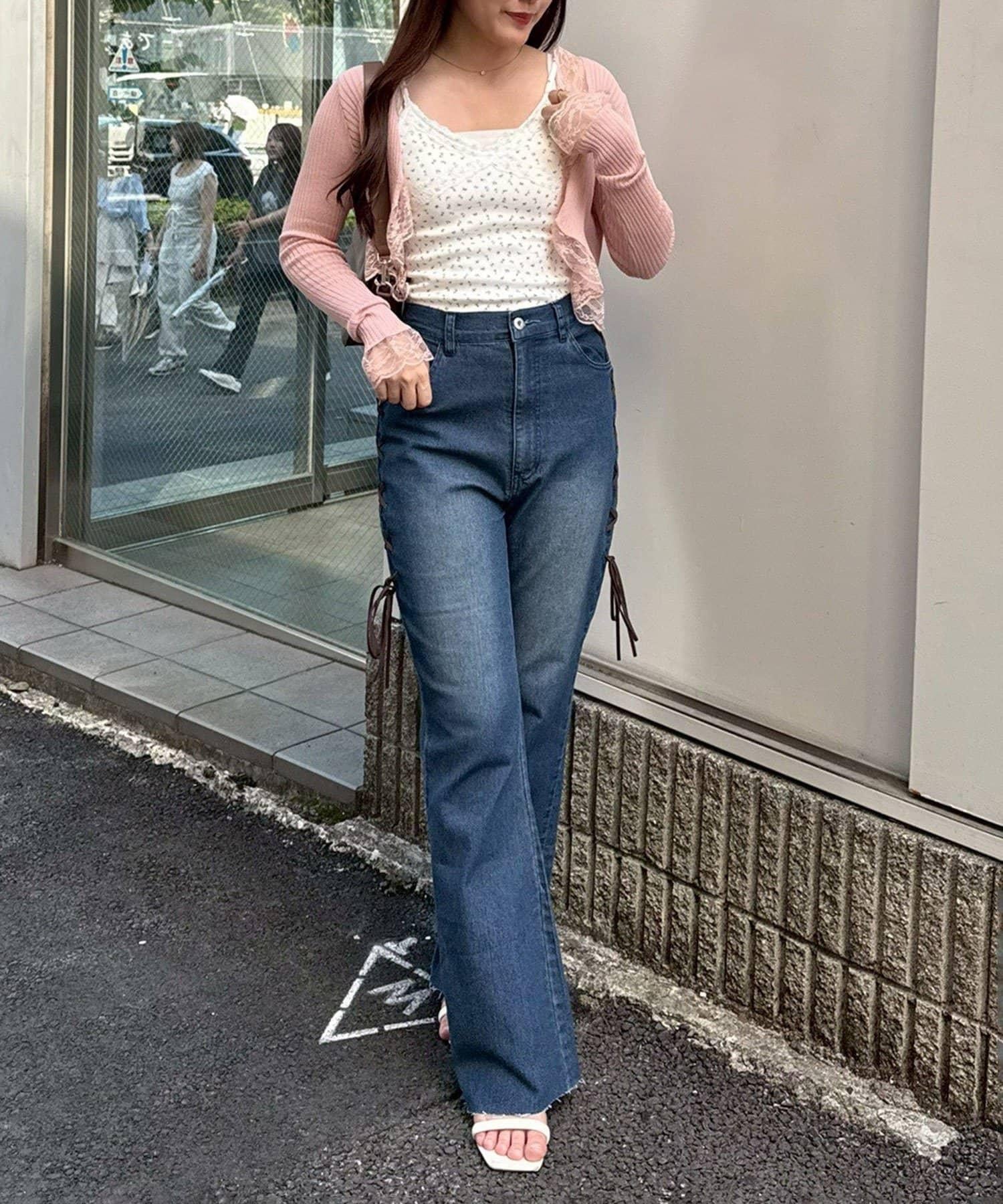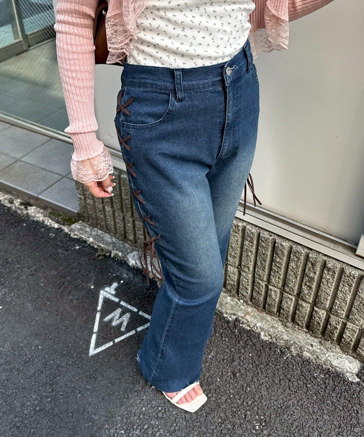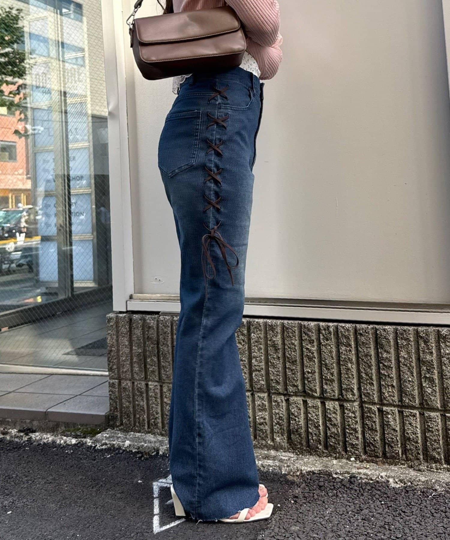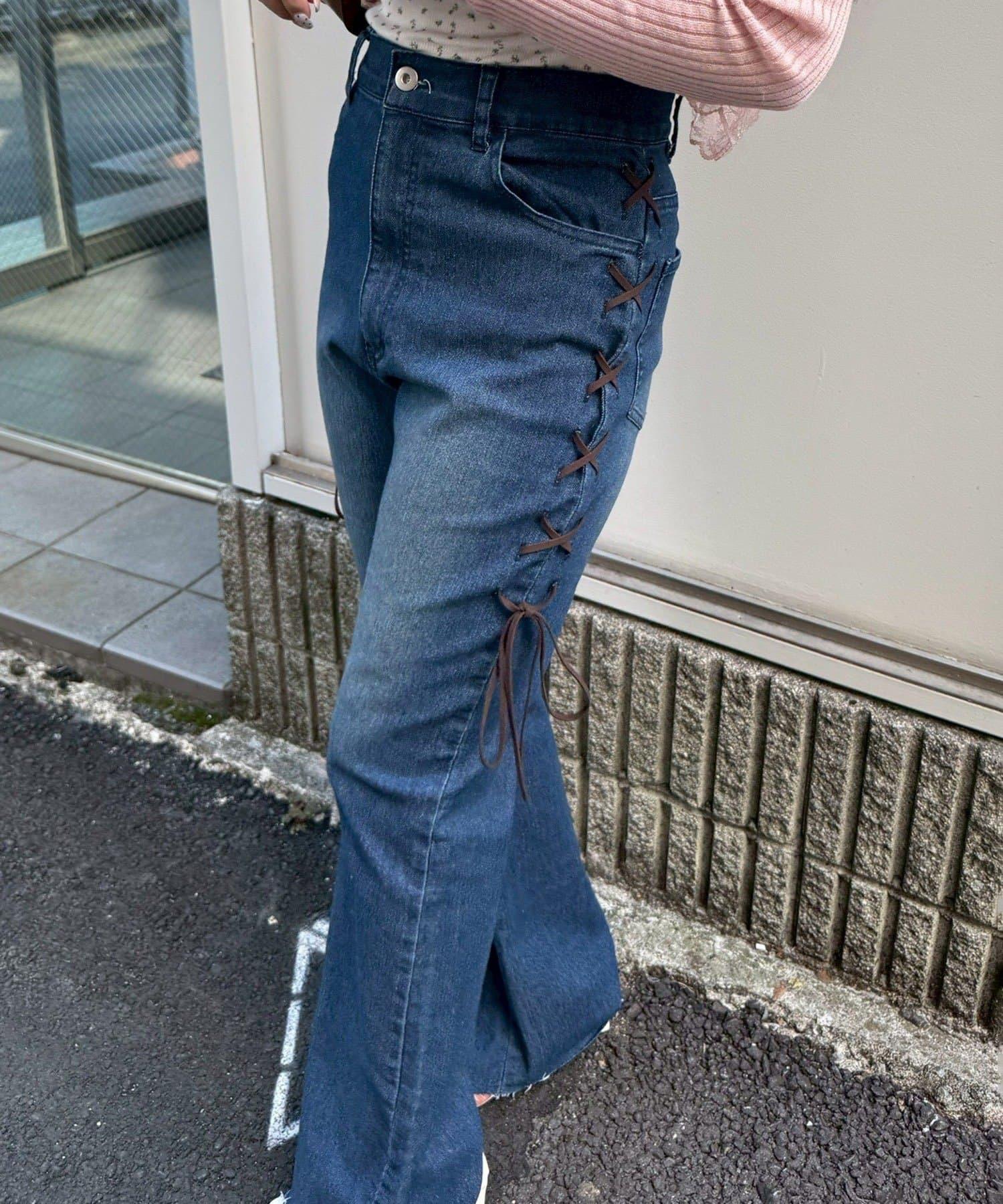【可甜美穿搭的牛仔褲!】側邊繫帶喇叭褲