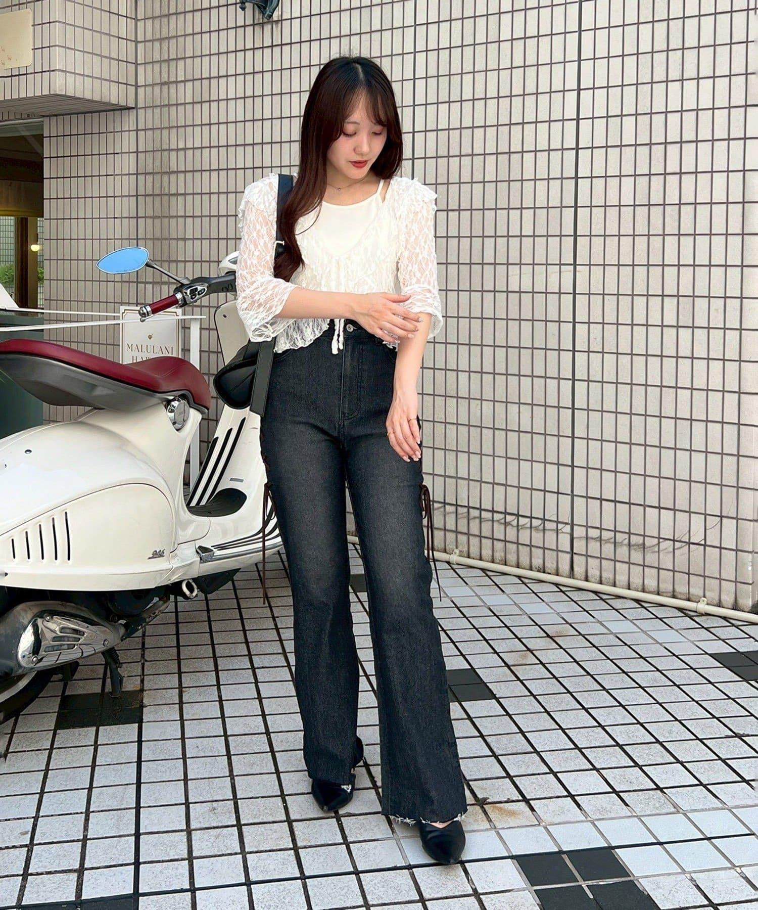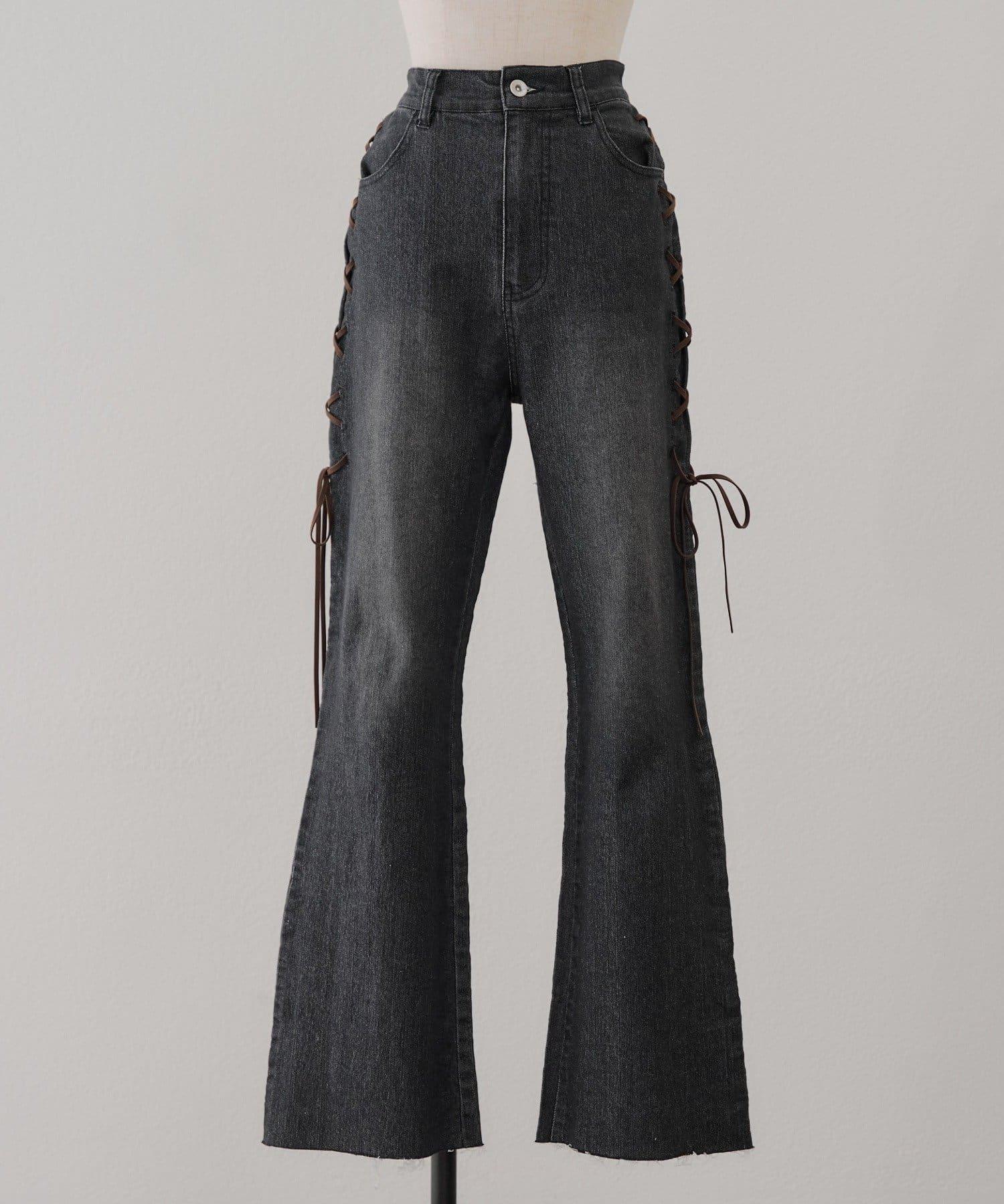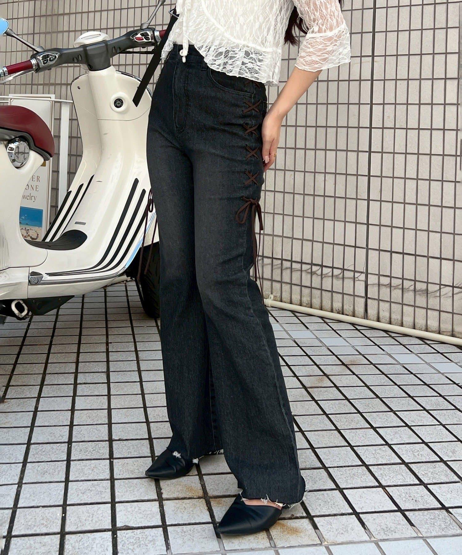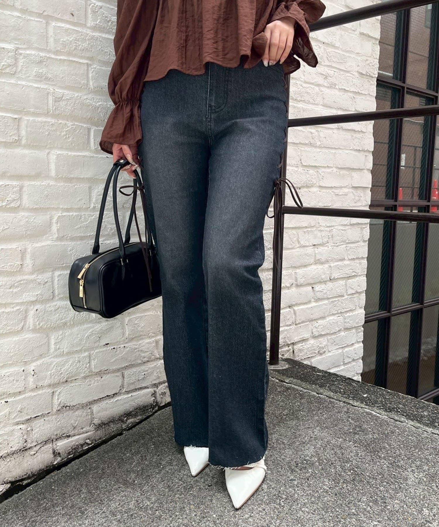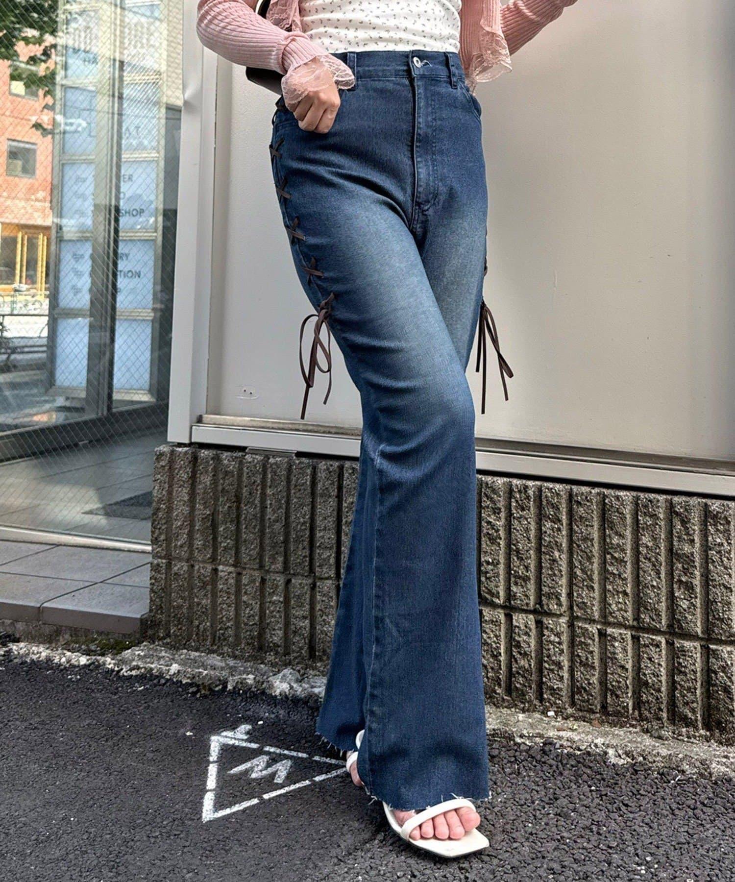 【可甜美穿搭的牛仔褲!】側邊繫帶喇叭褲