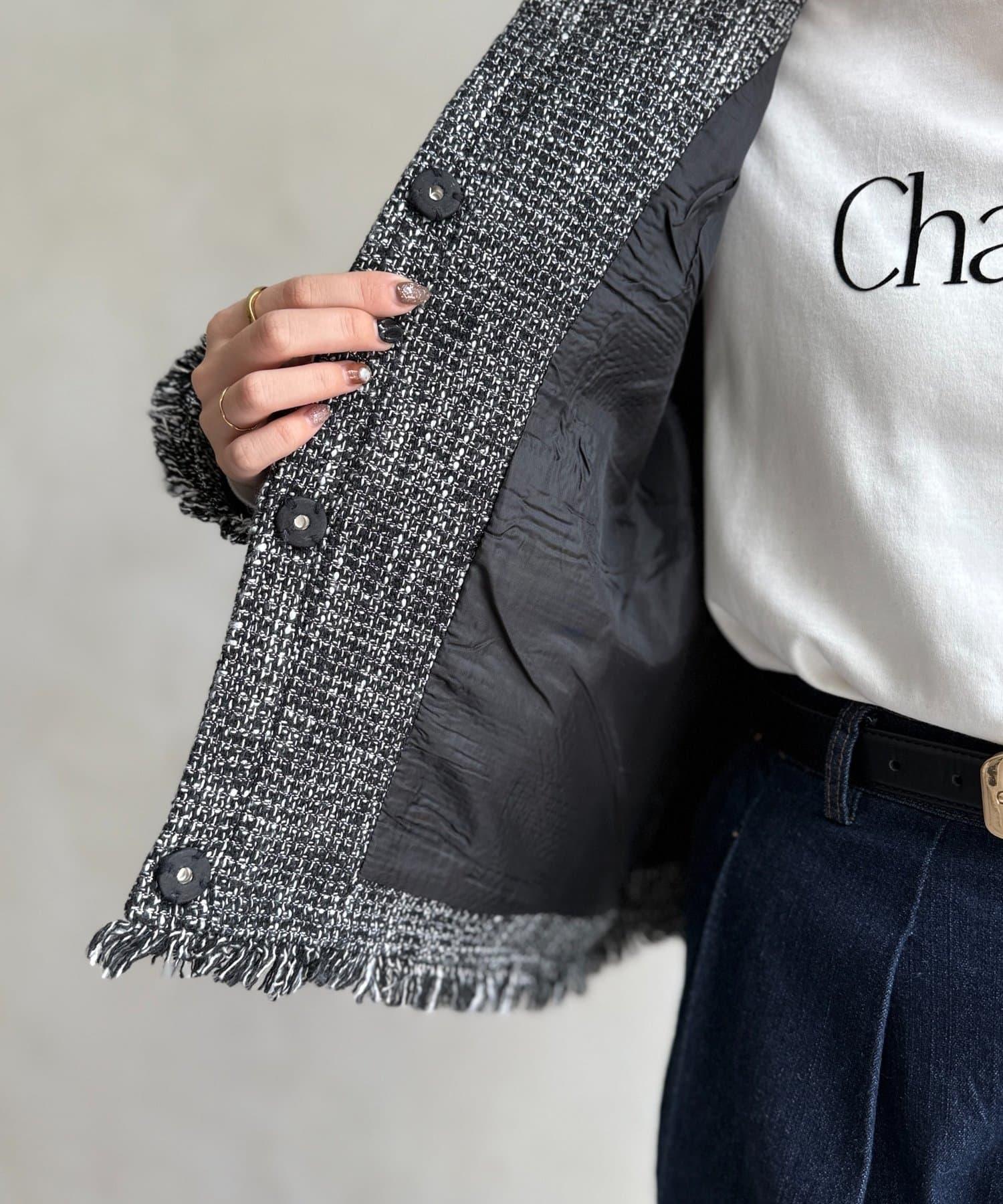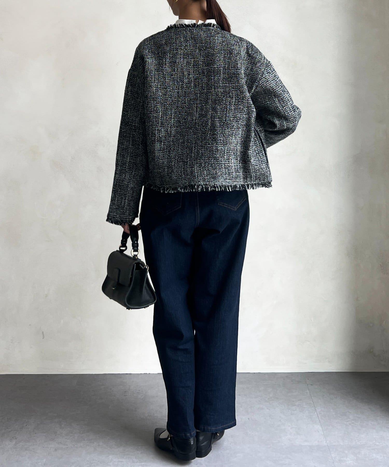 夾克長度適中,採用無領設計,給人一種乾淨利落的感覺!
