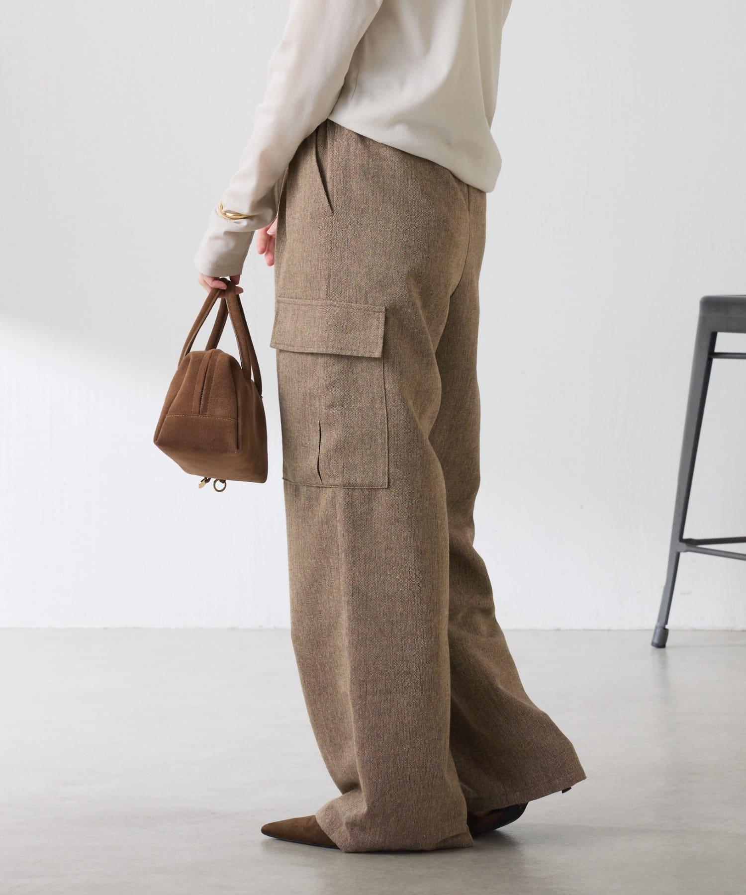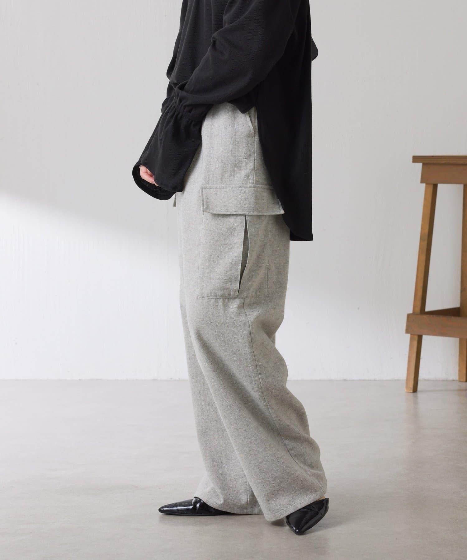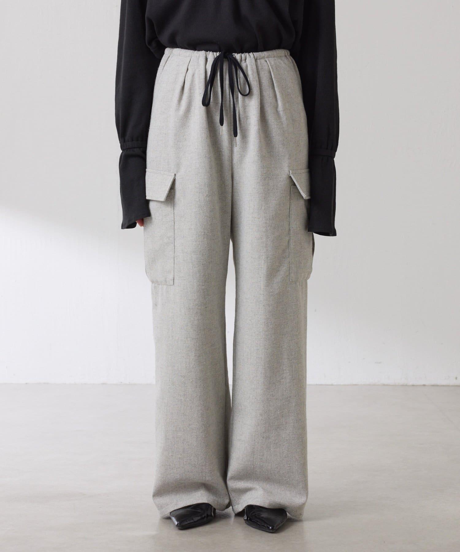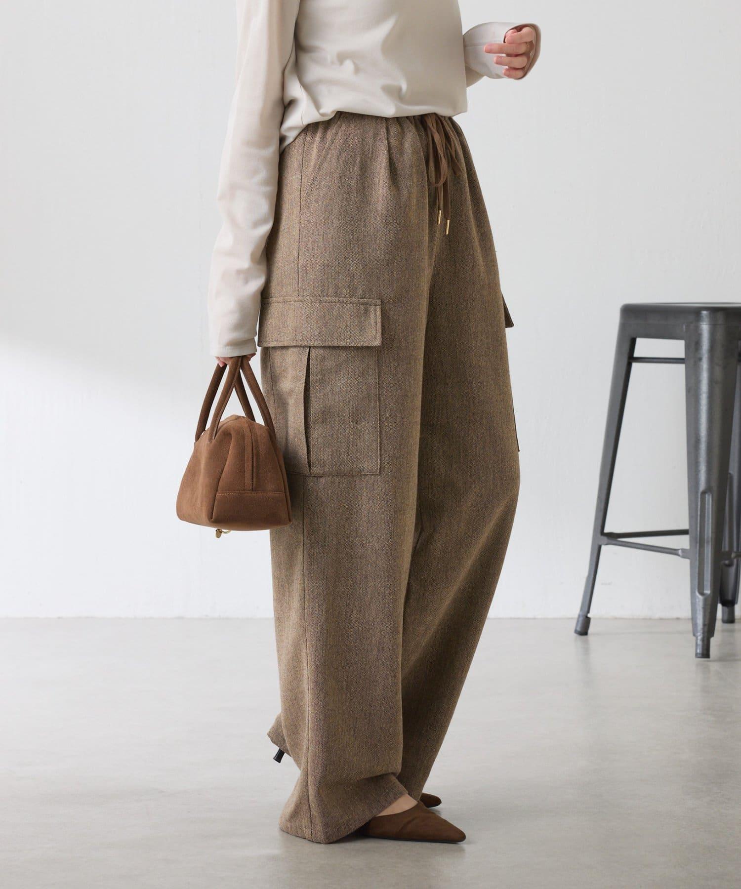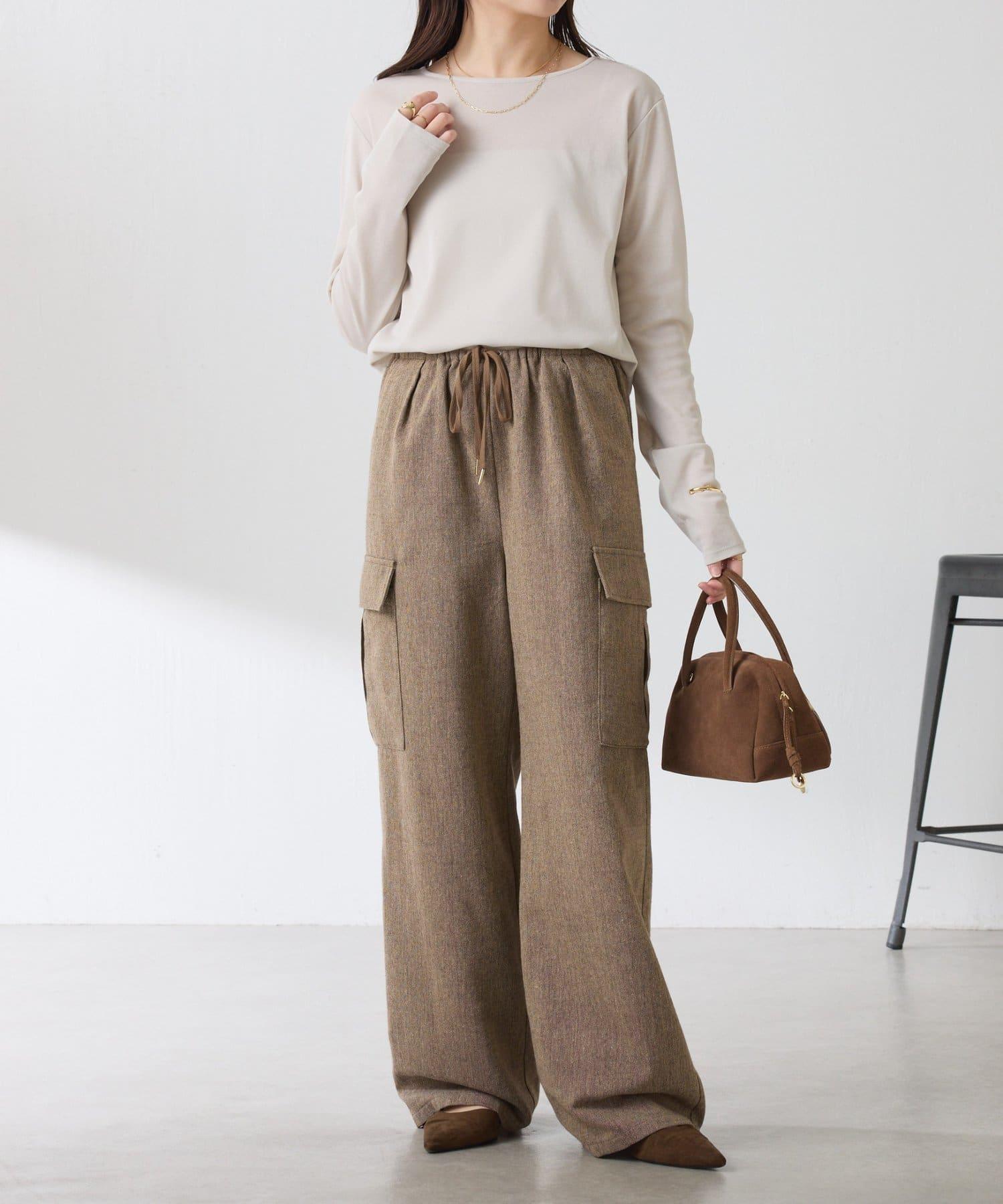 這款簡便褲子採用暖霓綸面料,帶有紗結。