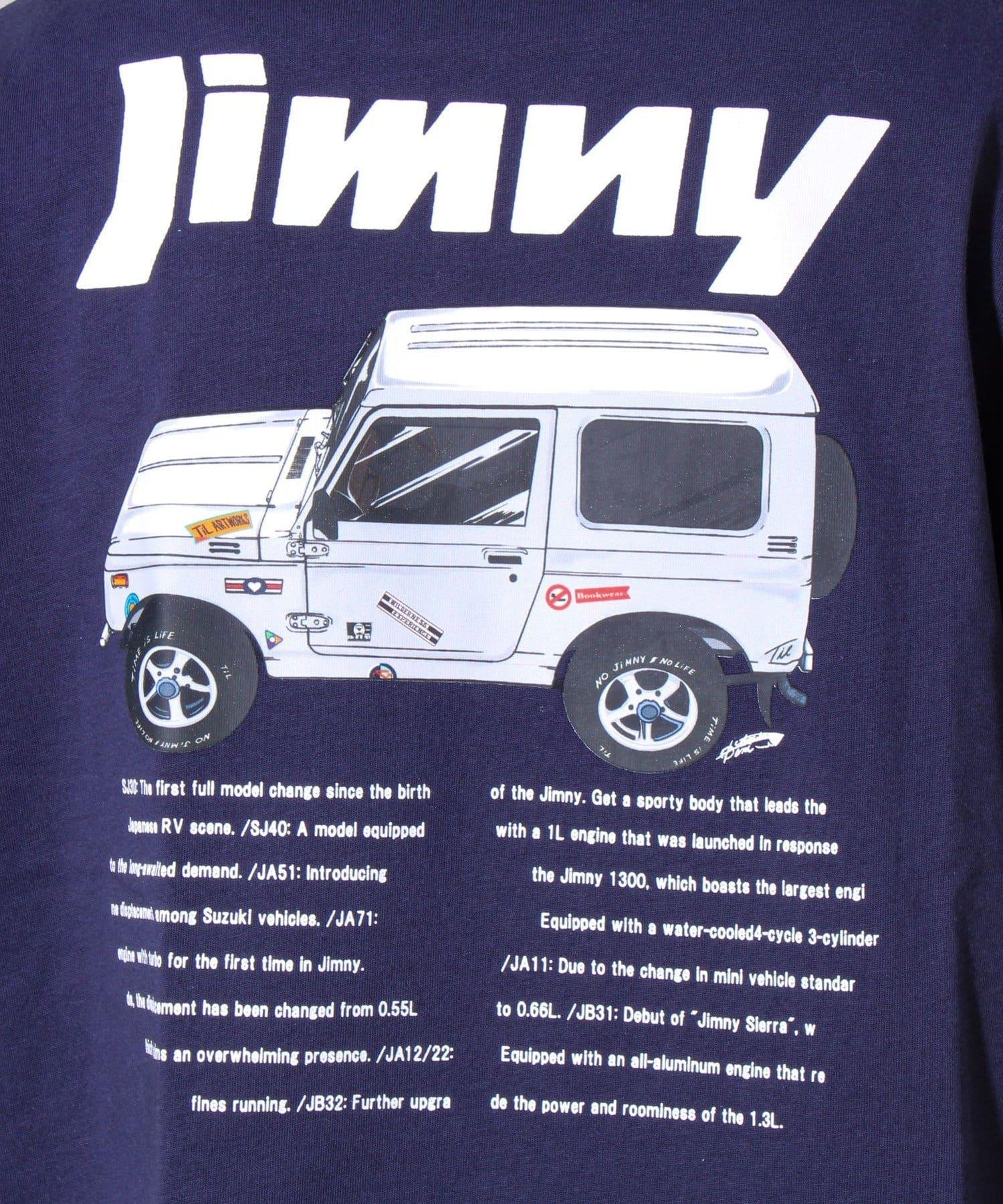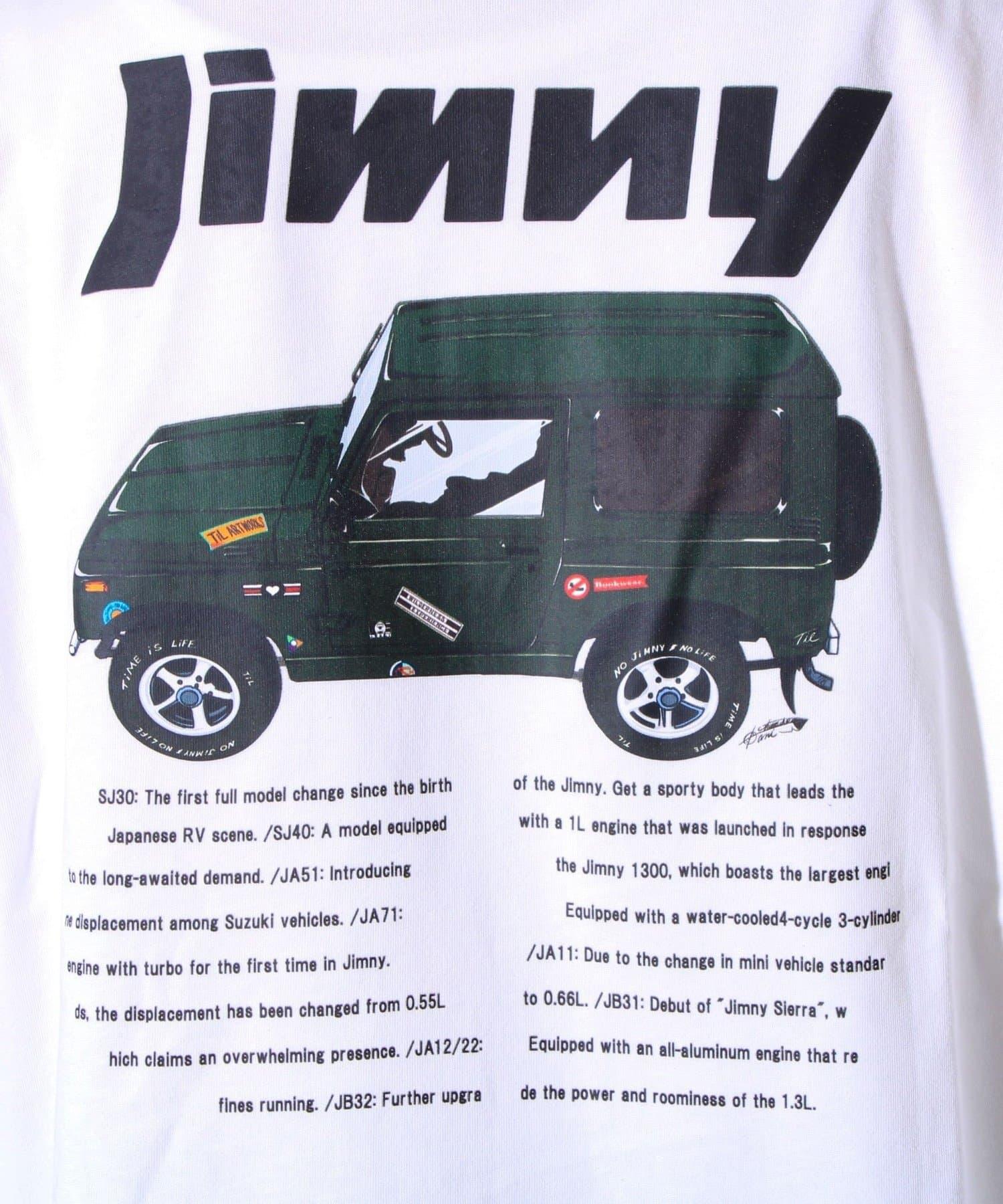 吉姆尼的正面以單點刺繡的形式繡在胸前,背面則是以往車型的插圖和說明。
