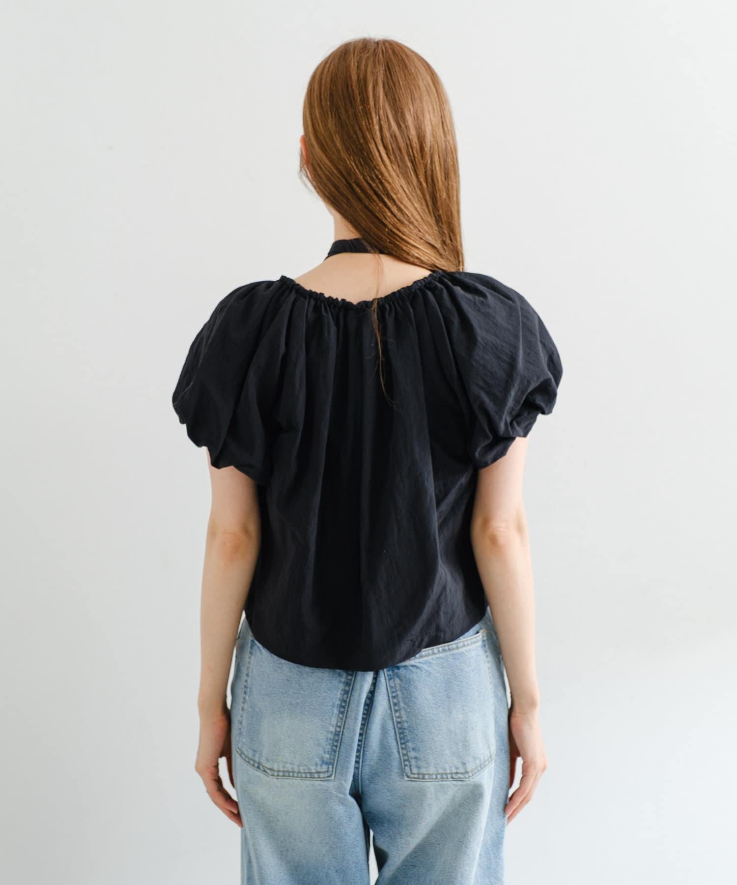 收攏的領口和柔軟的蓬蓬袖營造出女性的柔美氣質。