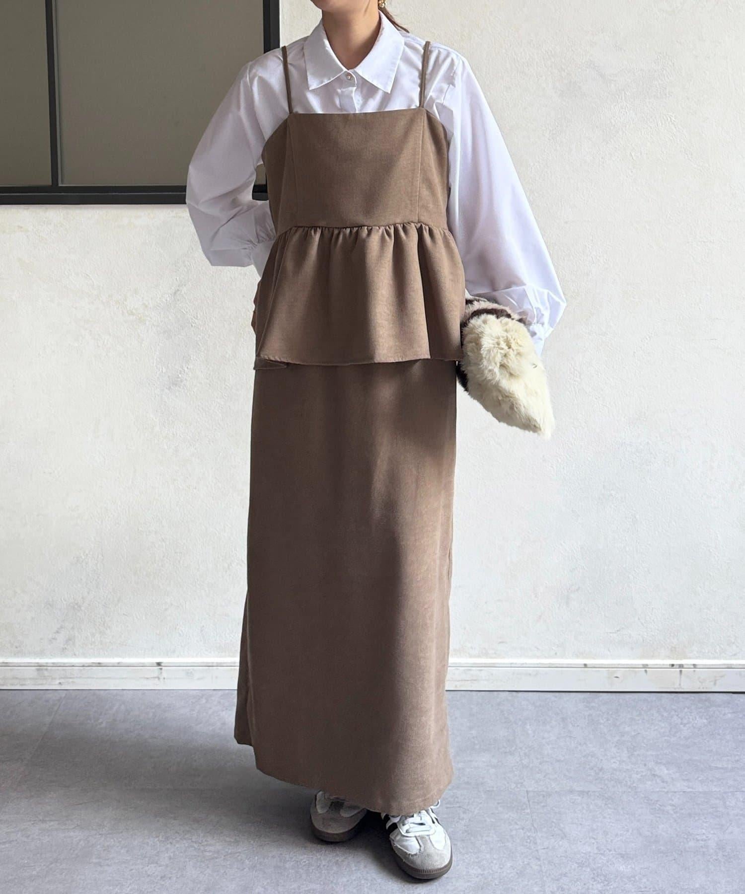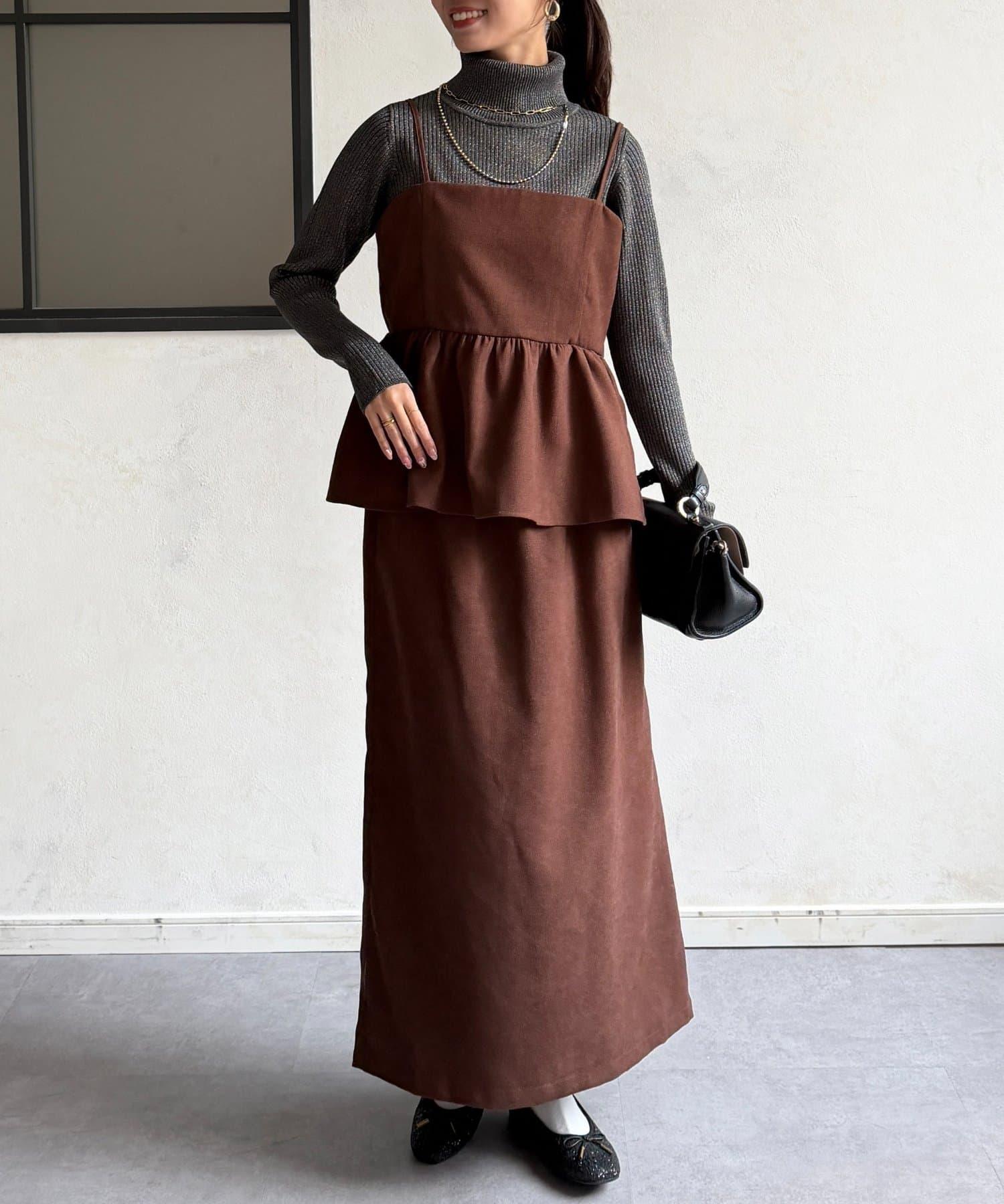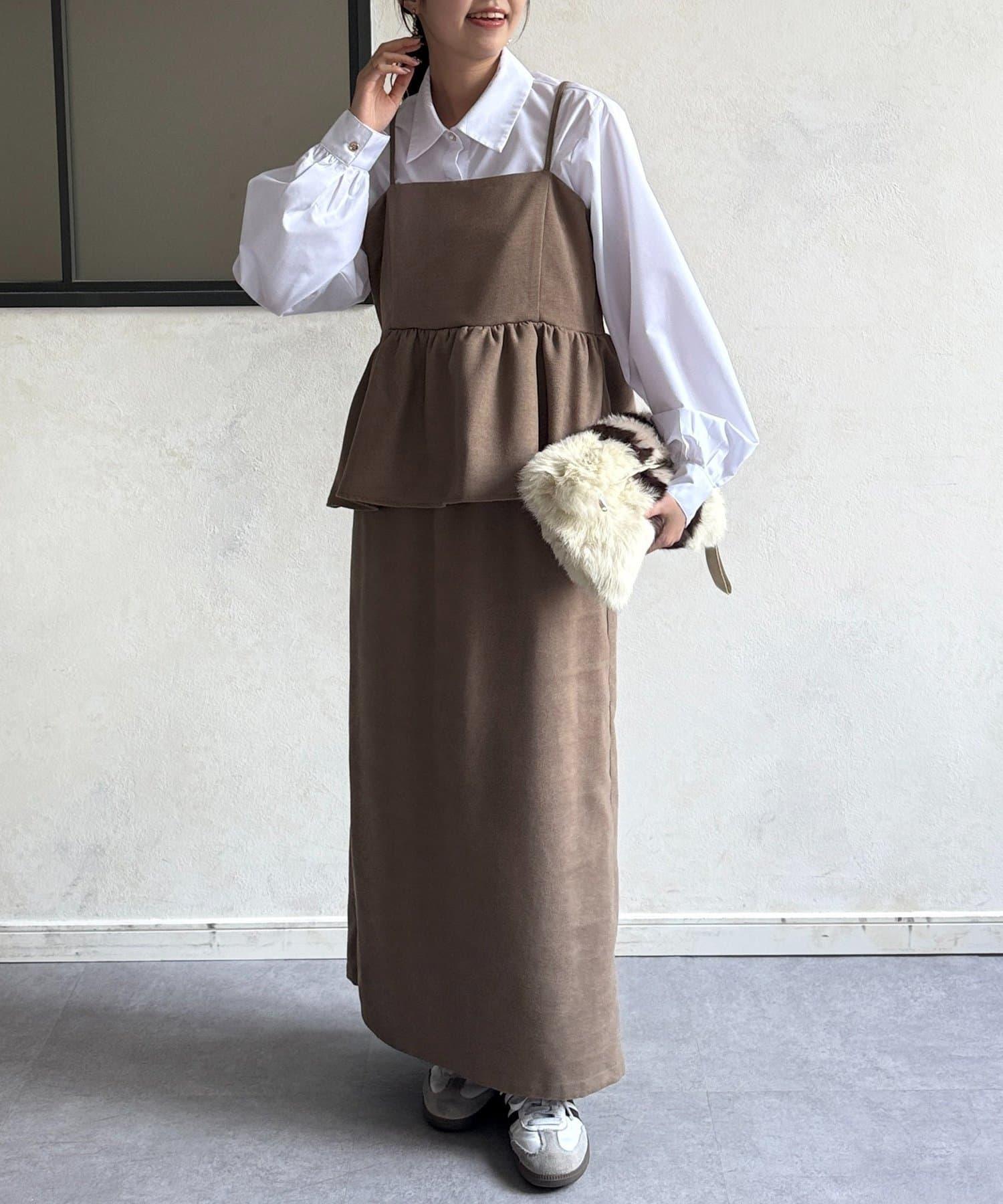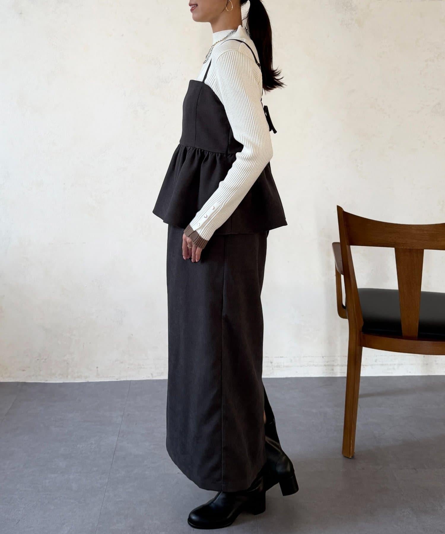 由遮蓋身體的蓬蓬裙廓形吊帶半身裙和簡潔的 I 字裙組成的套裝單品,適合休閒風格。