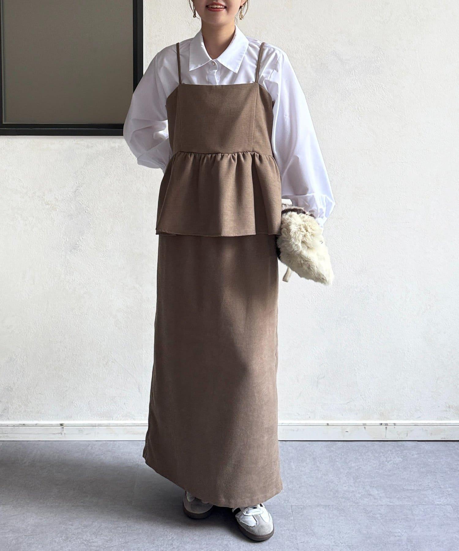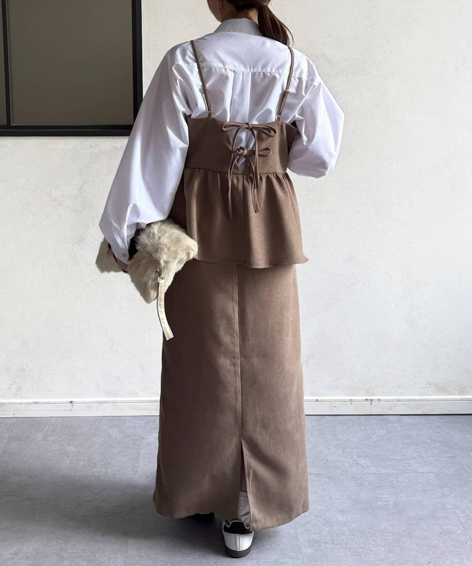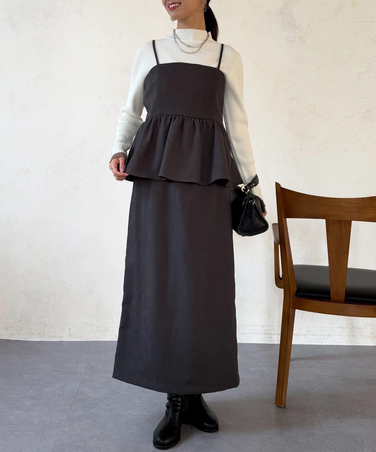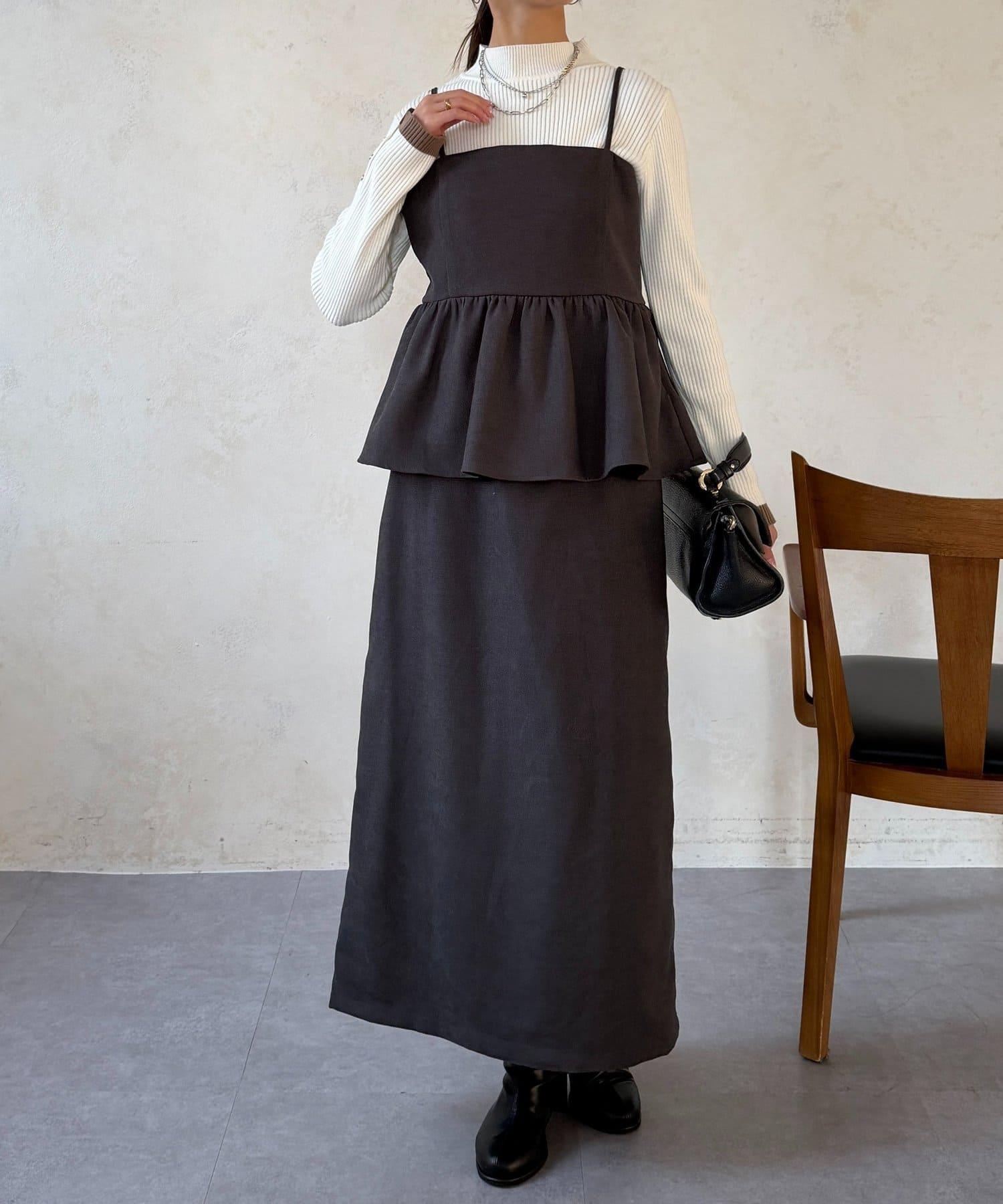 由遮蓋身體的蓬蓬裙廓形吊帶半身裙和簡潔的 I 字裙組成的套裝單品,適合休閒風格。
