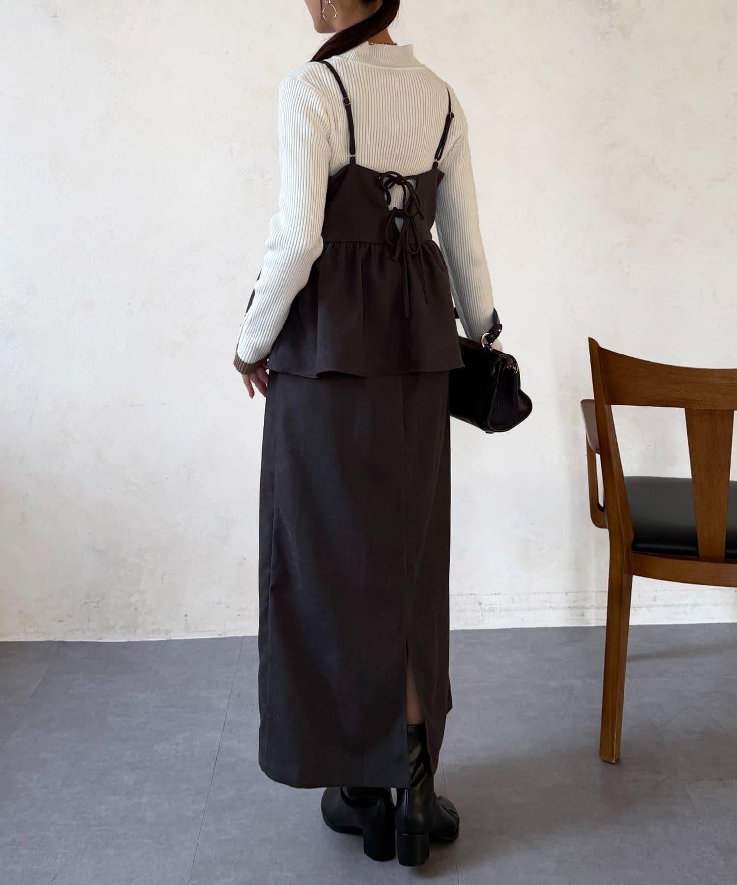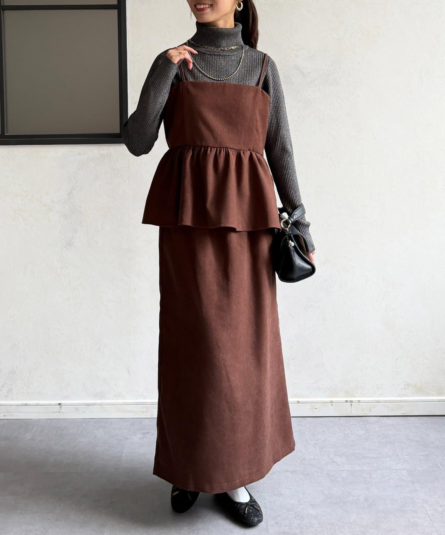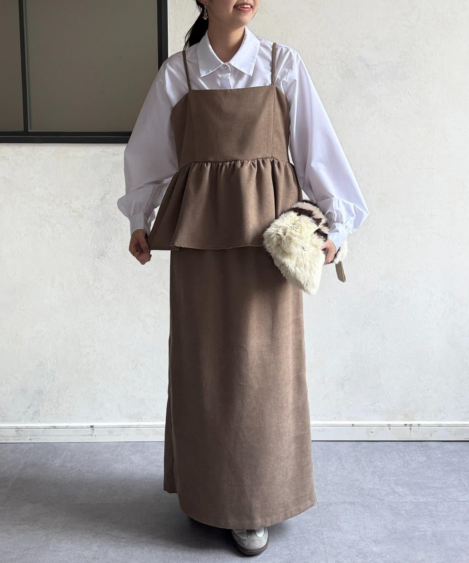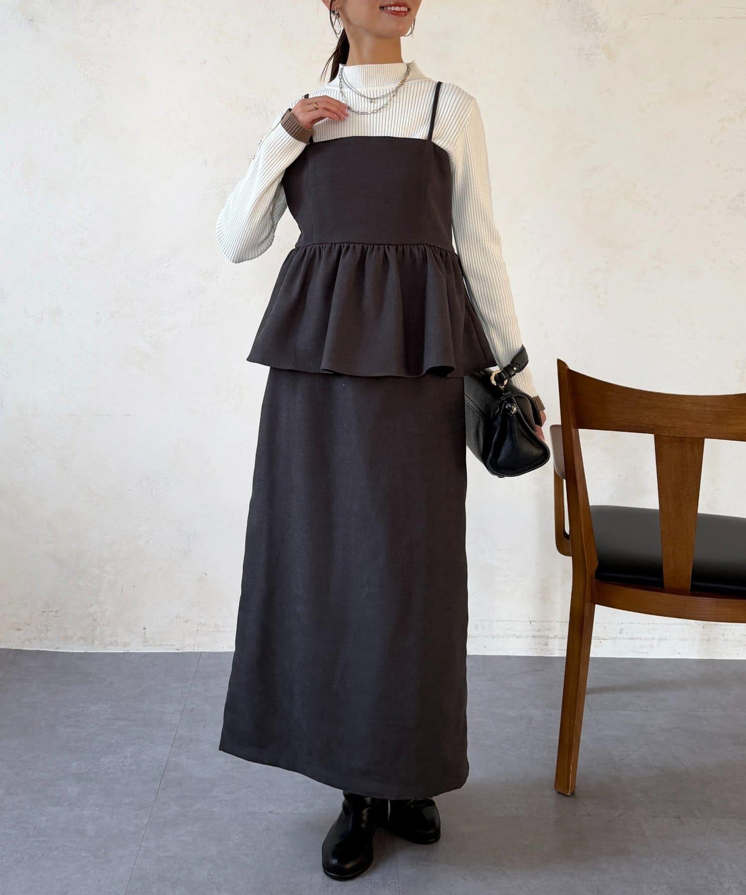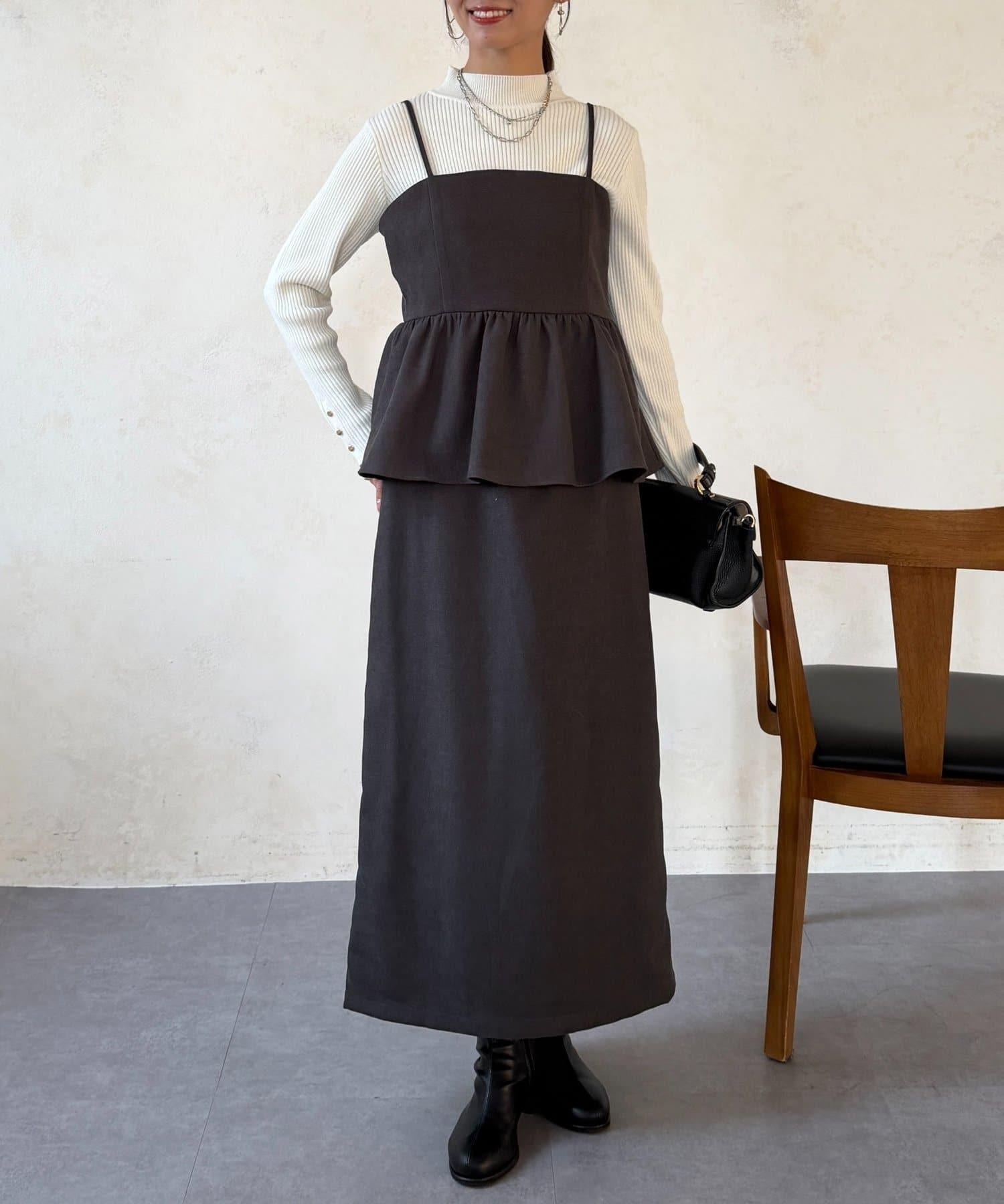 由遮蓋身體的蓬蓬裙廓形吊帶半身裙和簡潔的 I 字裙組成的套裝單品,適合休閒風格。