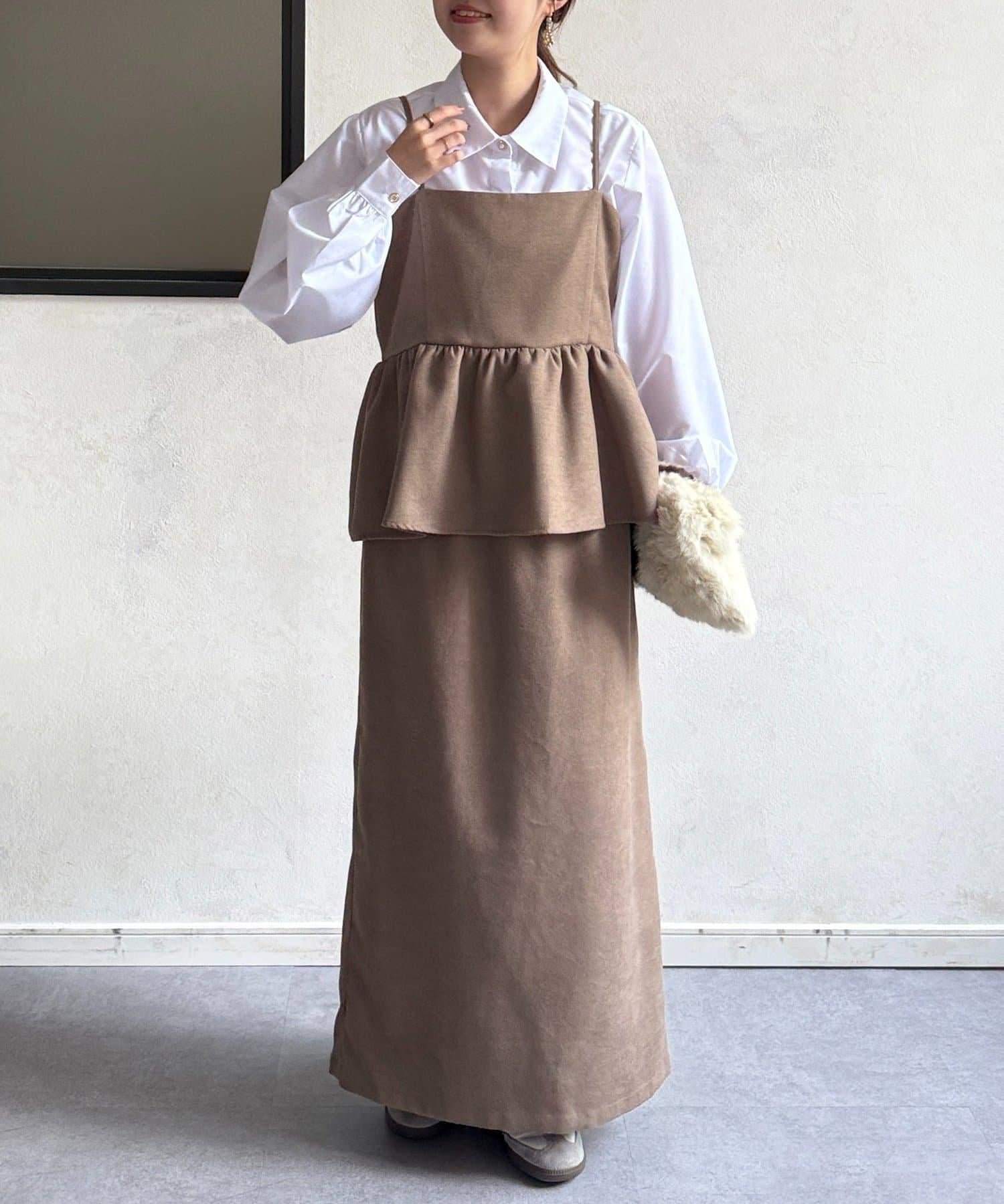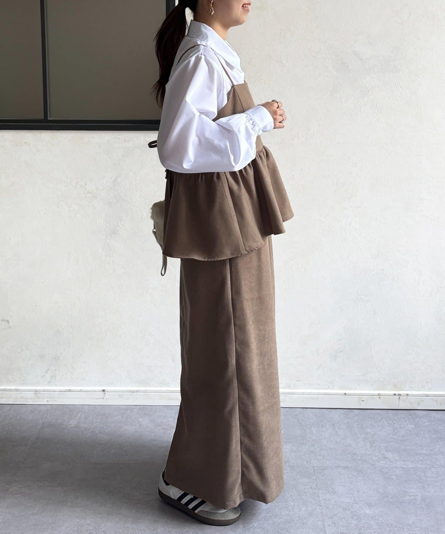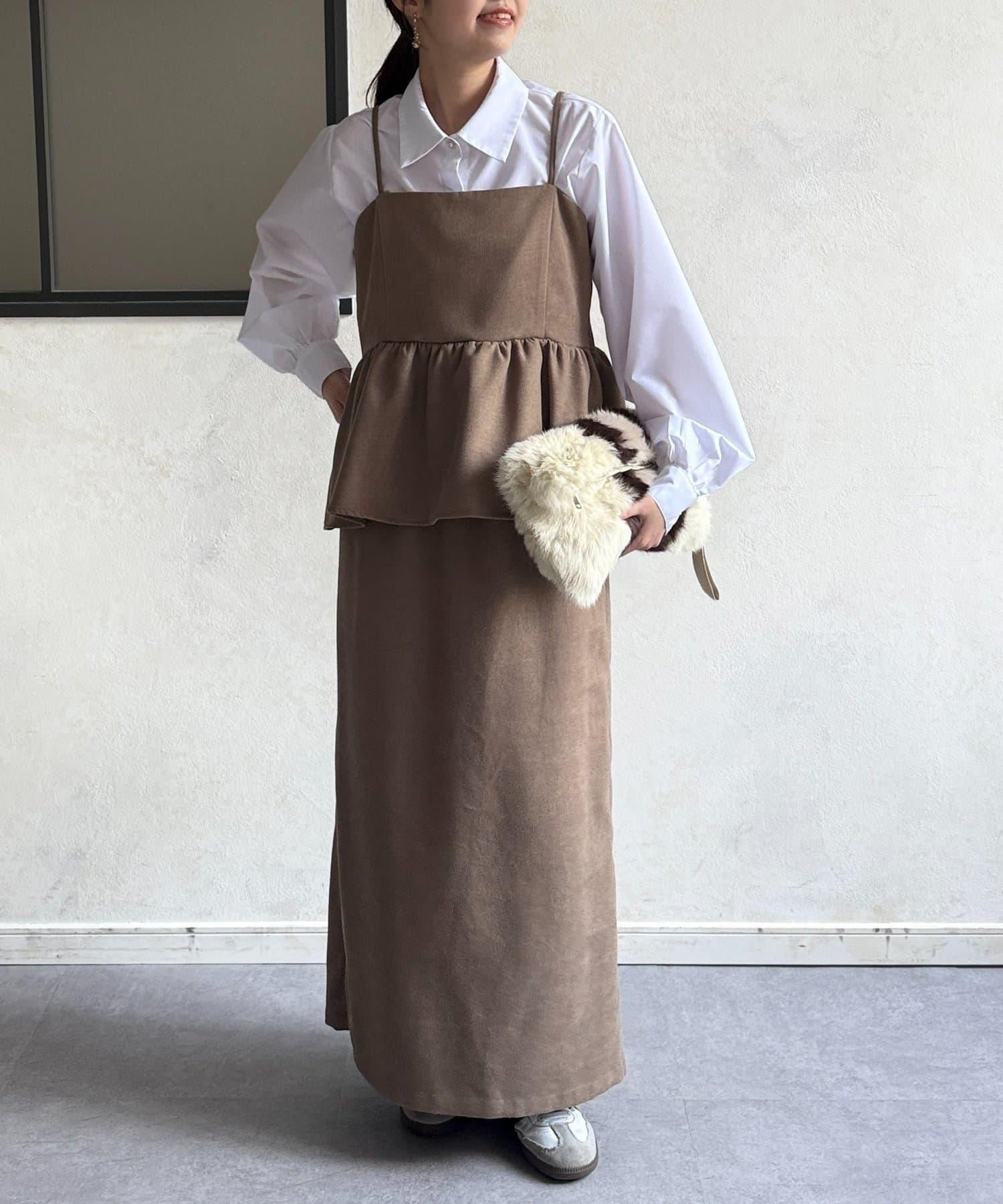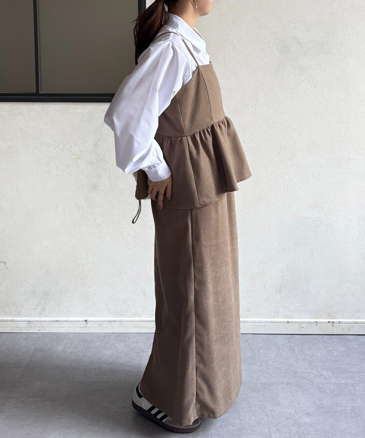 由遮蓋身體的蓬蓬裙廓形吊帶半身裙和簡潔的 I 字裙組成的套裝單品,適合休閒風格。