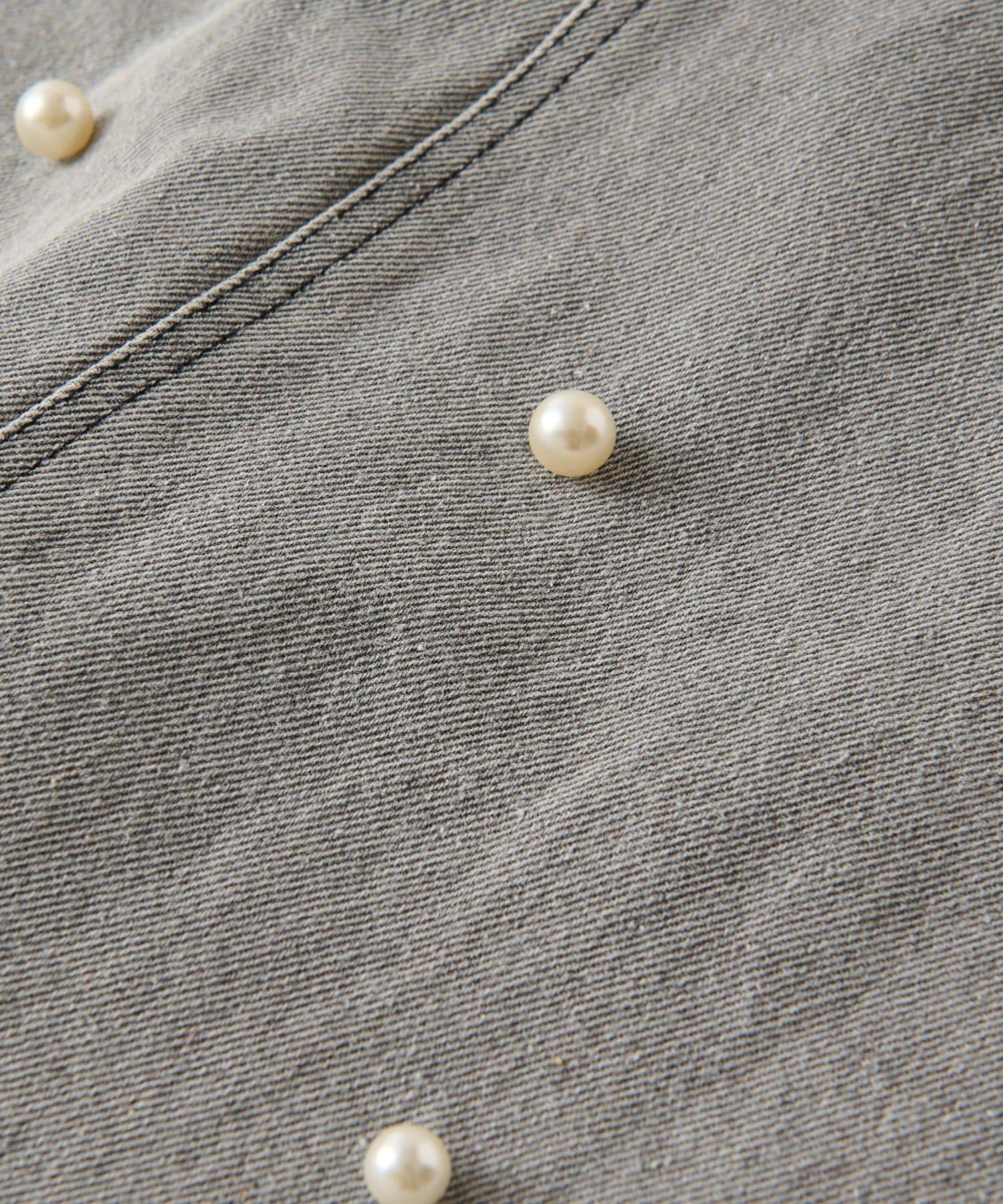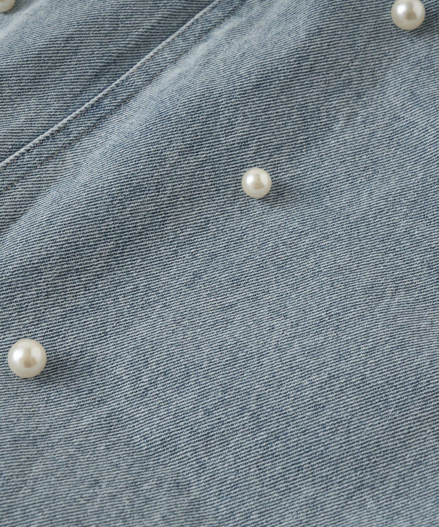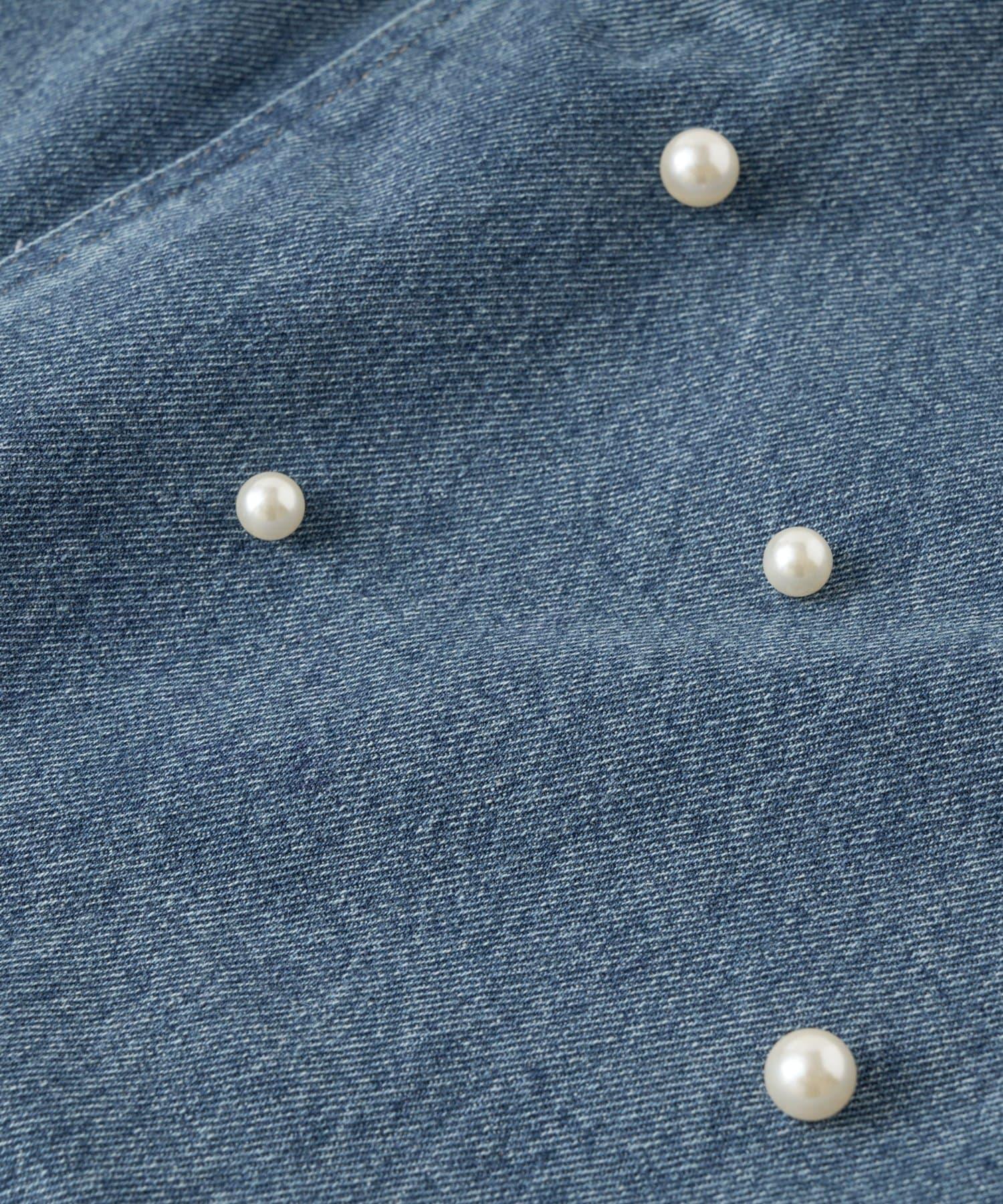牛仔裙正面鑲有大小不一的珍珠,採用復古風格的牛仔布料。