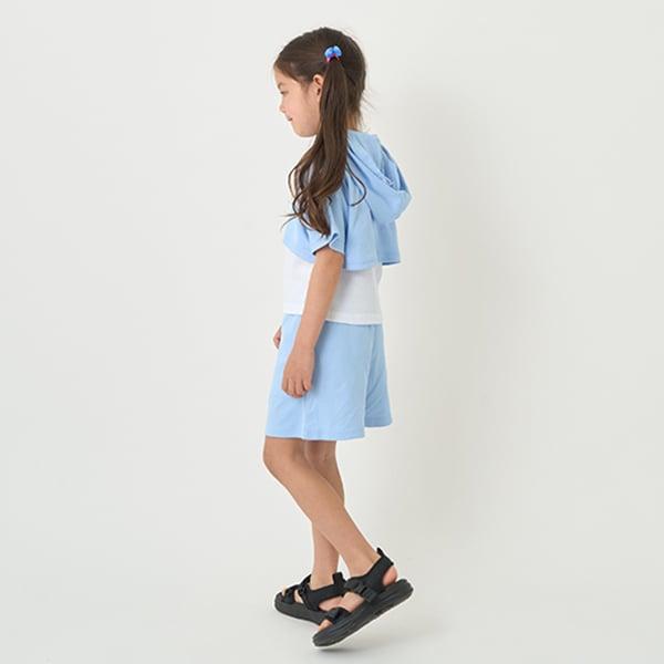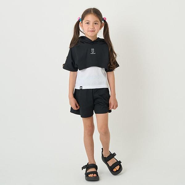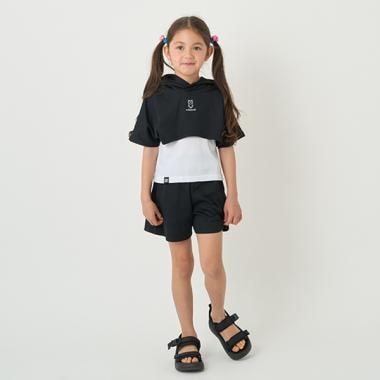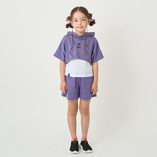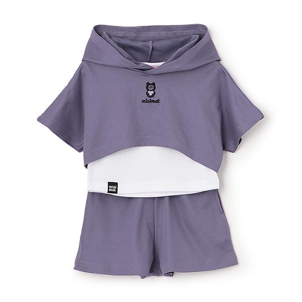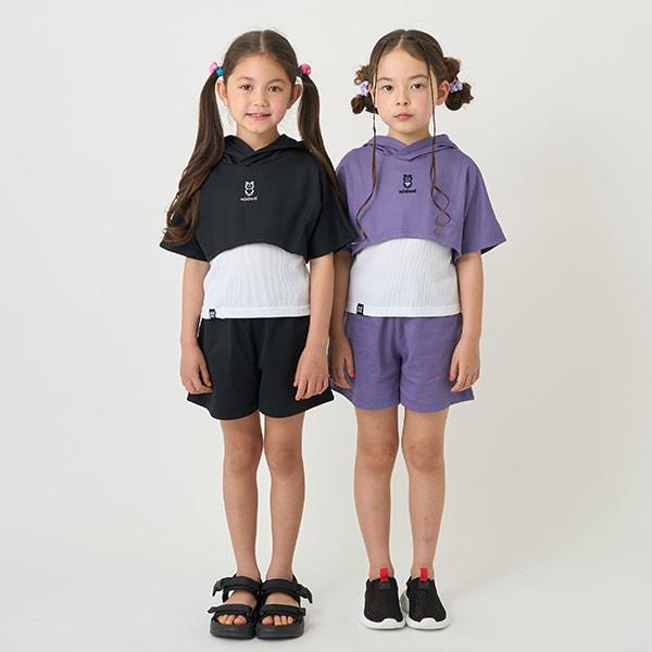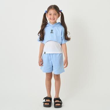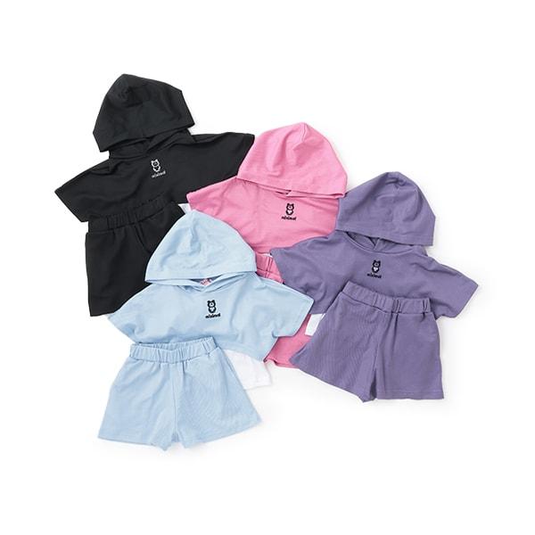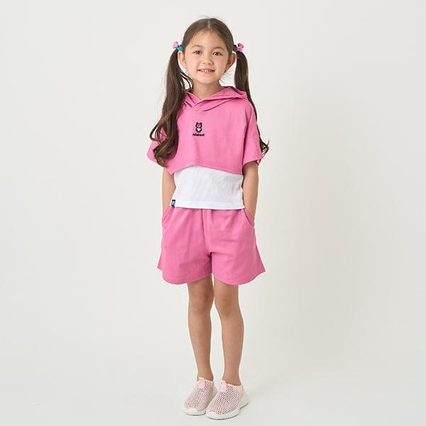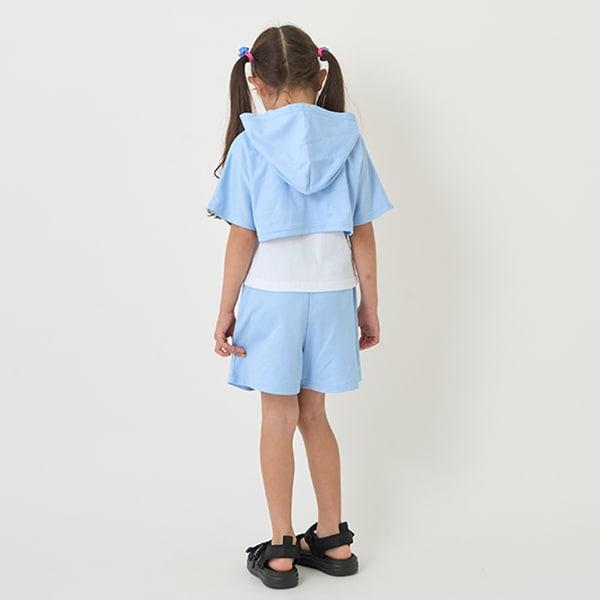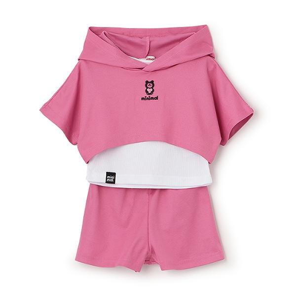 連帽衫上繡有精緻的心形小熊,腰部的鬆緊短褲方便穿脫,孩子們可以自己換衣服。