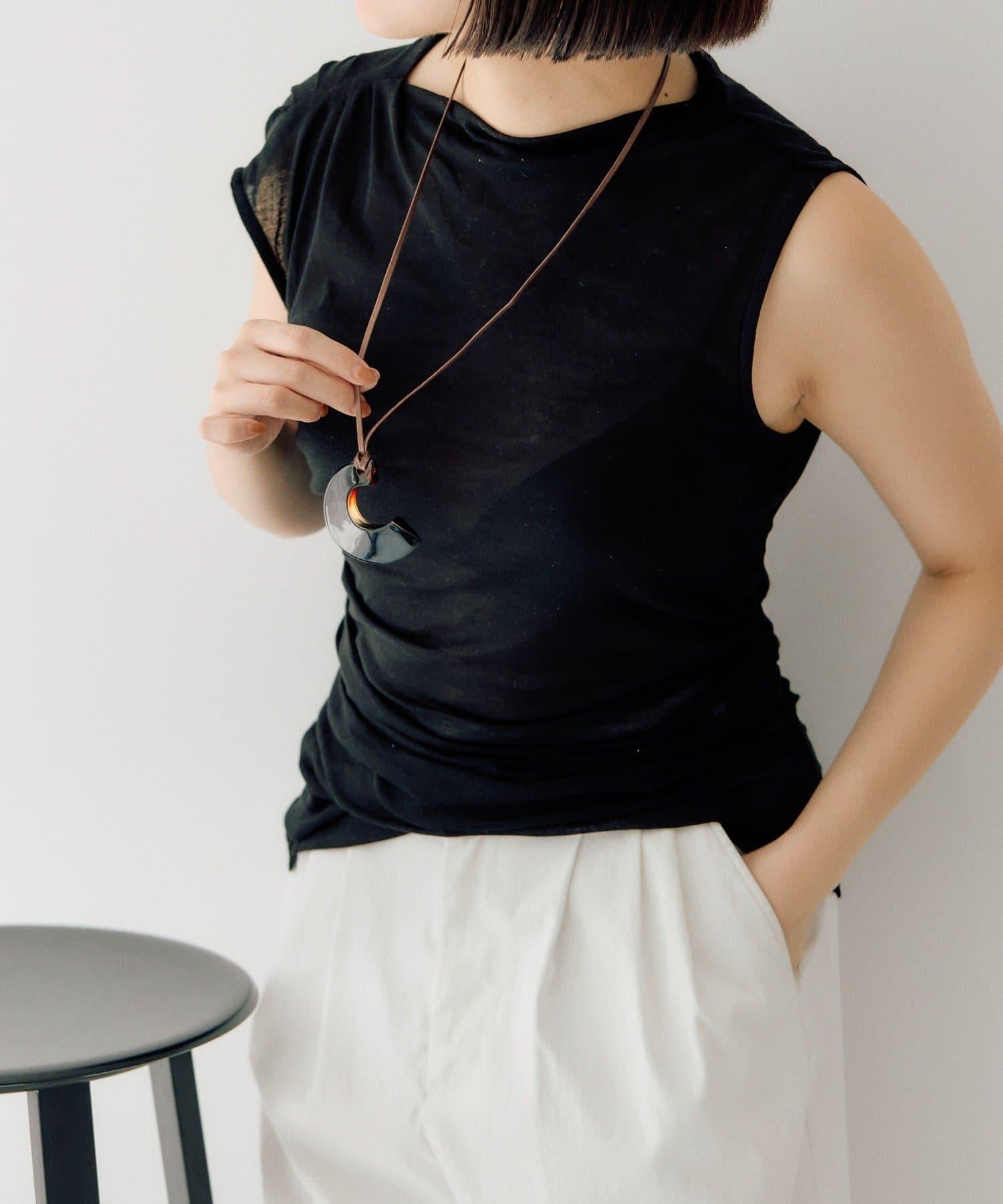 亞克力上衣的獨特造型讓長長的上衣領口顯得格外突出。