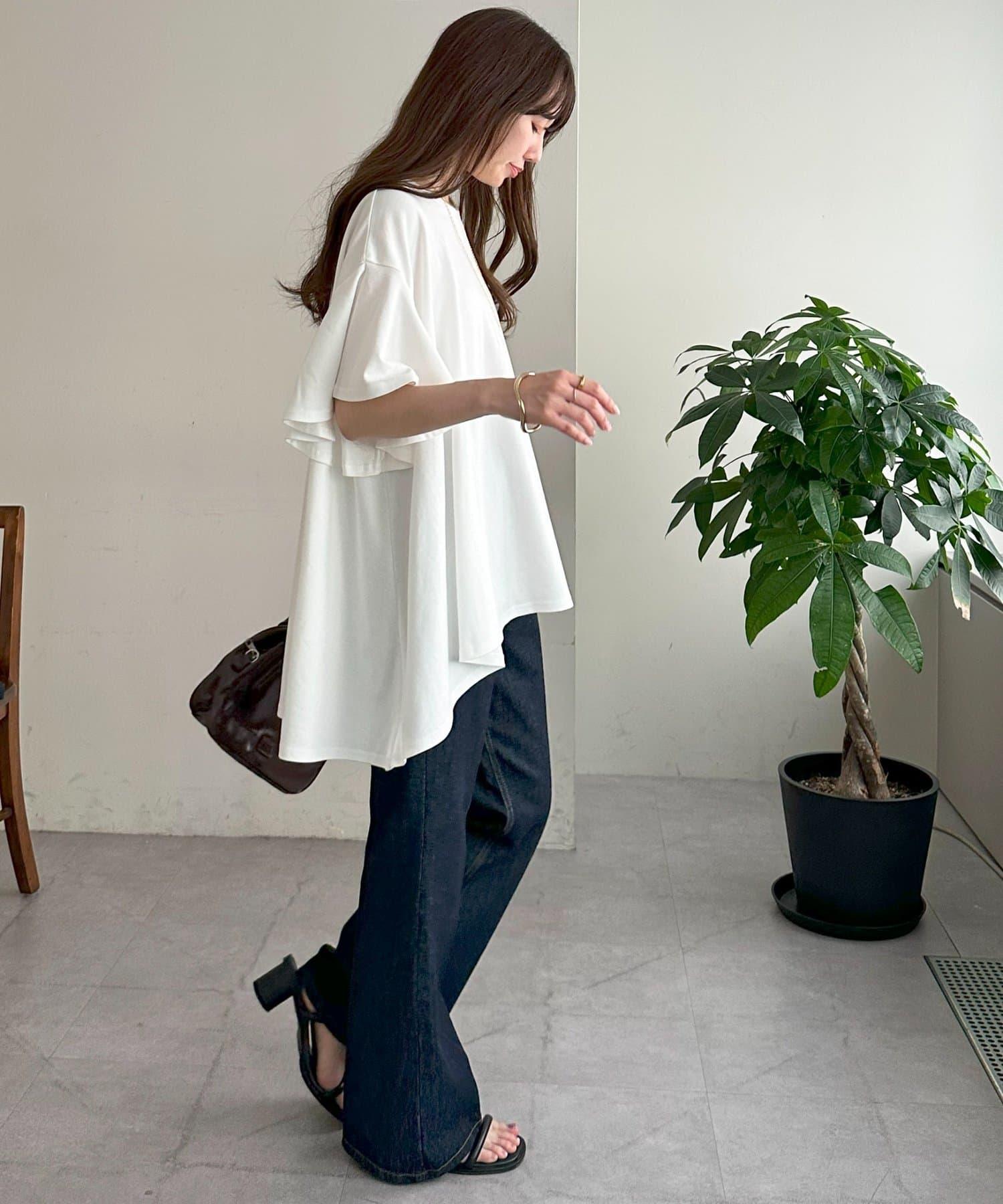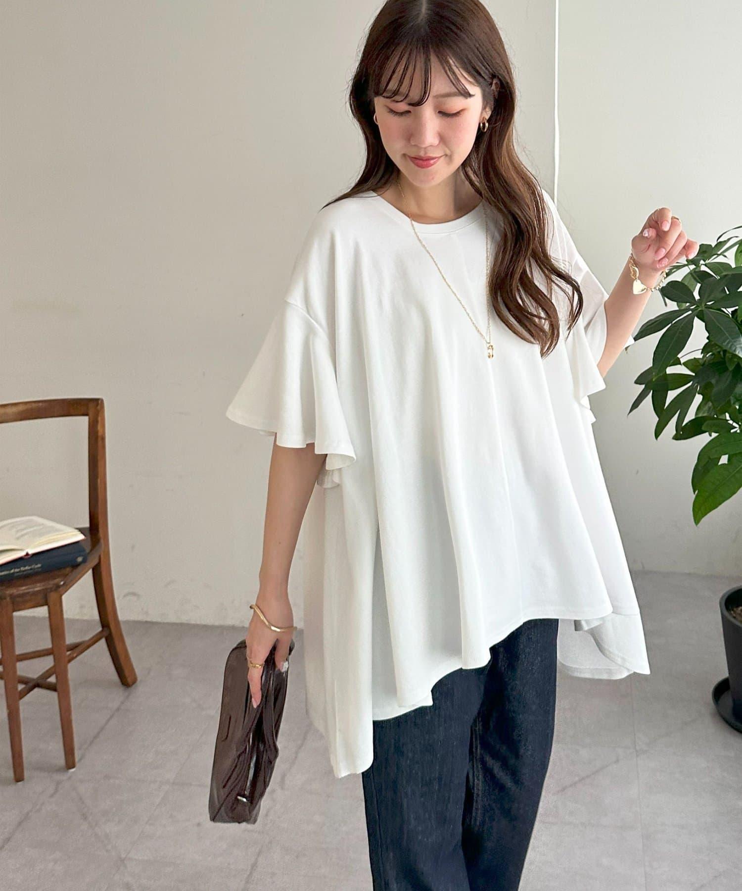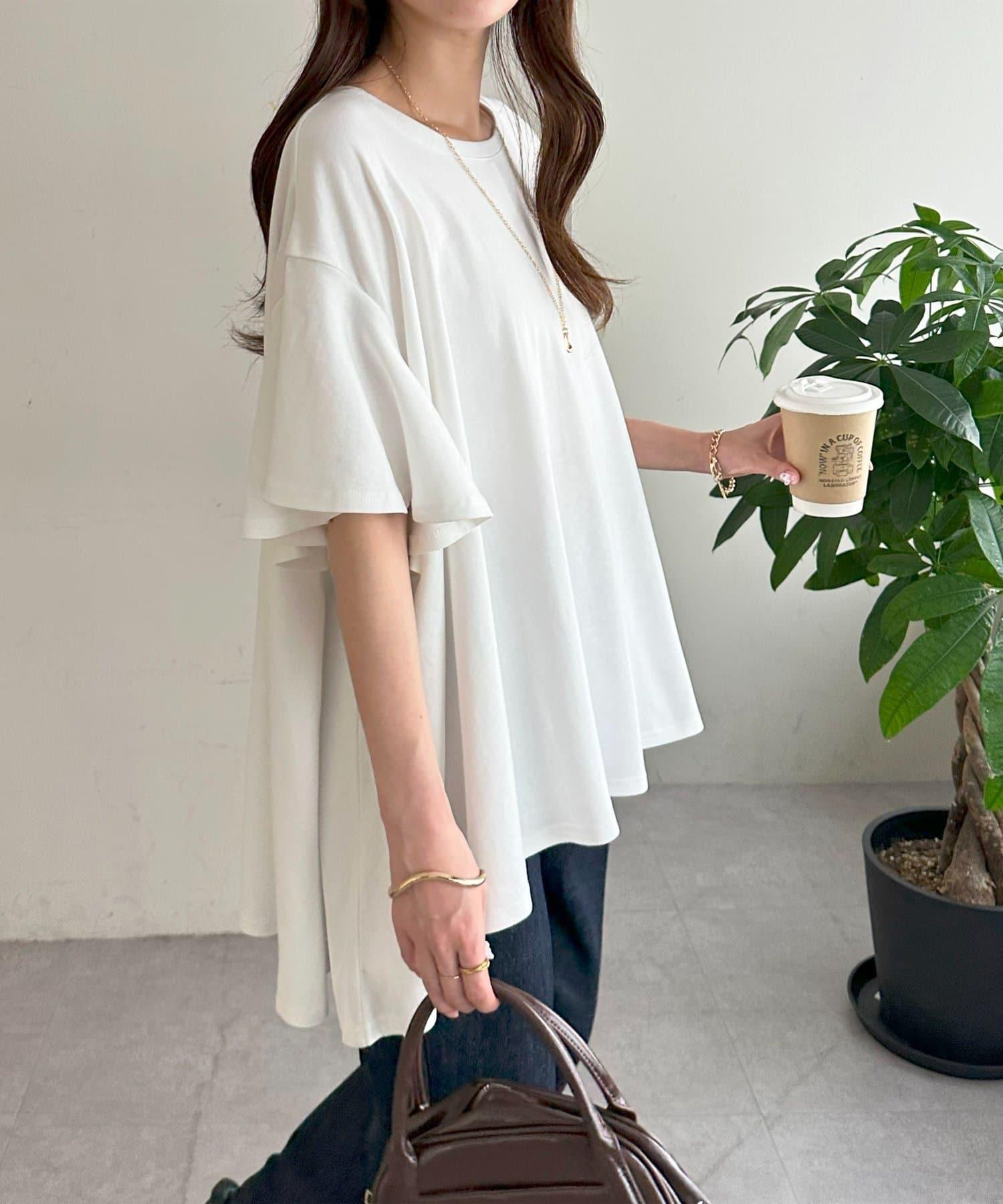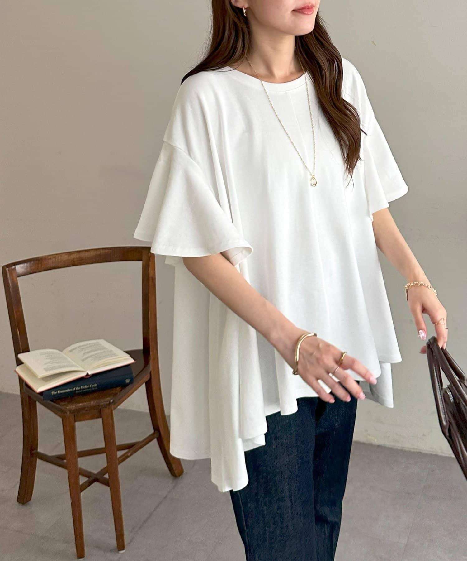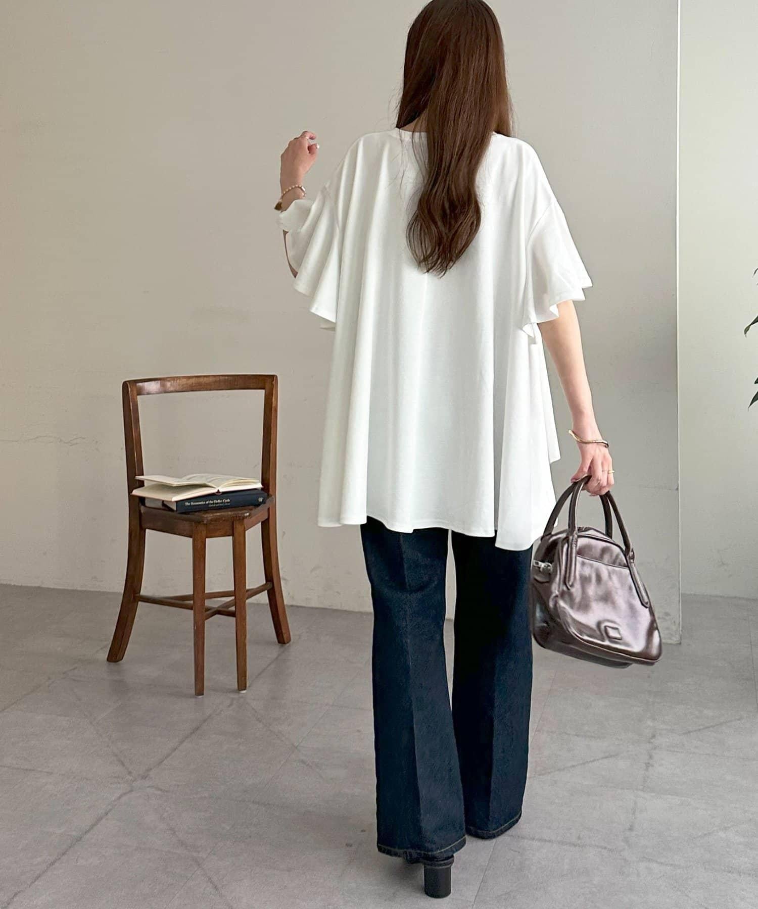 喇叭袖營造出女性溫柔的氛圍,同時柔和地遮住手臂。此外,寬鬆的過度廓形也是一個很好的點,不會挑起身體的線條。