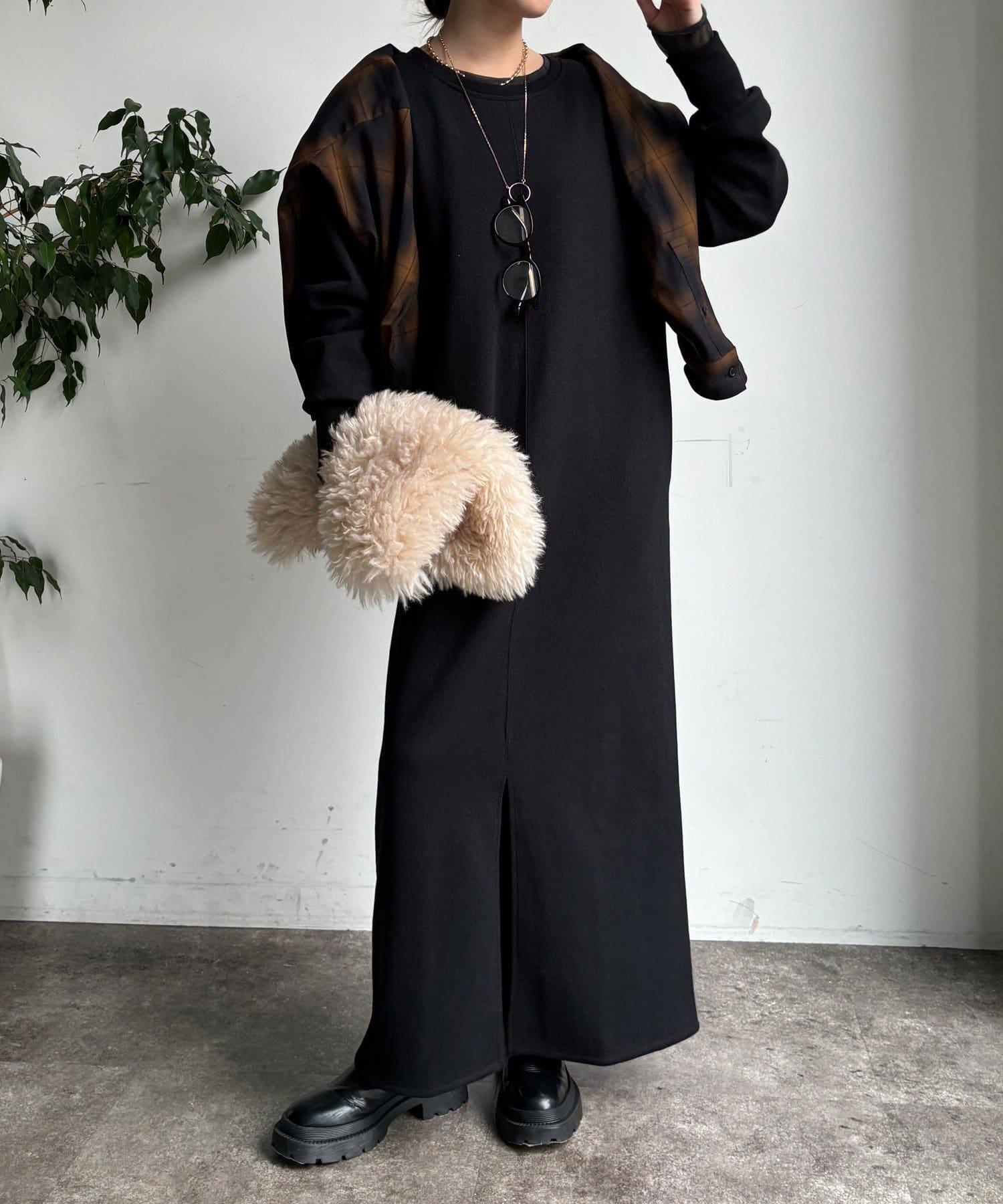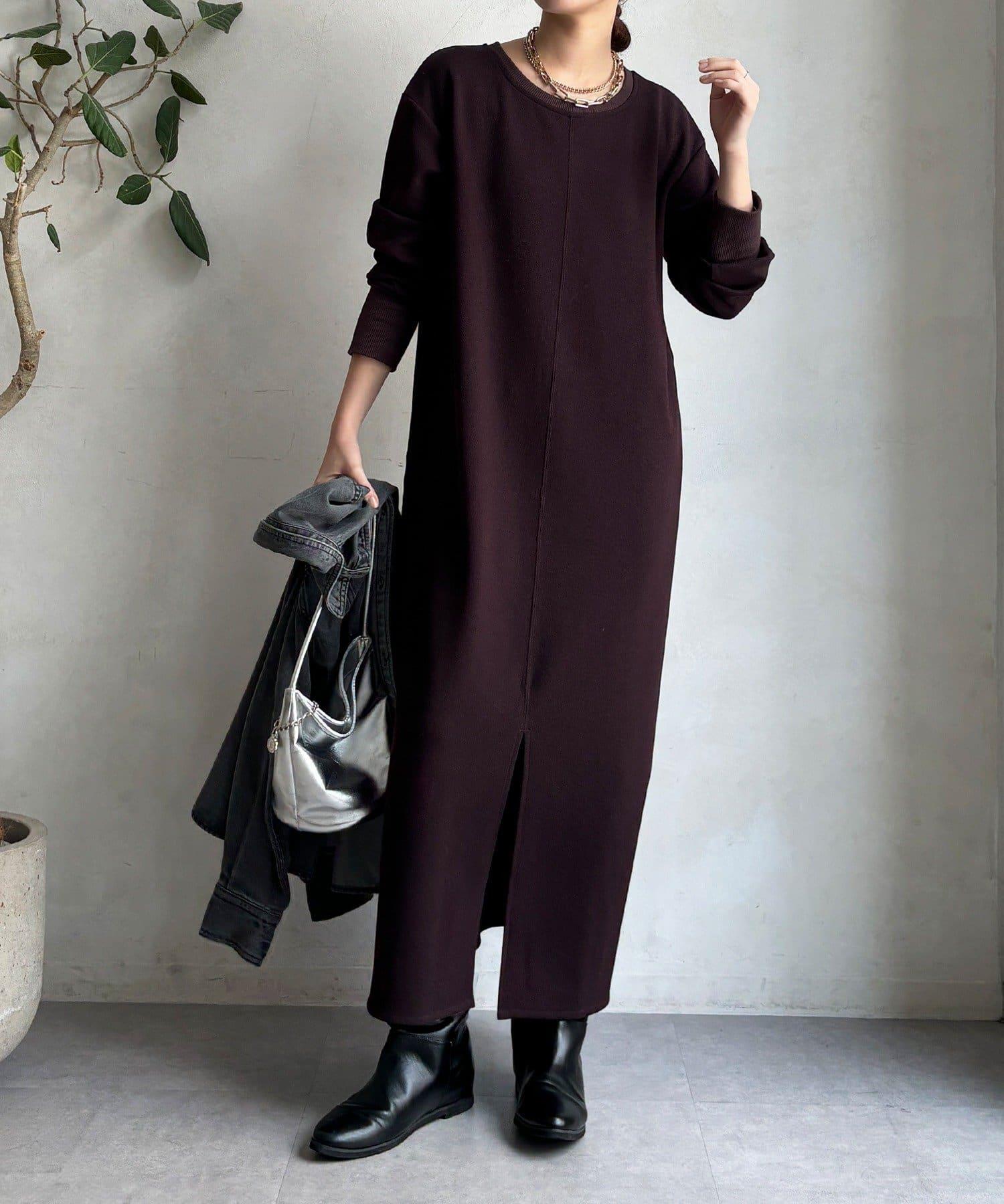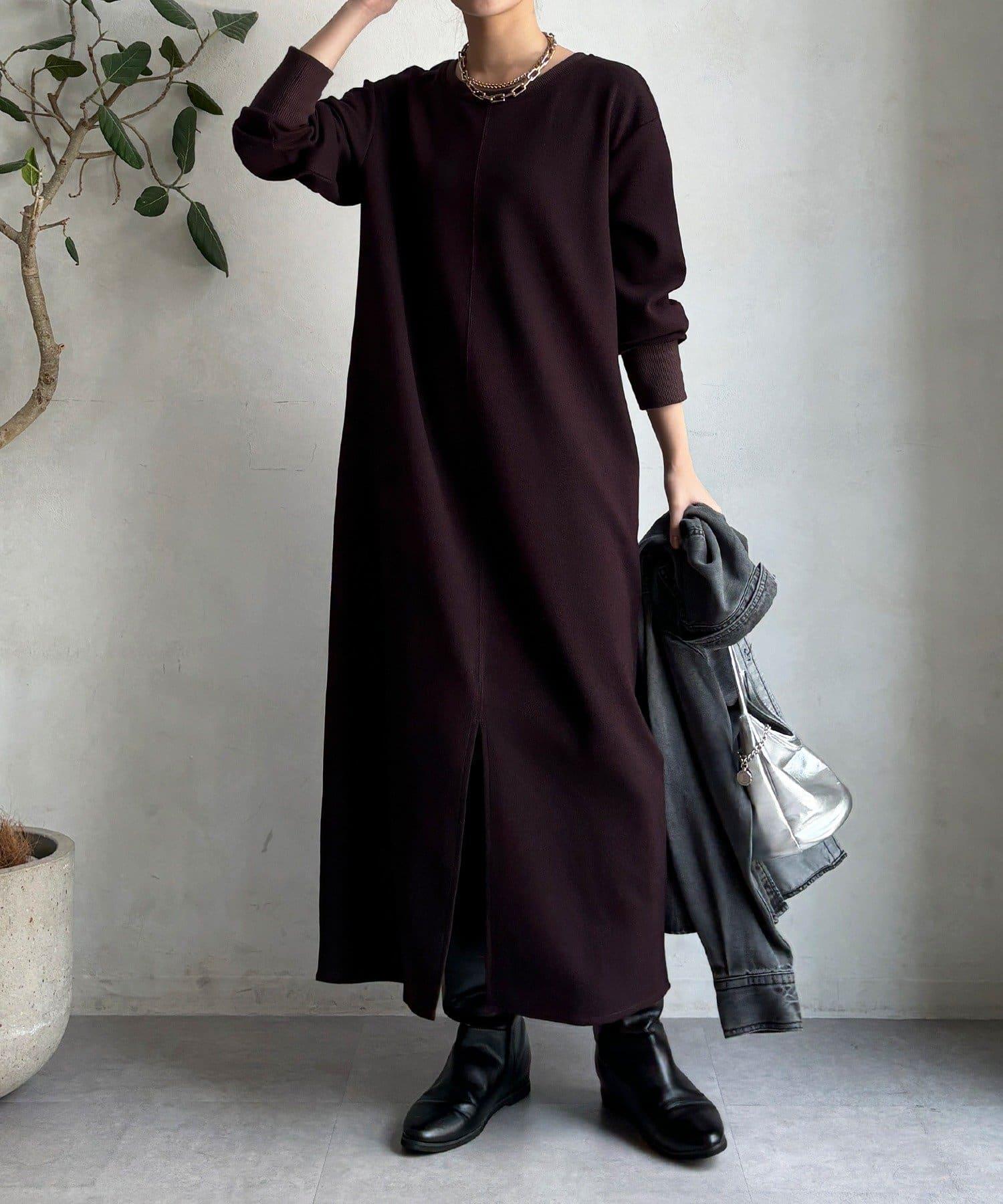 通過在前下襬加入開衩設計,長款連衣裙不會給人厚重的感覺。