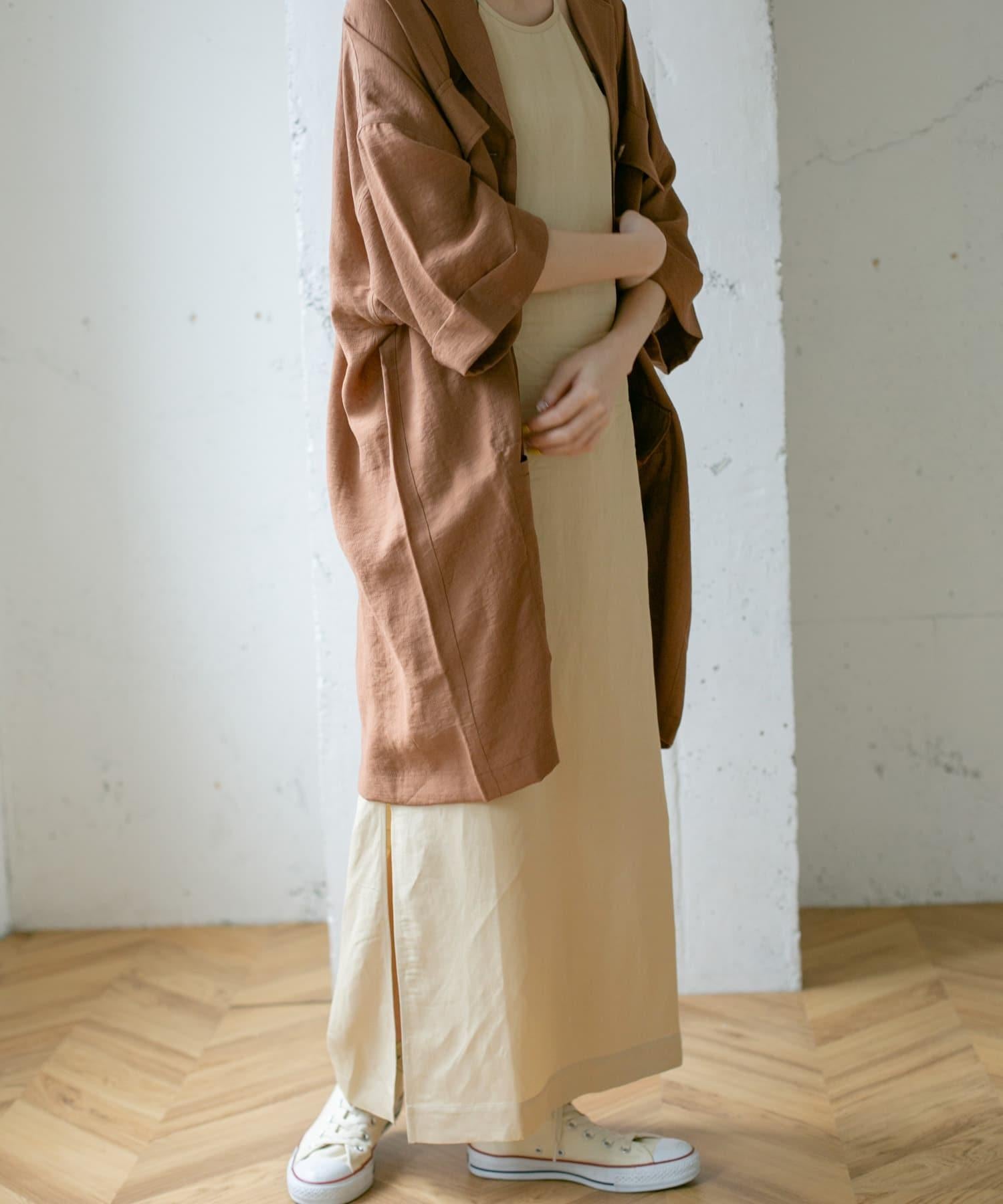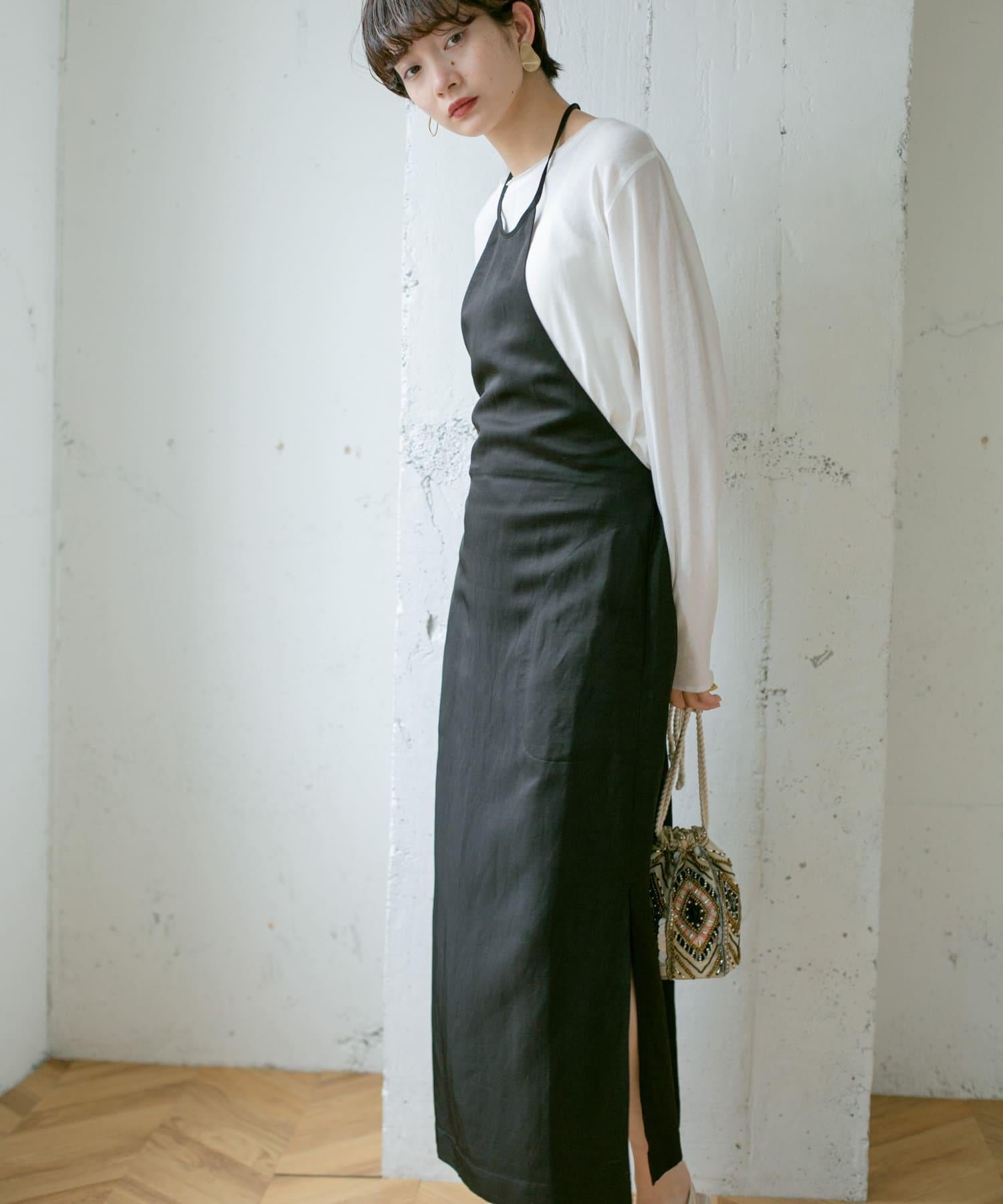 圓領設計的連衣裙。側面的深開衩設計給人寬鬆的感覺,可調節長度的設計也很不錯。這款連衣裙既可搭配內搭和剪裁褲,也可與襯衫和針織衫疊穿。除了基本的米色和黑色,我們還準備了春夏季特有的亮藍色。