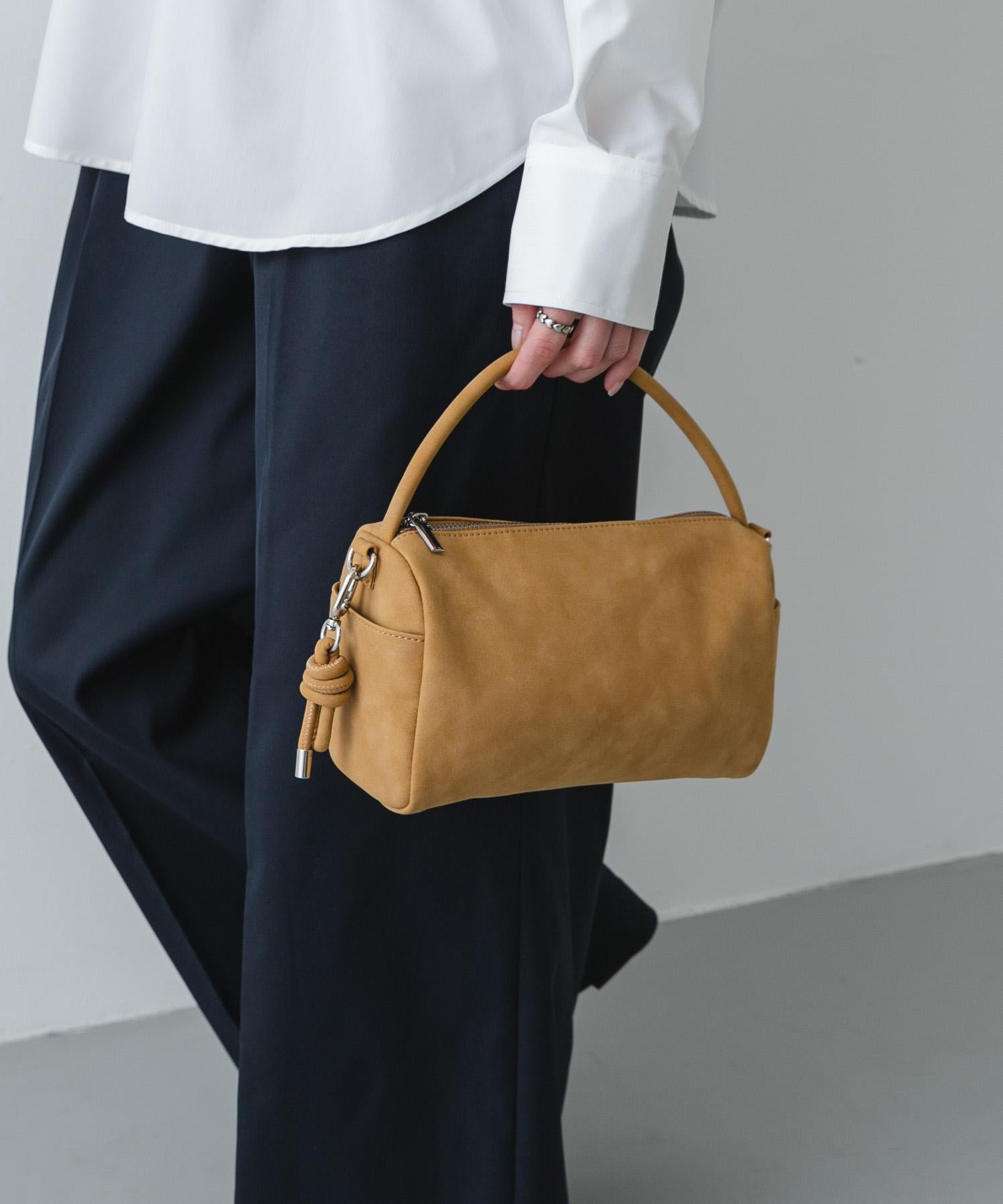 迷你波士頓手袋,材質對比鮮明。這款手袋有兩種款式可供選擇:仿皮材質給人精緻的印象,麂皮材質給人舒適的觸感。圓潤飽滿的外形讓人忍不住想拿起它,為您的造型增添良好的輕鬆感。側面的繩結設計吊飾為簡潔的包身增添了個性。小巧的設計帶有夾層,可以優雅地攜帶日常用品。