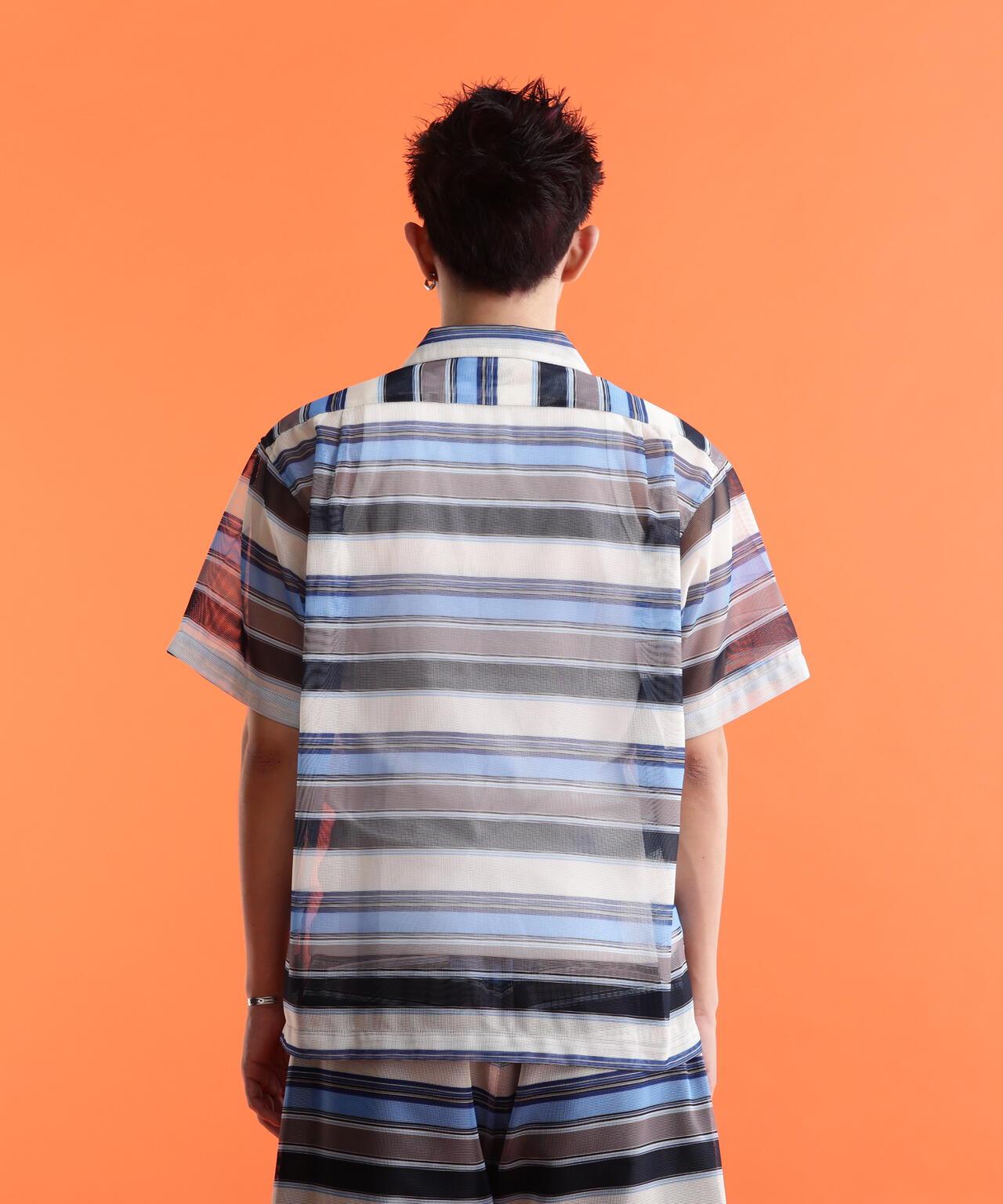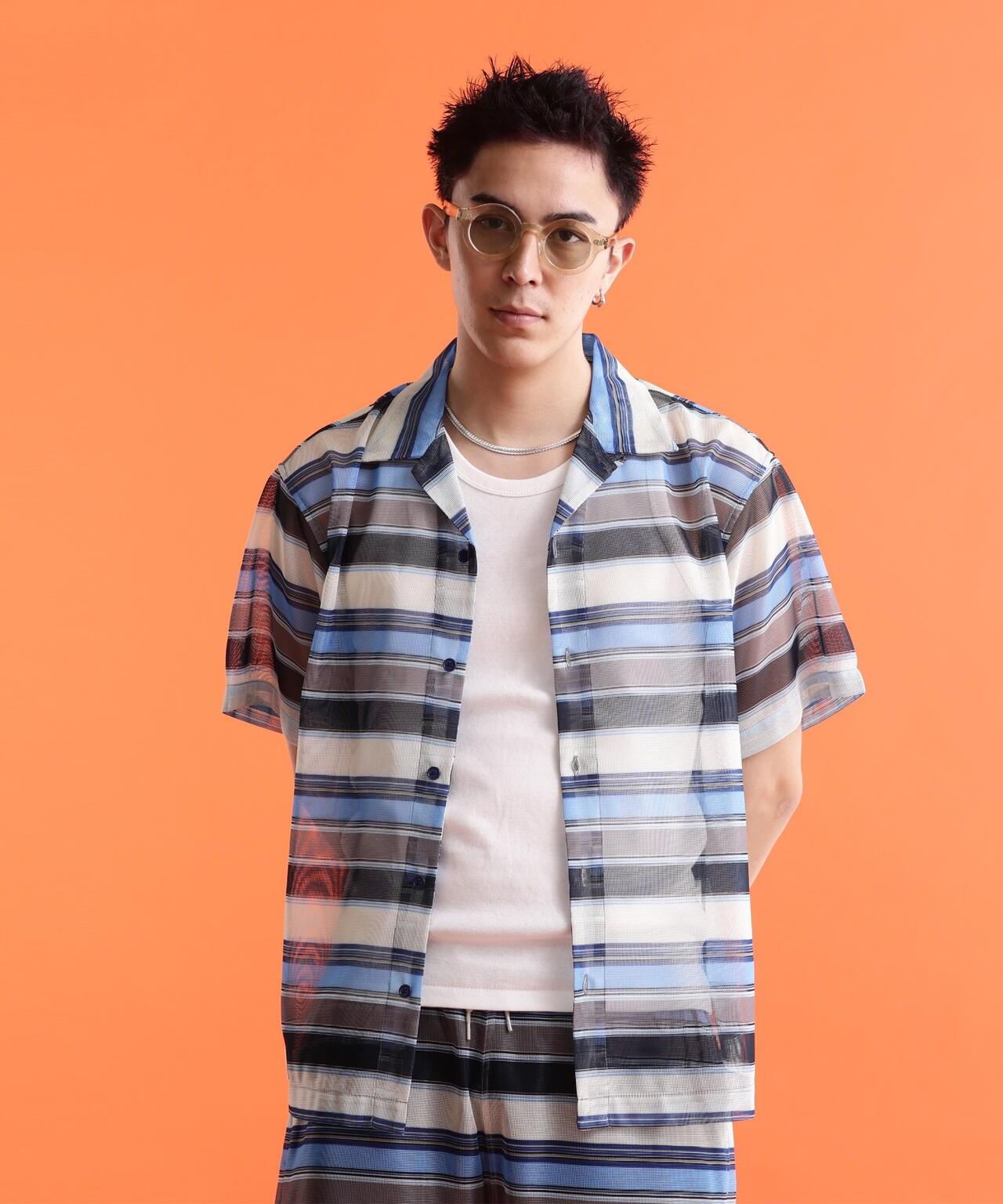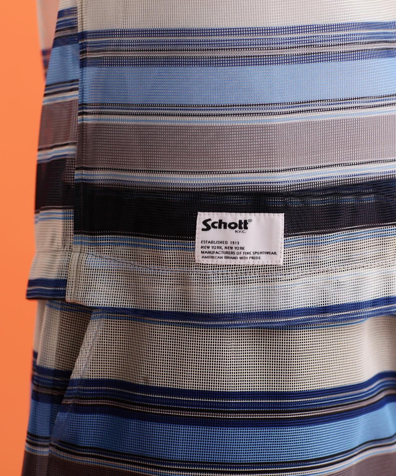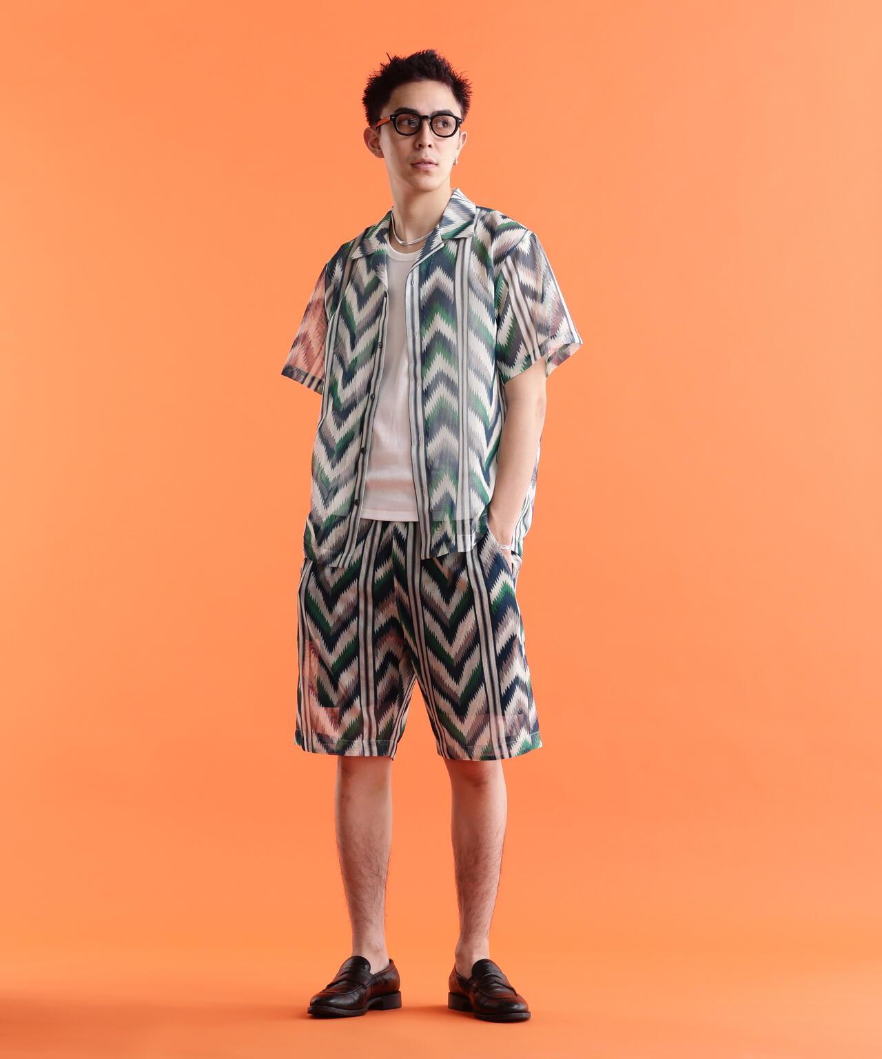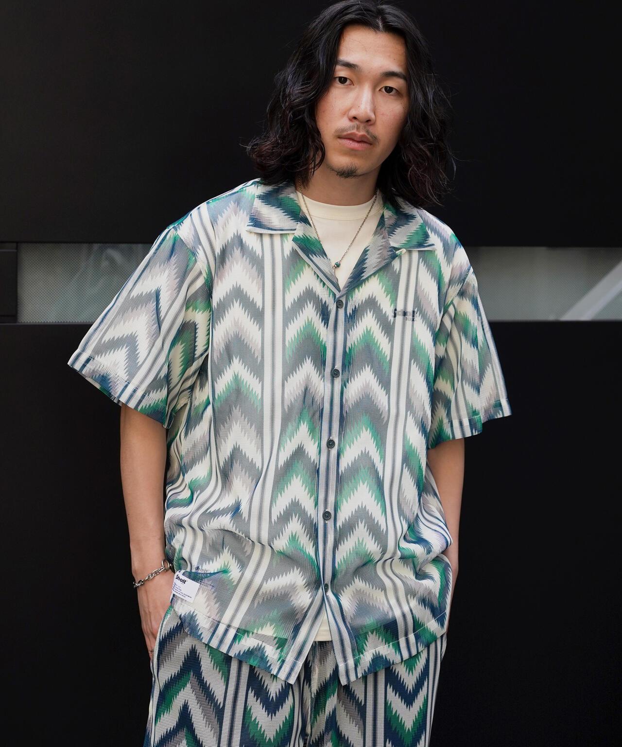 透明聚酯網布系列。原創紡織品上印有多邊框和人字形的大幅圖案,以及兩種帶有本土元素的圖案。為了不過度誇張,對圖案進行了模糊處理。通過改變內襯來調整網眼,使其能以不同的方式呈現,方便各種穿著方式。極簡設計,胸前無口袋,充分利用了面料的特性。由於面料的彈力不是很好,後背有兩個收口,可以遮蓋運動量,再搭配肖特本季的印花 T 恤,搭配範圍將大大拓寬。肖特] 肖特是騎手夾克的代名詞,其歷史可追溯到 20 世紀 60 年代。