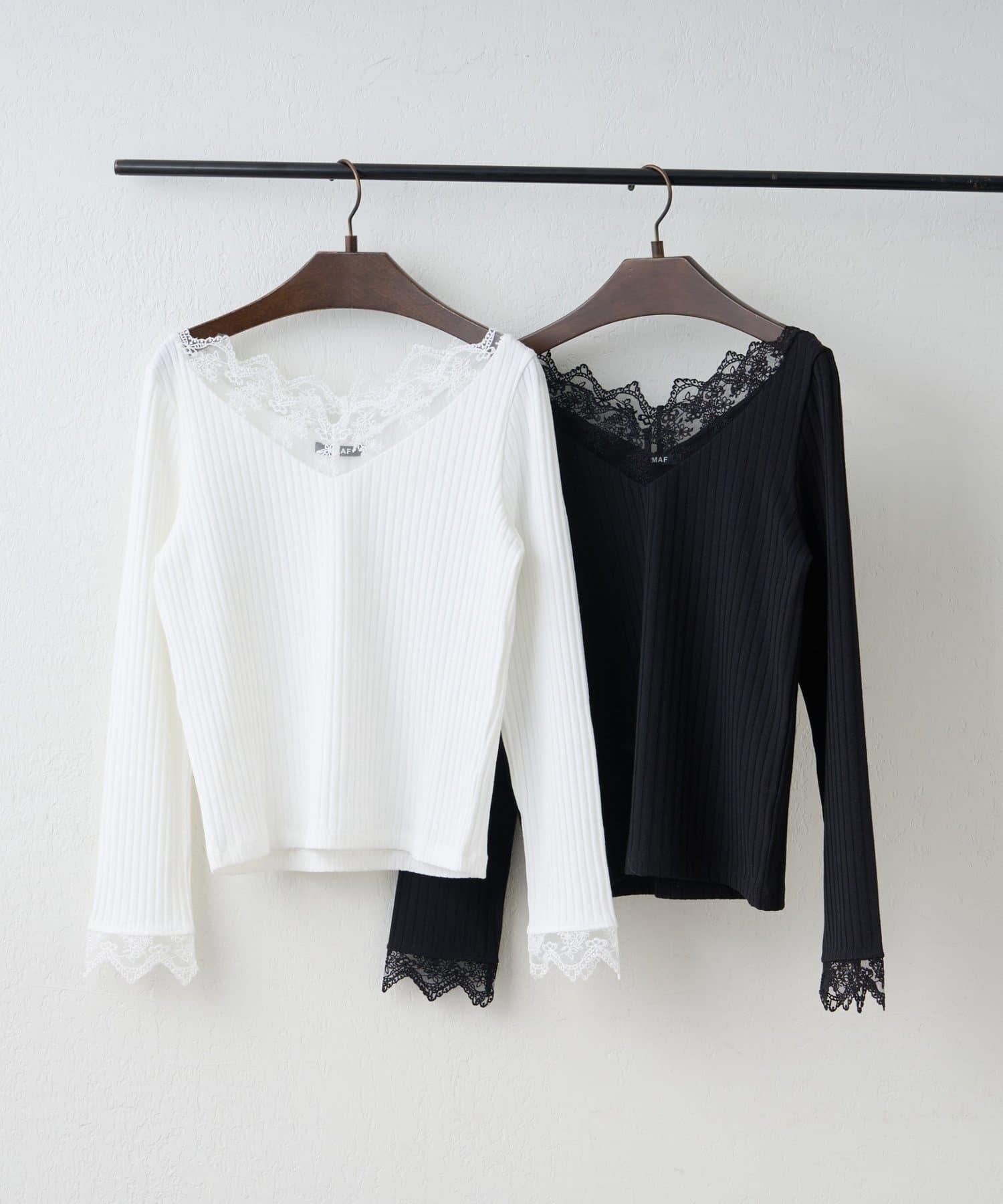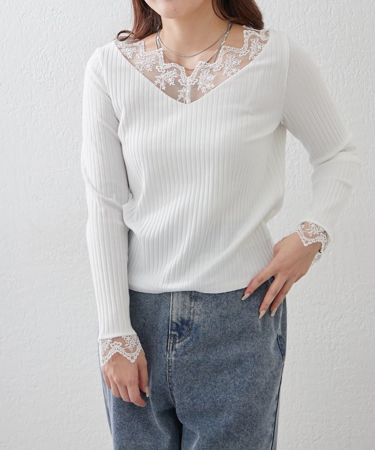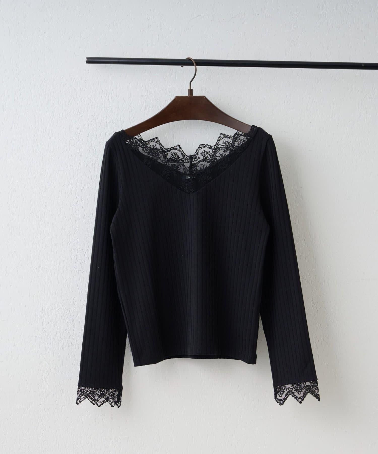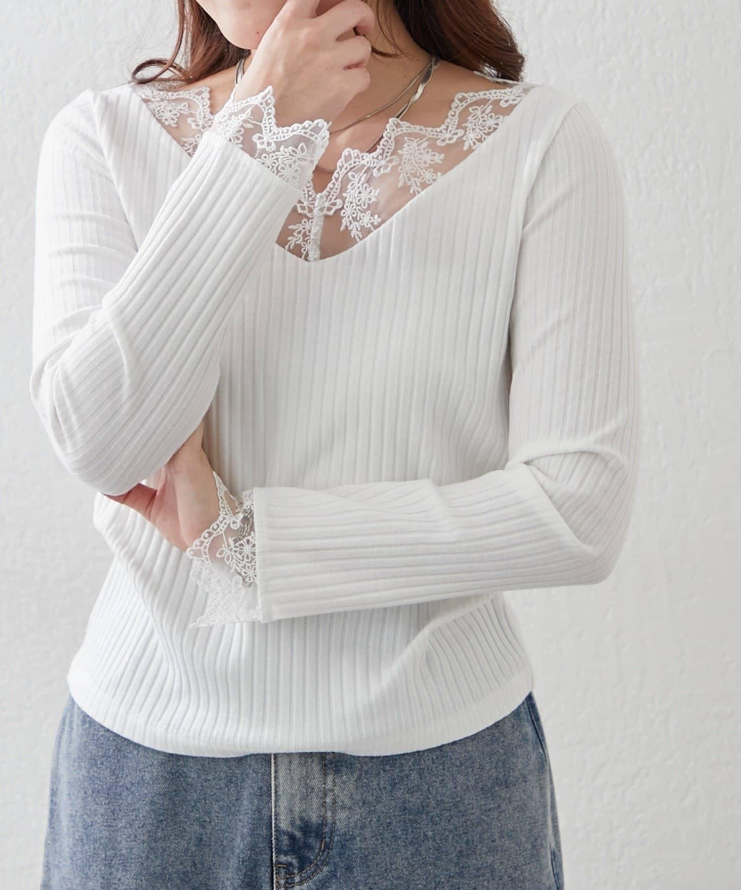 基礎款 羅紋 V字蕾絲 長袖套頭上衣