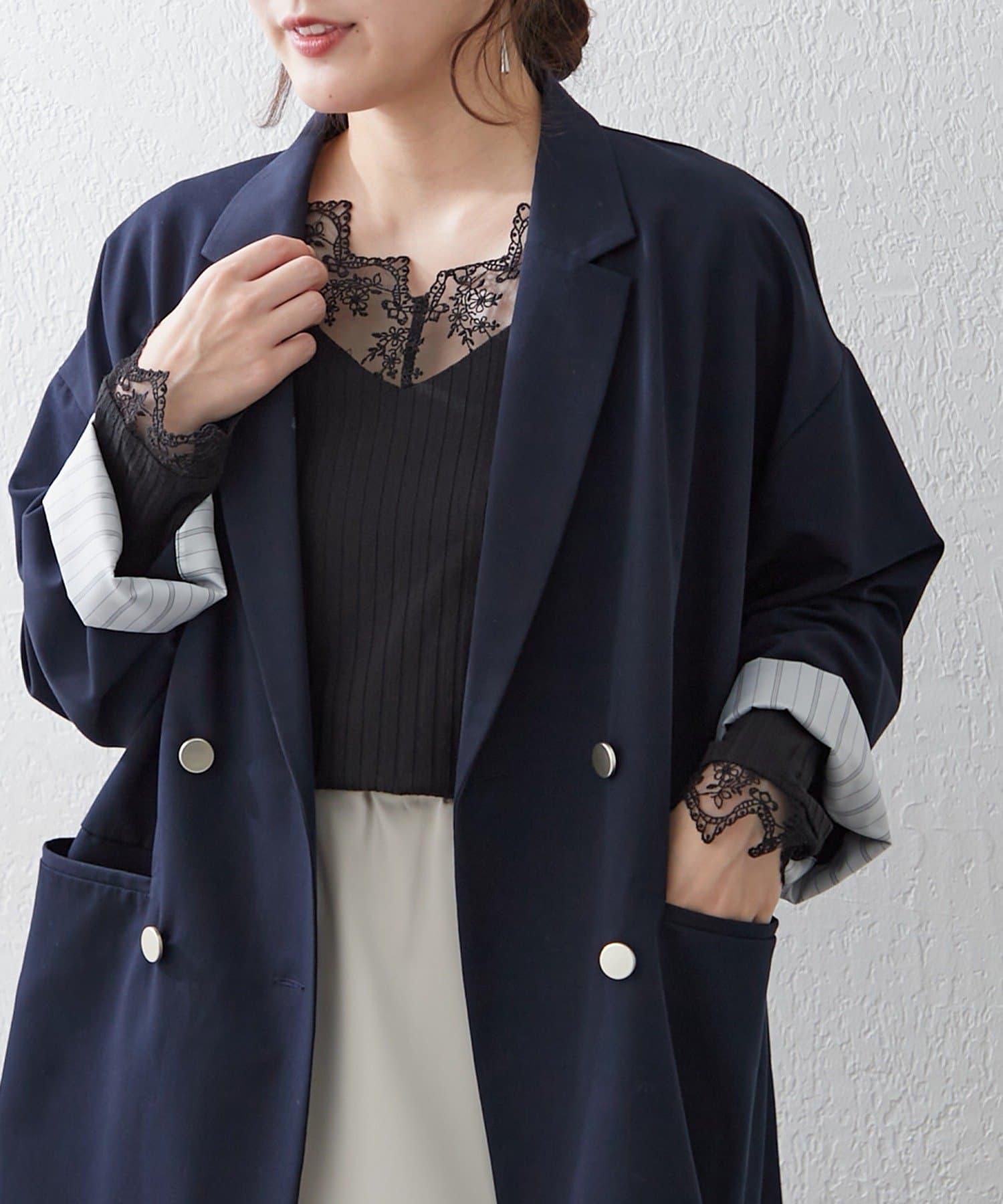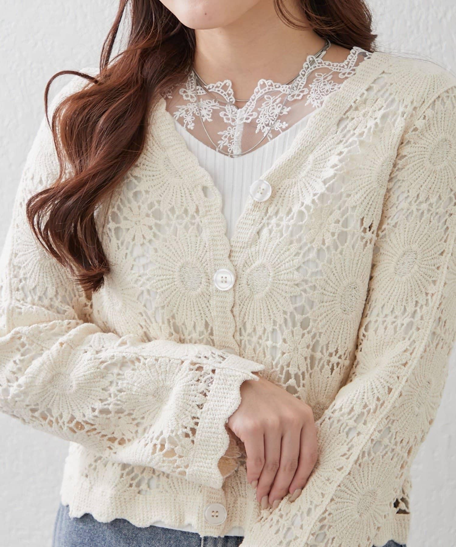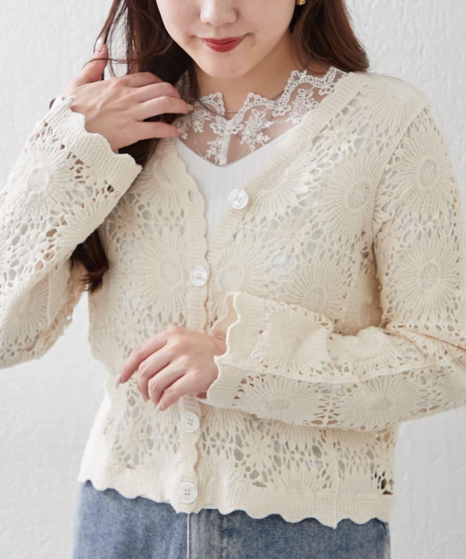 蕾絲對接設計讓這件上衣單穿也很好看。