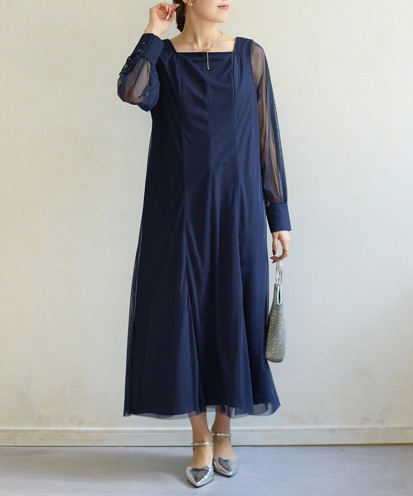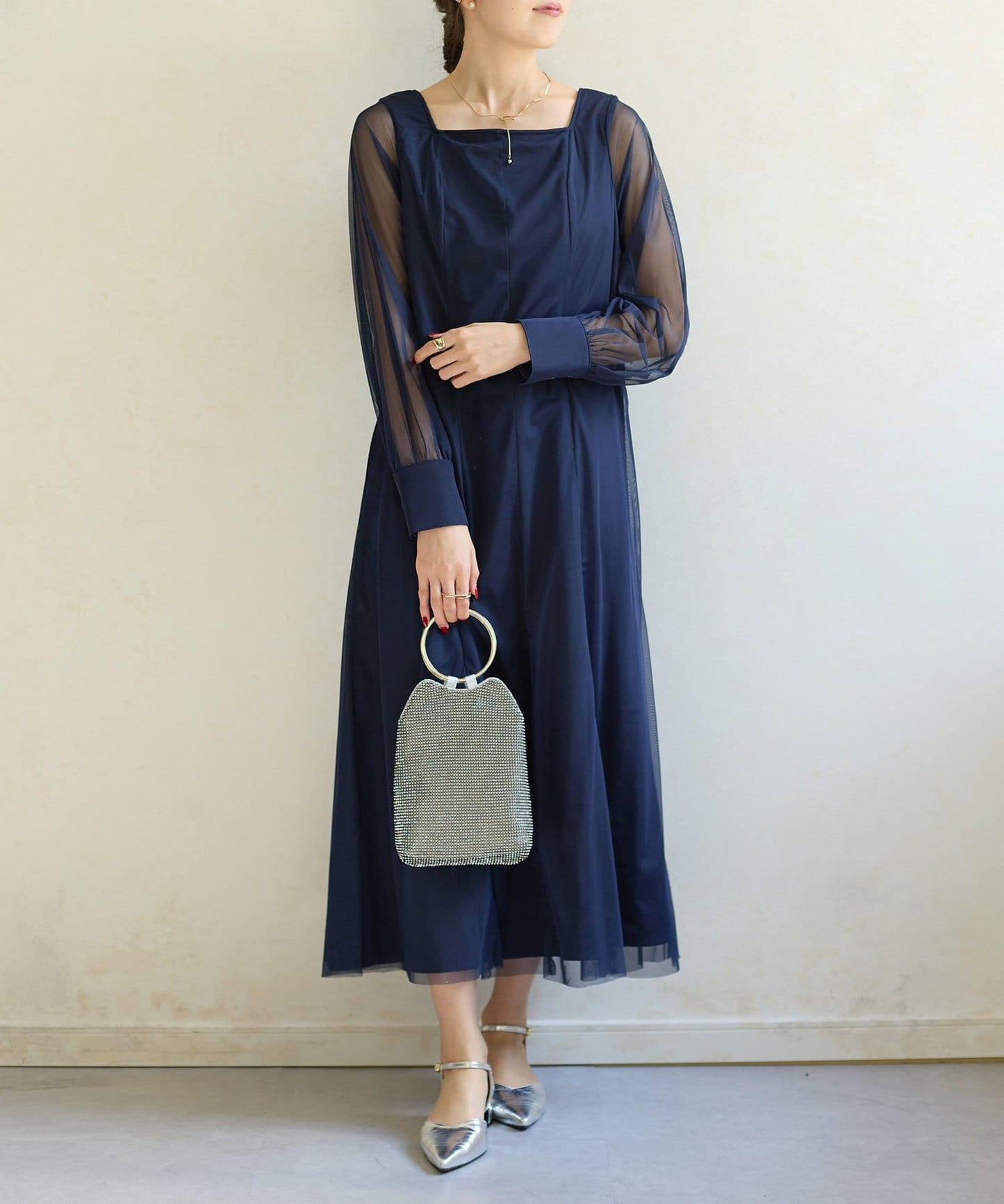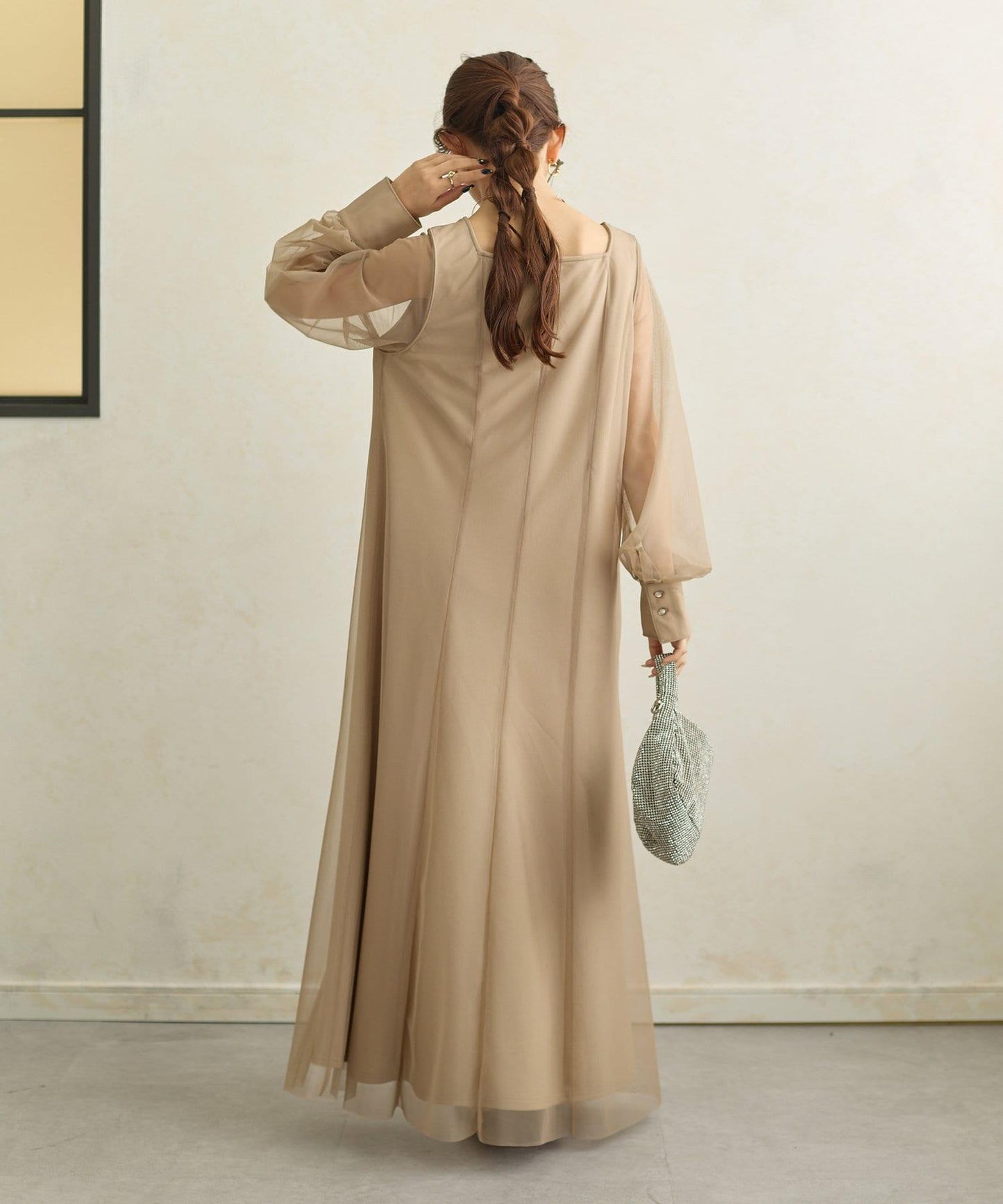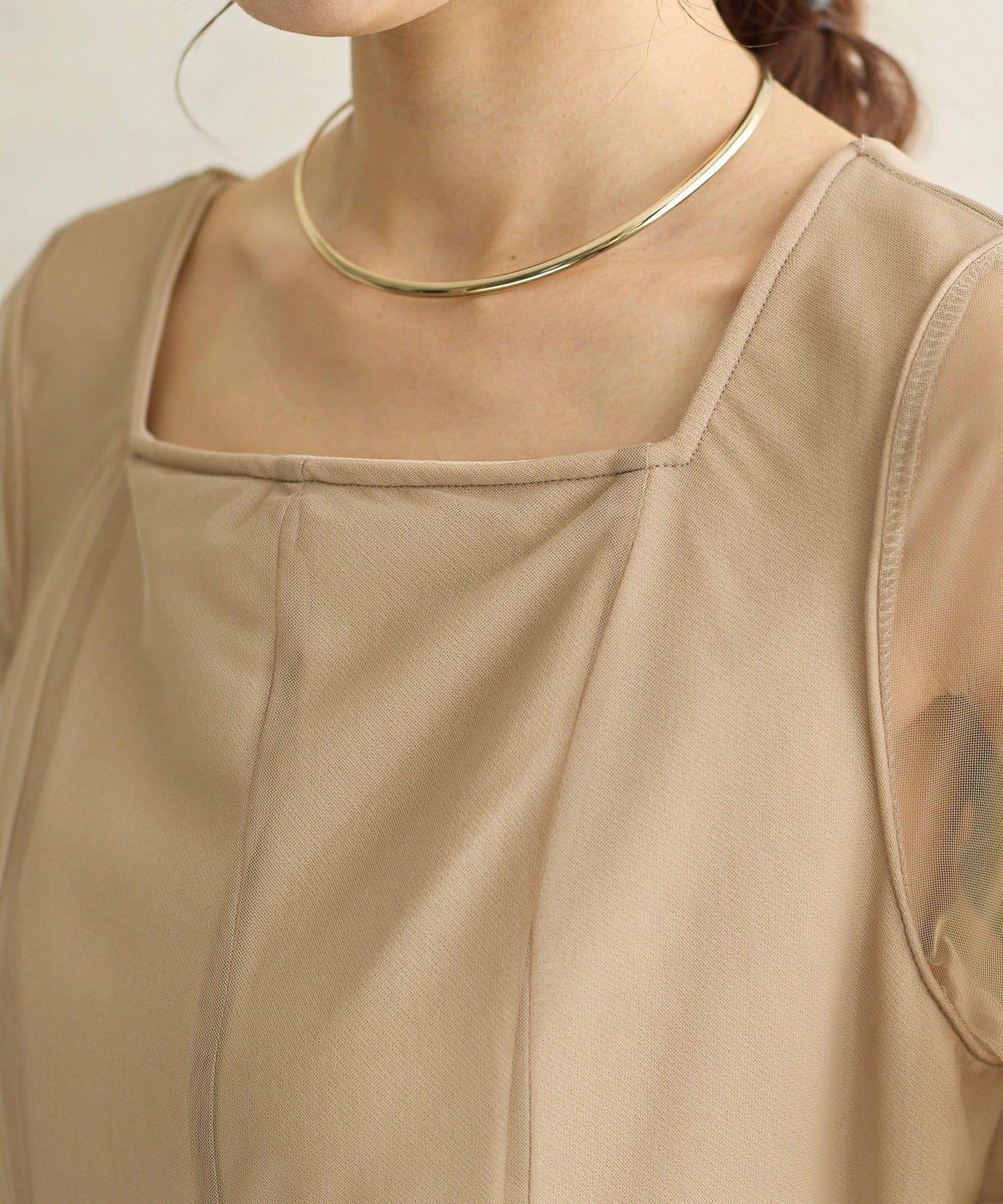 這款連衣裙的肩頸部線條優美,項鍊與之相得益彰。