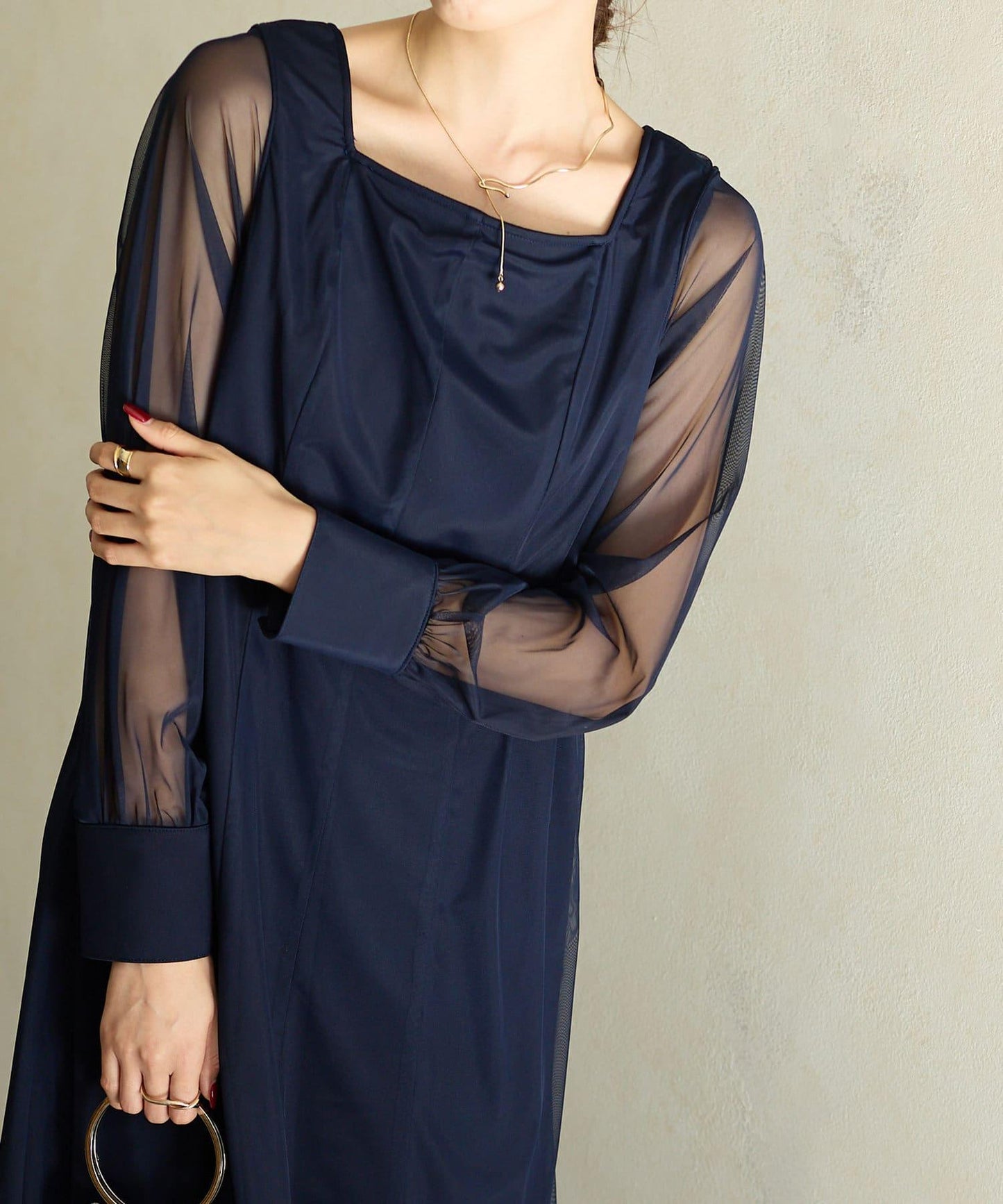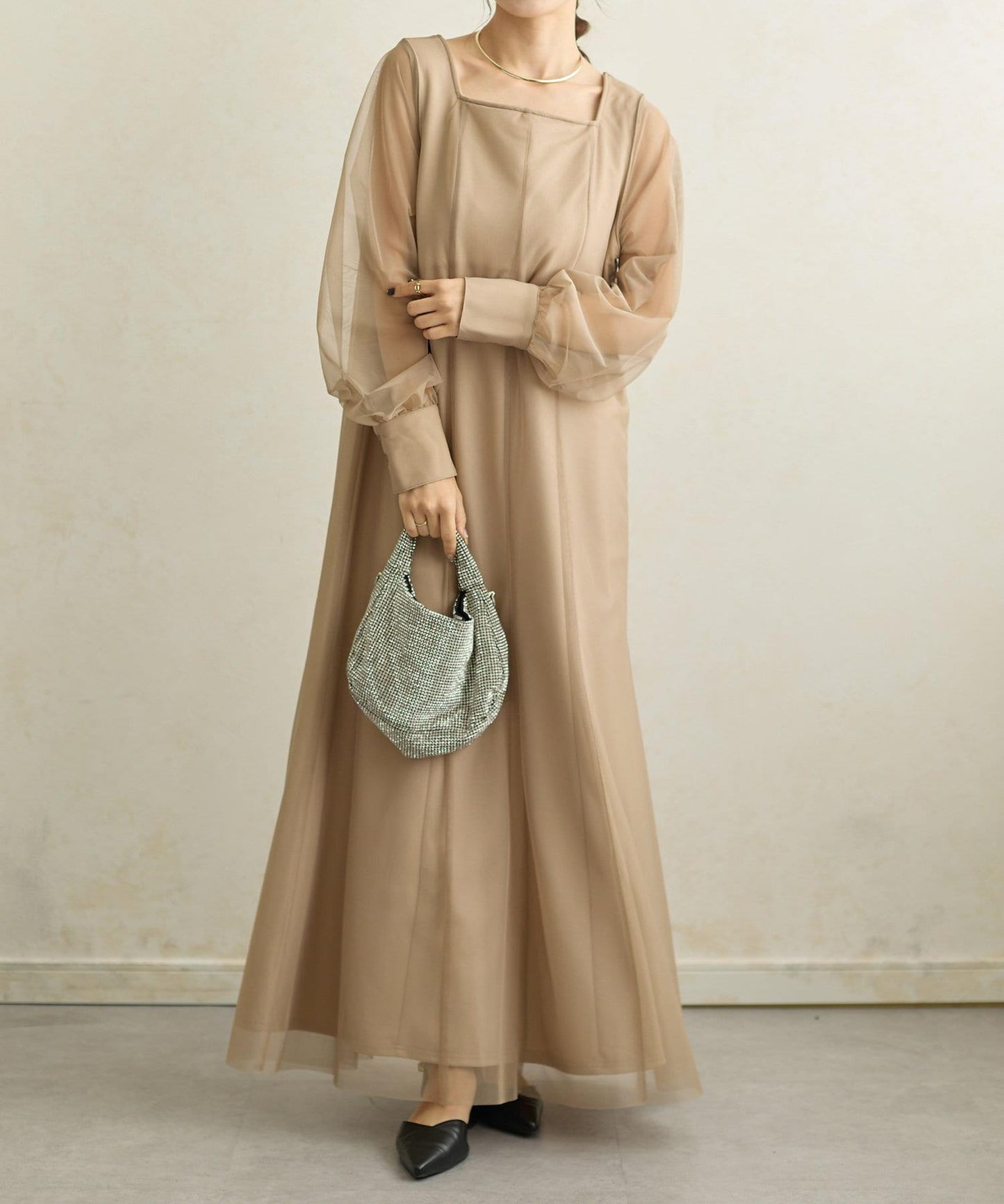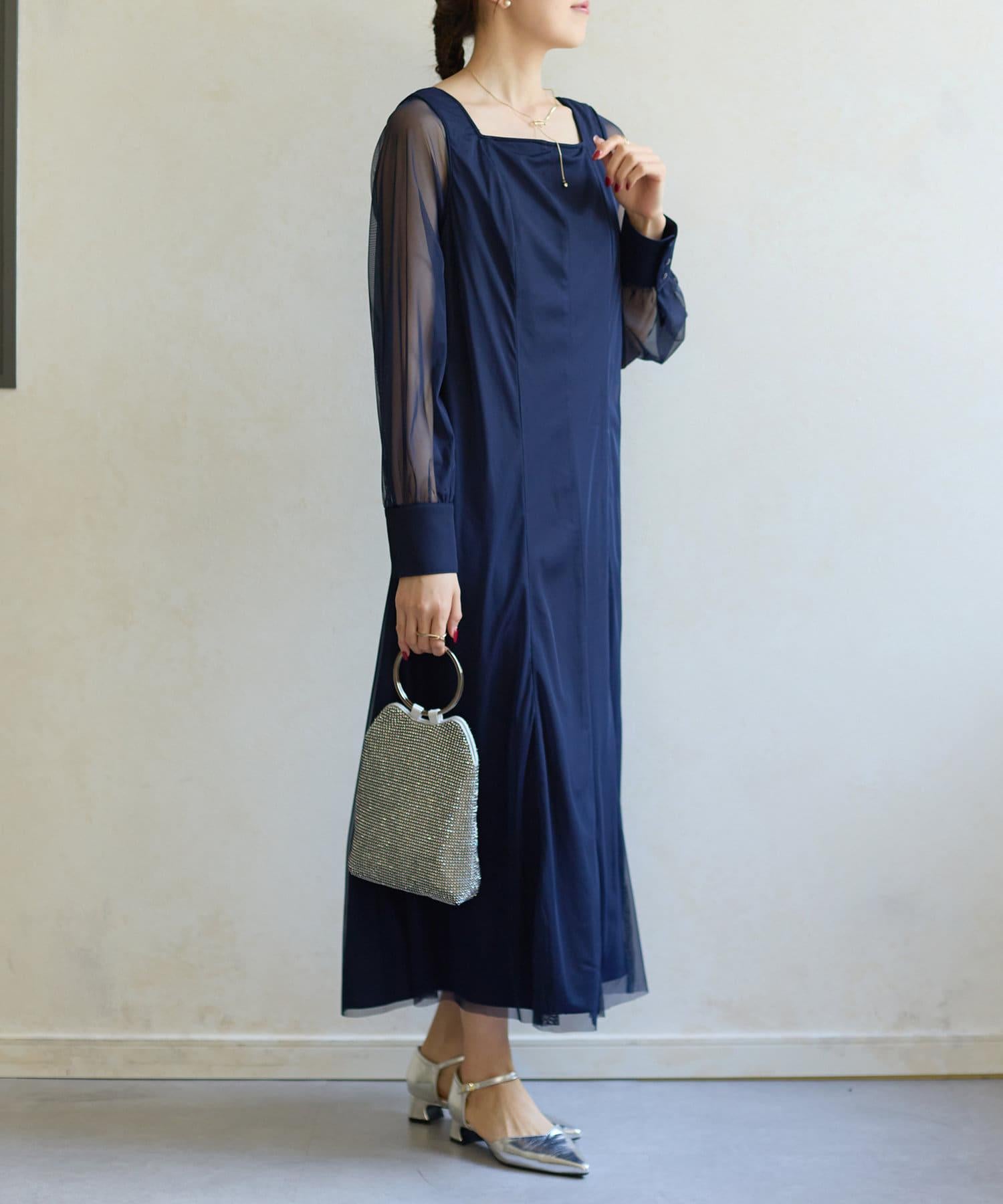 這款連衣裙的肩頸部線條優美,項鍊與之相得益彰。