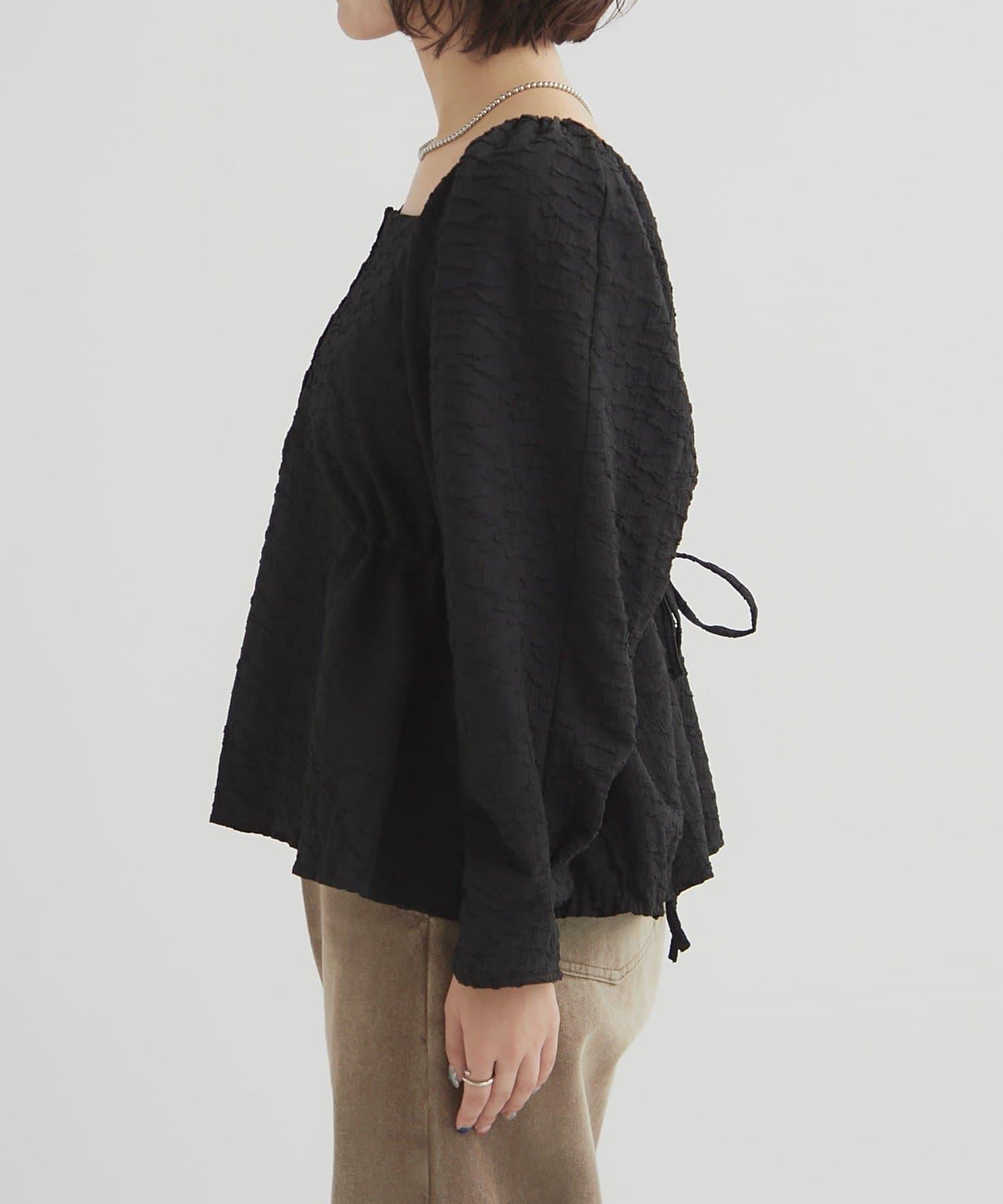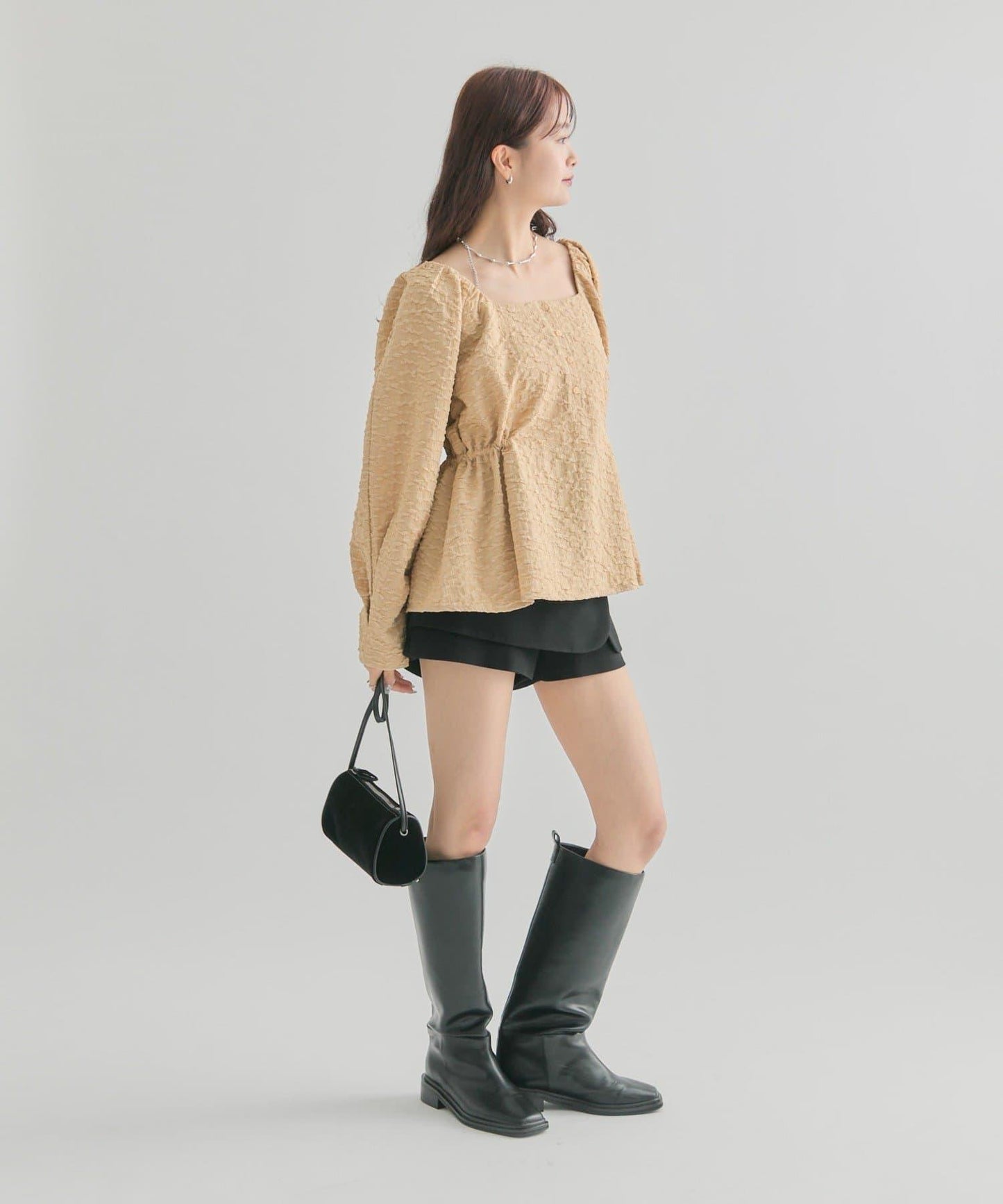 頸部的方形領口勾勒出優美的肩部線條,給人以乾淨利落的印象。