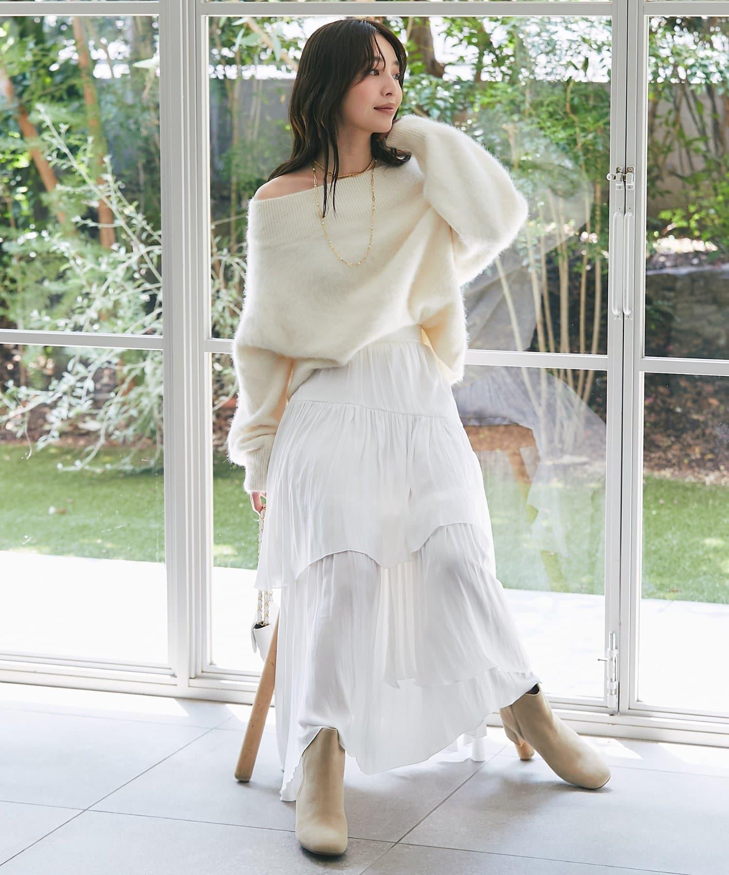 露肩針織衫,寬鬆的設計增加女性的力量感。