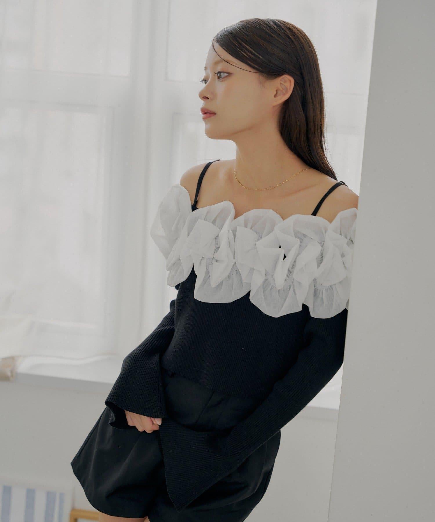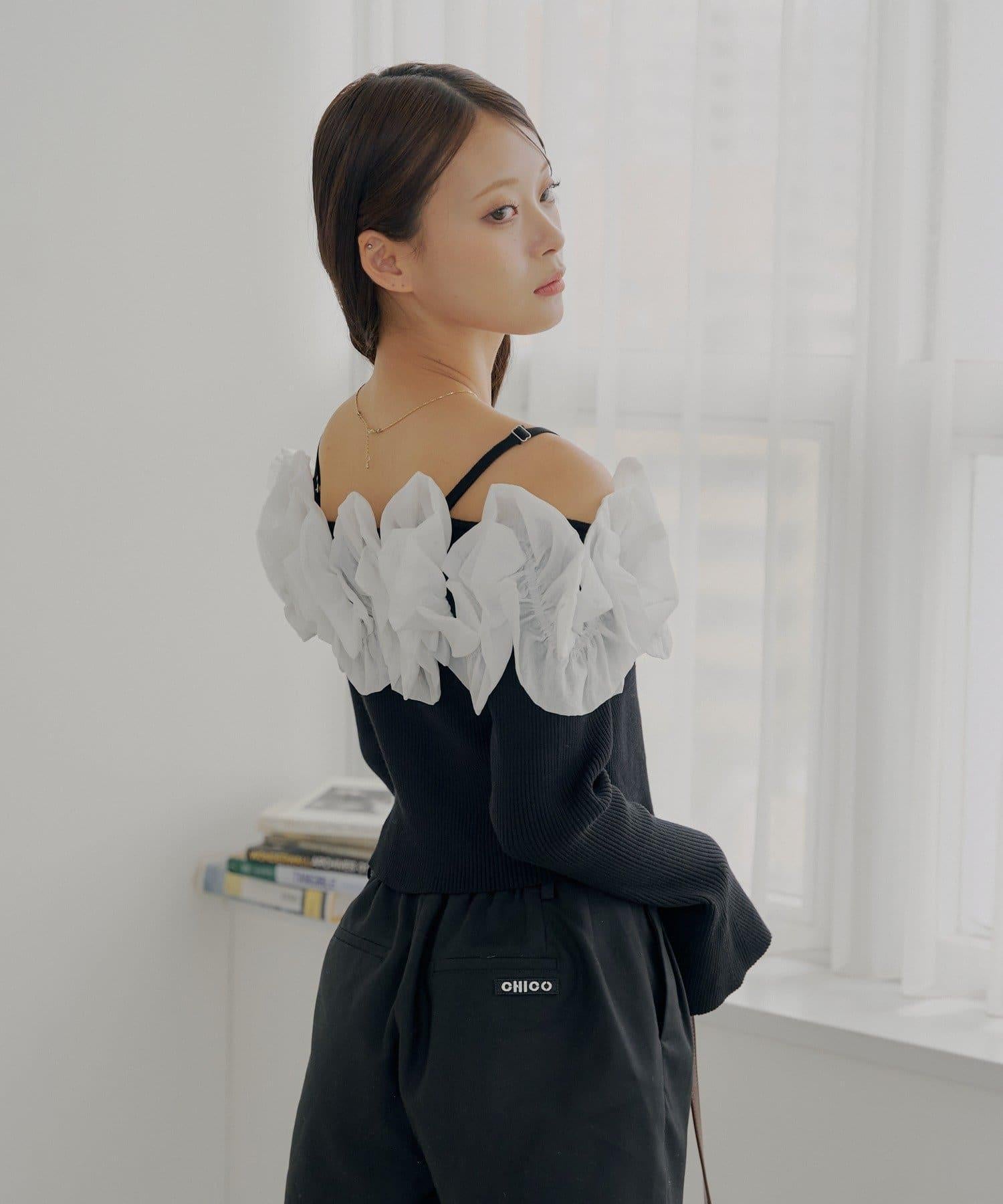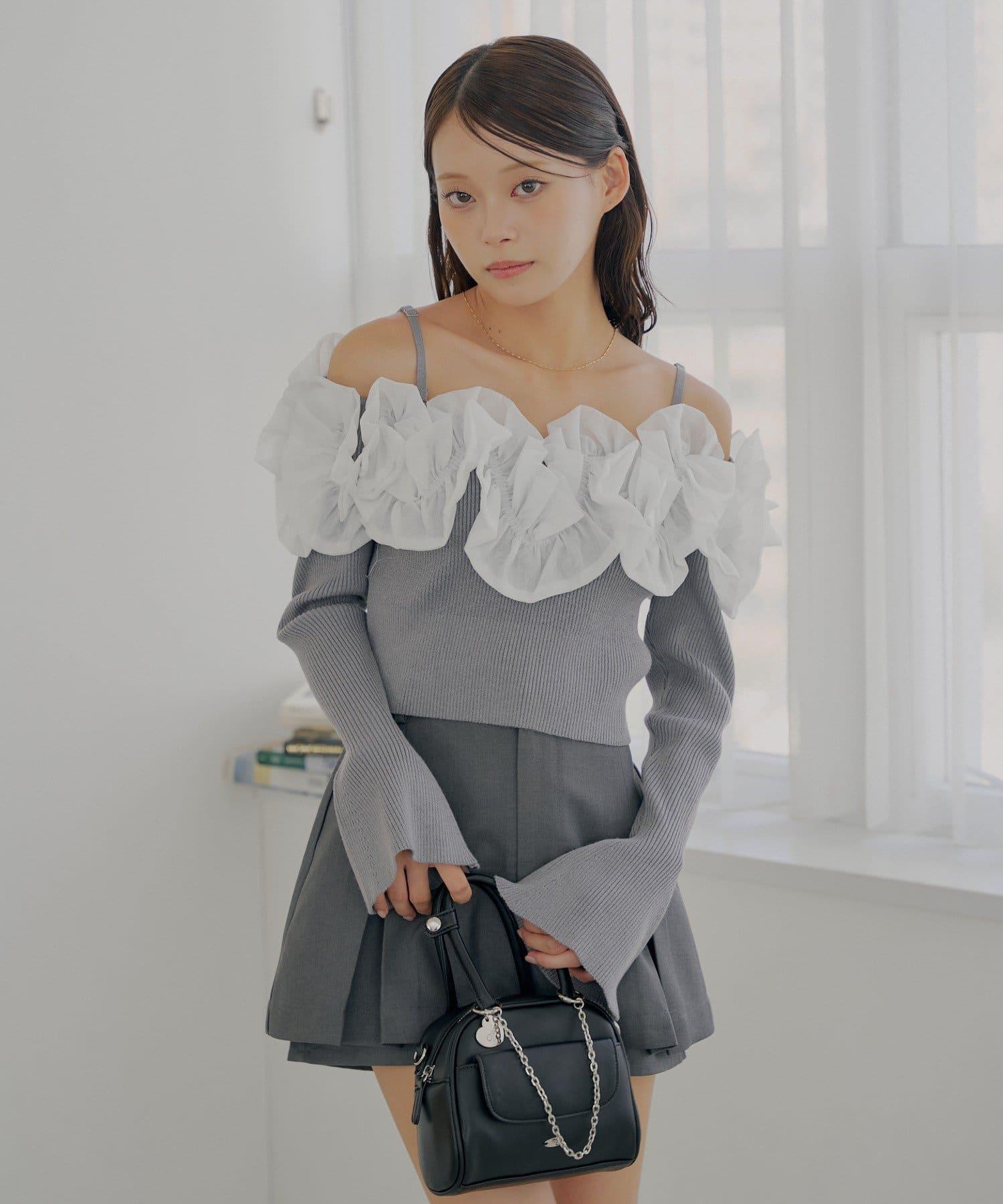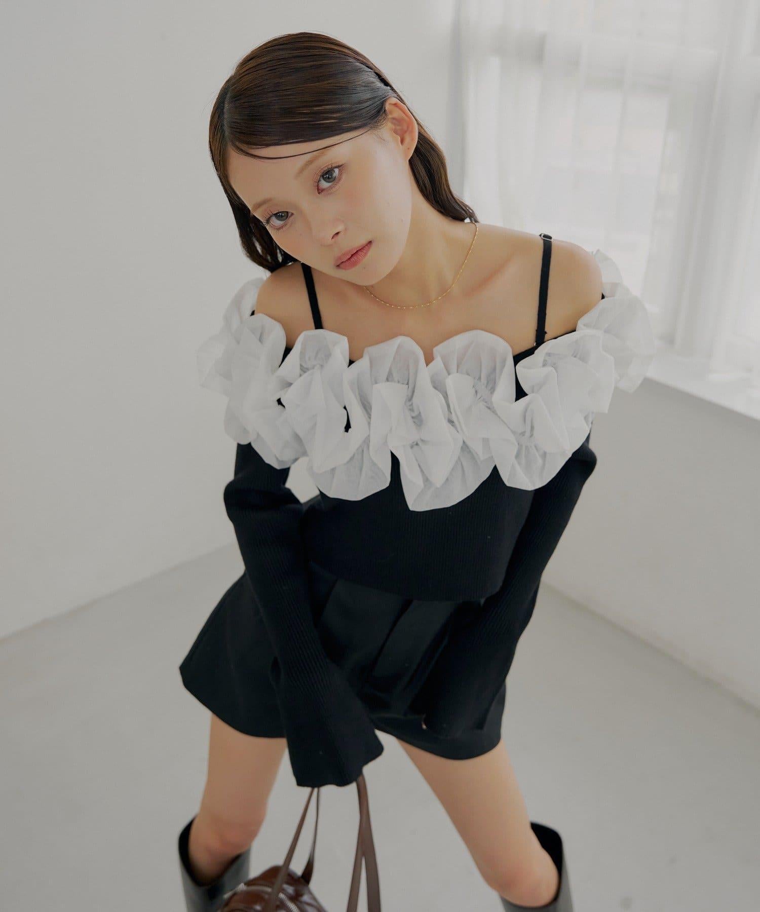 簡潔的羅紋針織衫與蓬鬆的荷葉邊形成鮮明對比,非常吸引人。