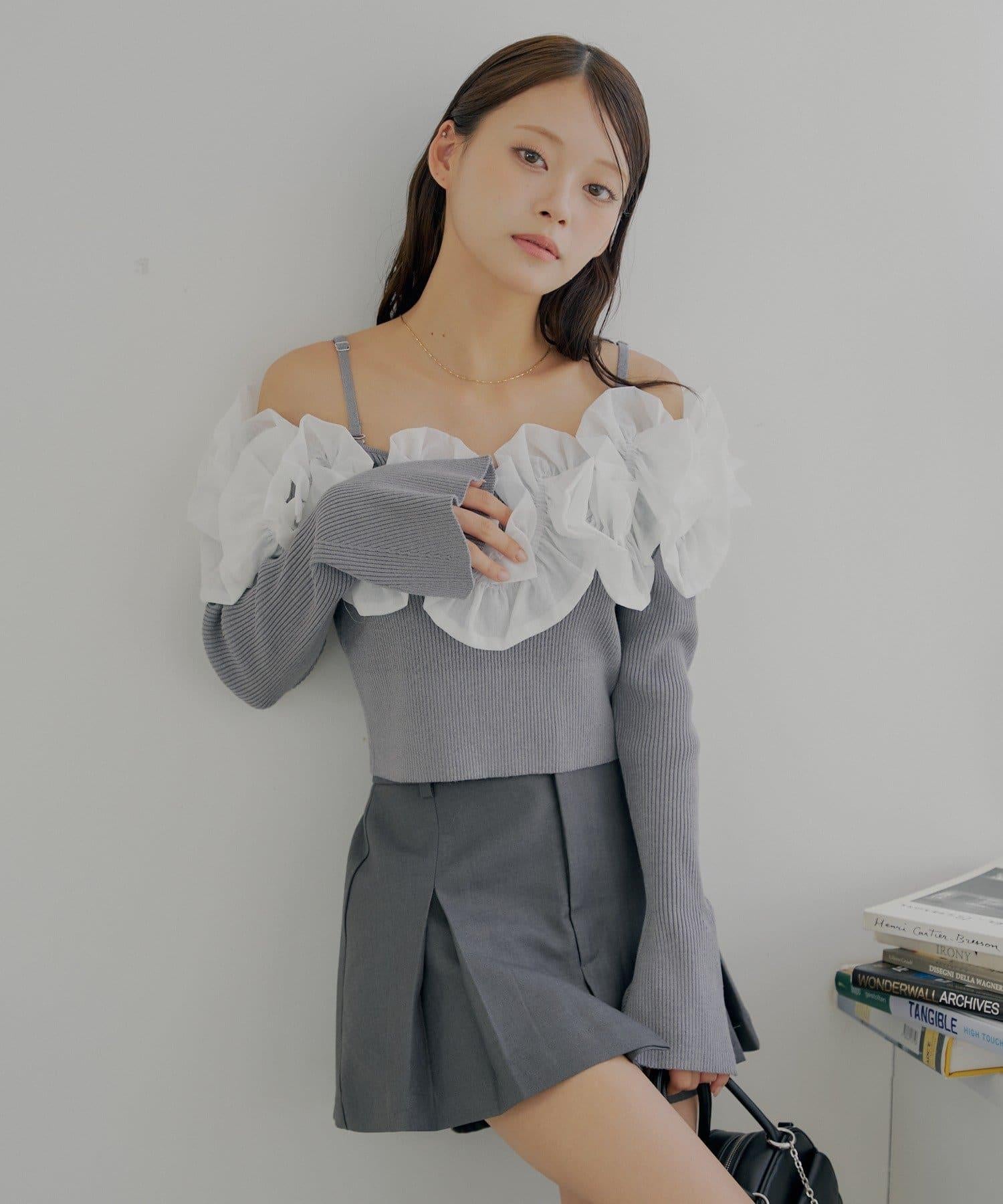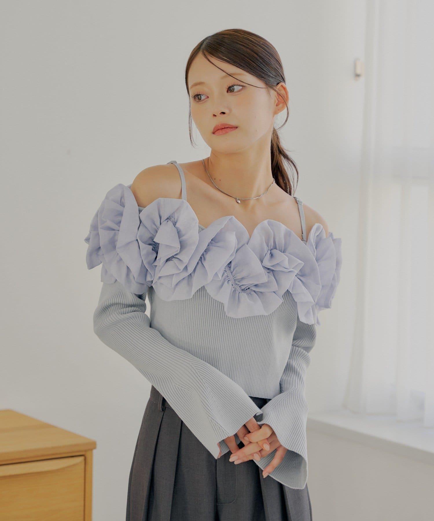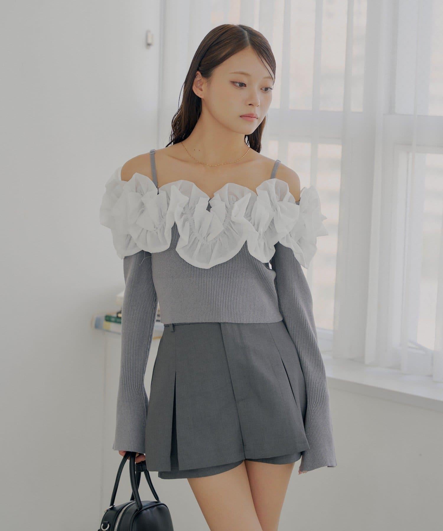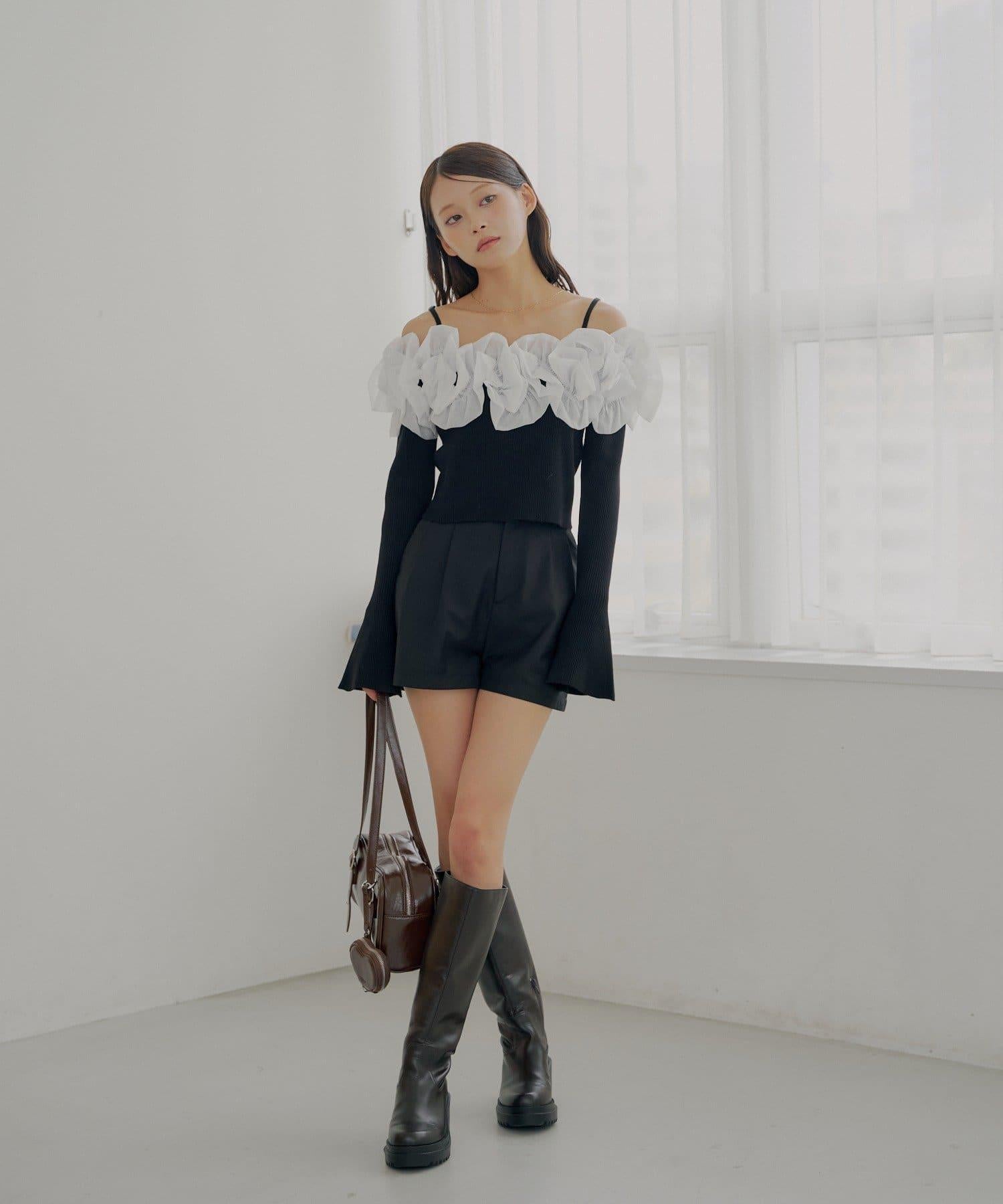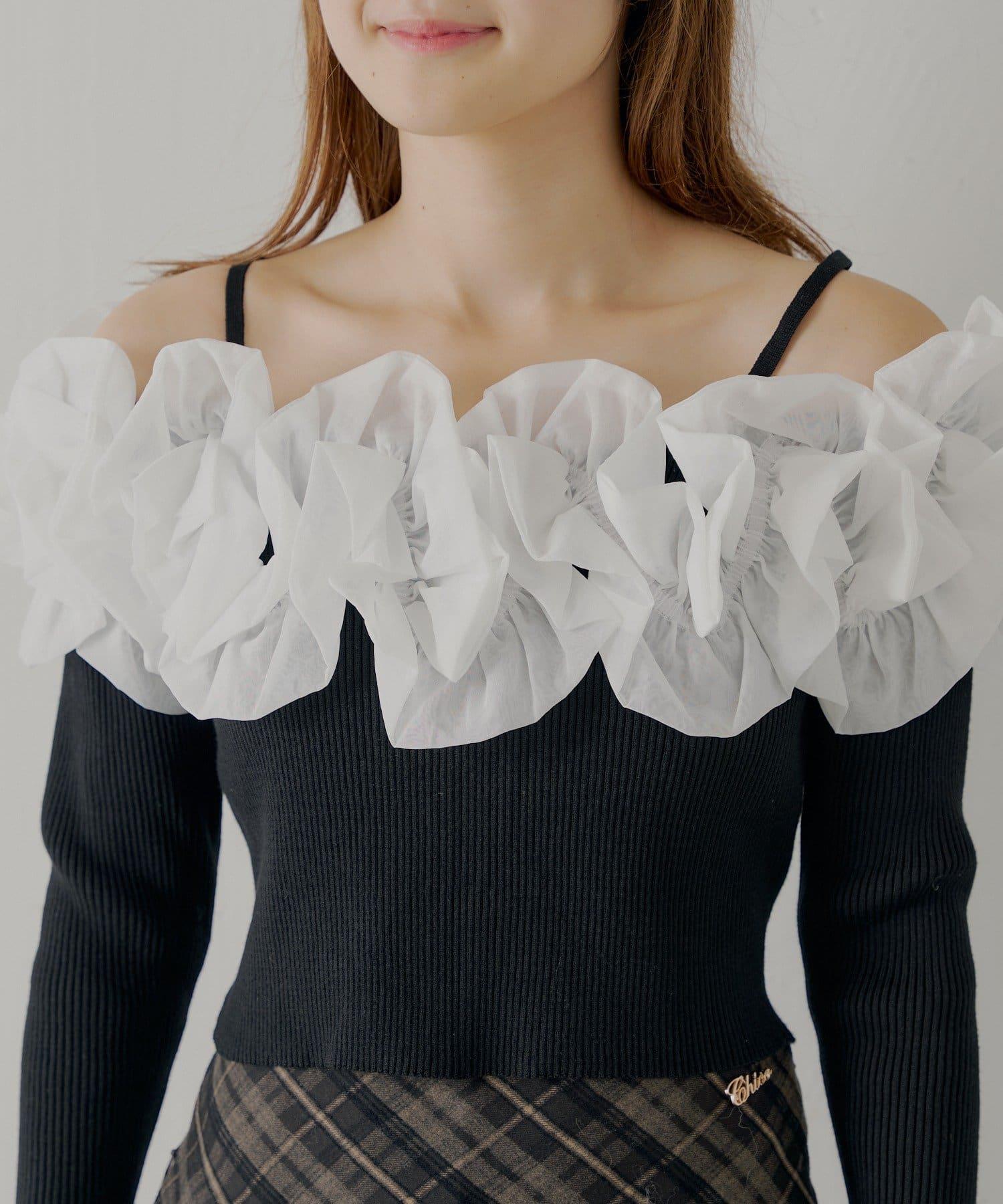 簡潔的羅紋針織衫與蓬鬆的荷葉邊形成鮮明對比,非常吸引人。