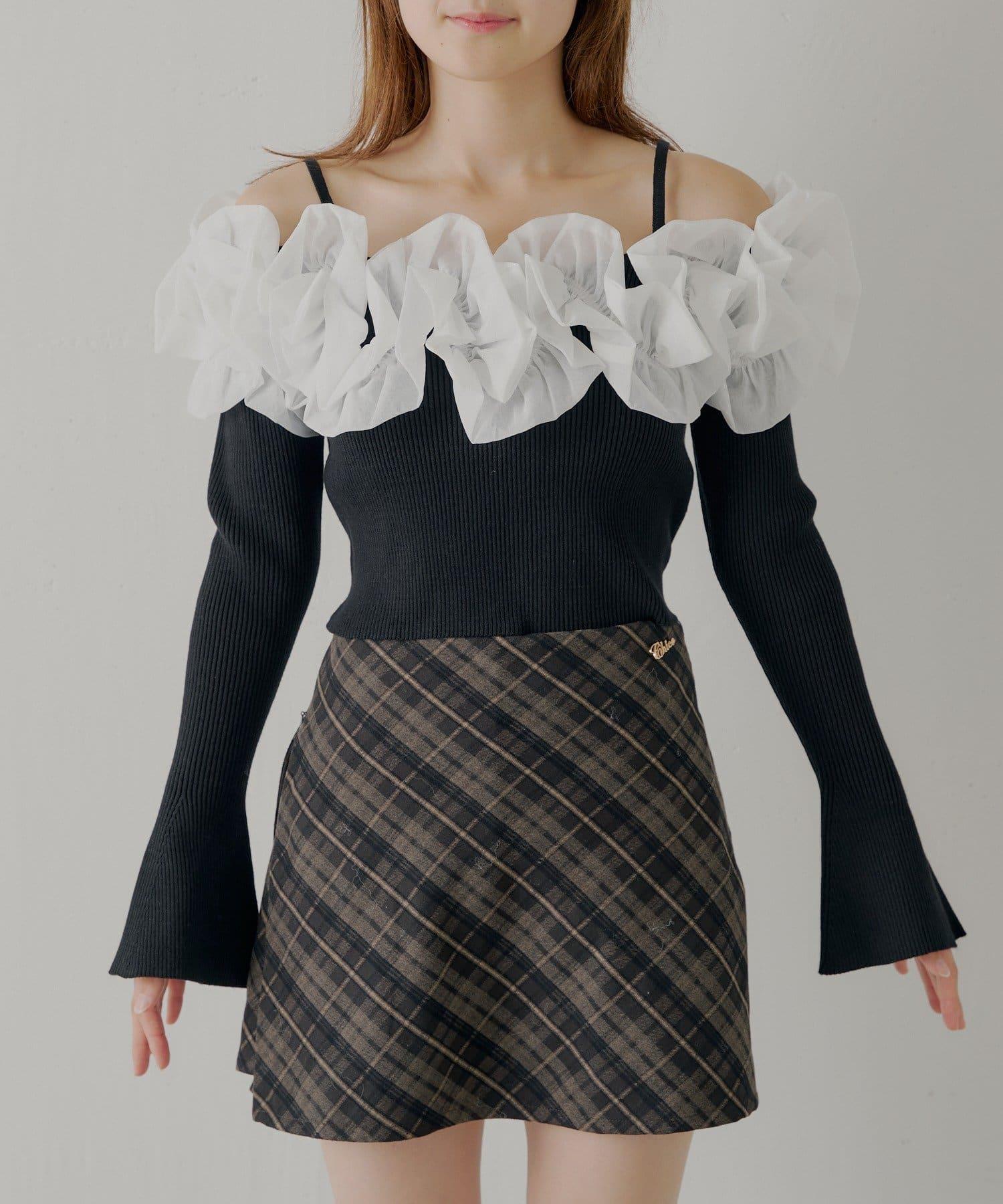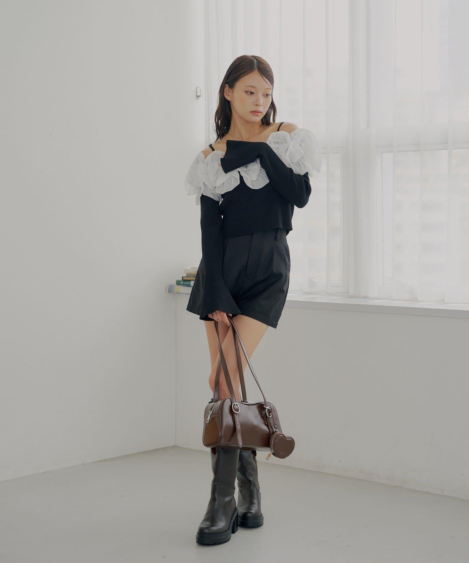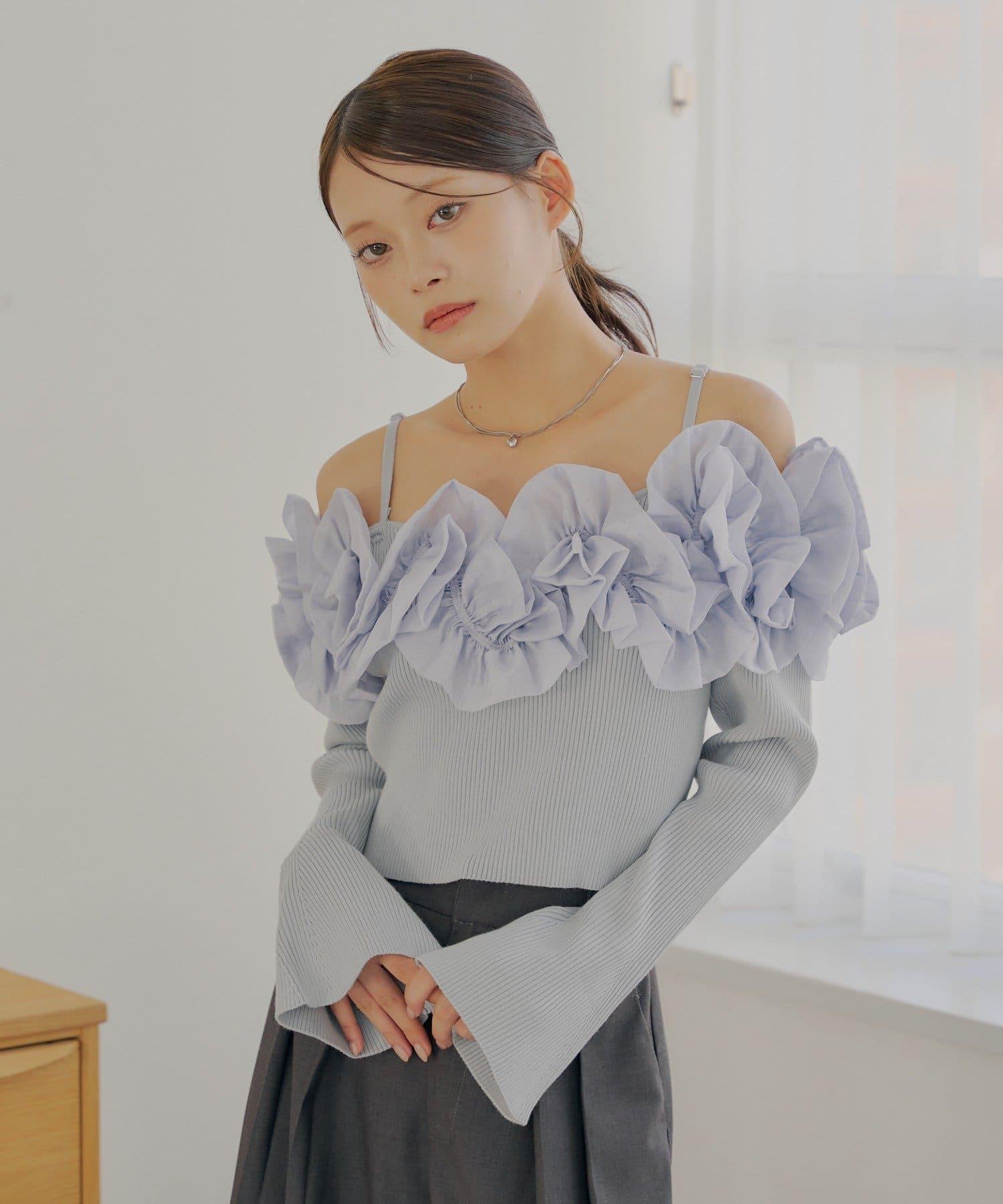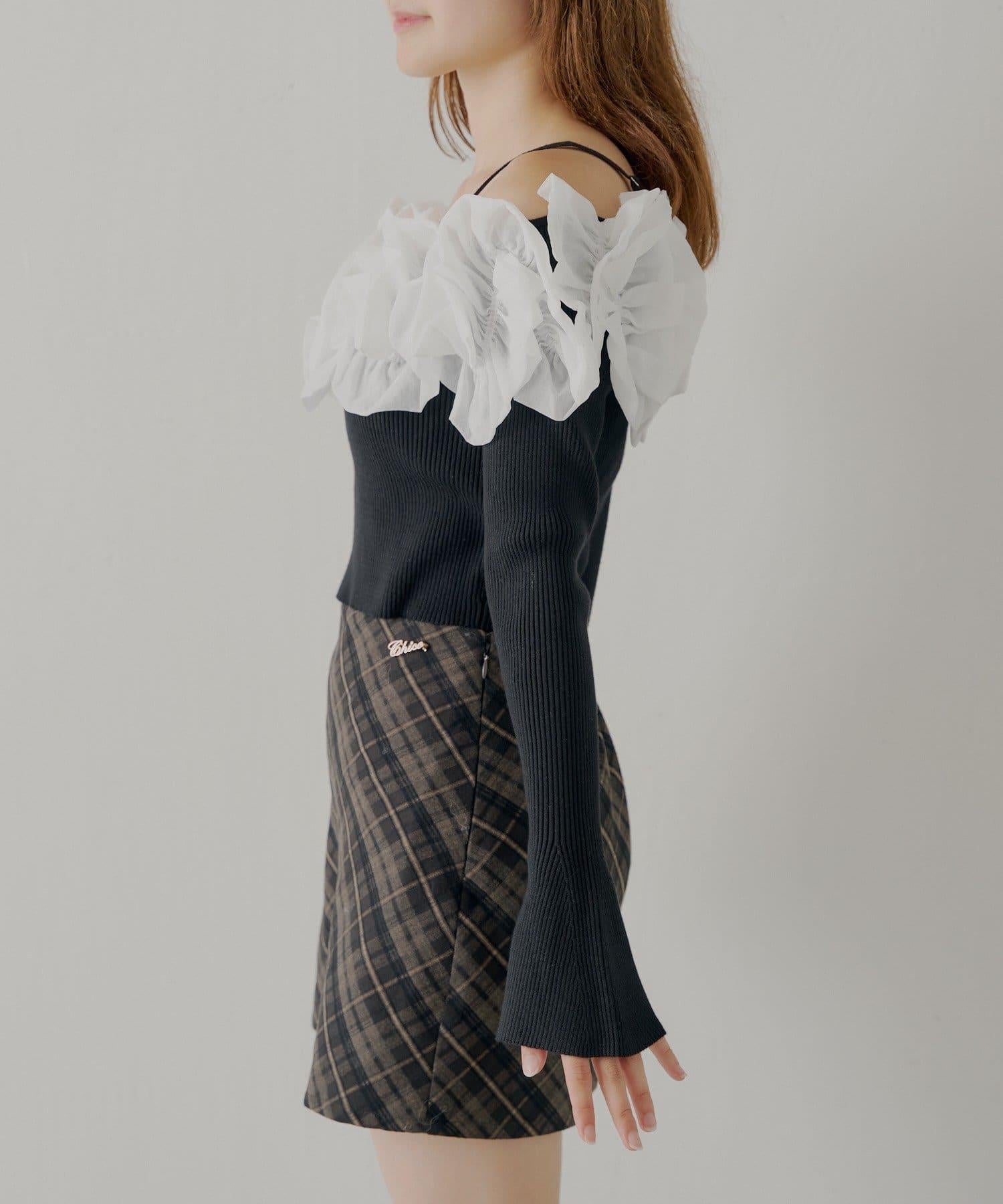 簡潔的羅紋針織衫與蓬鬆的荷葉邊形成鮮明對比,非常吸引人。