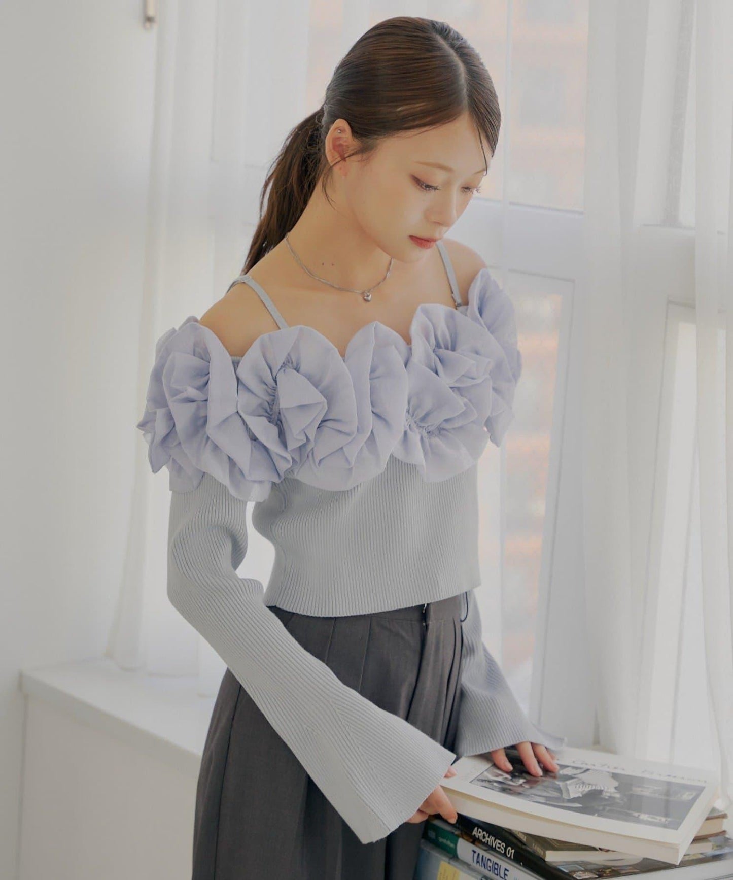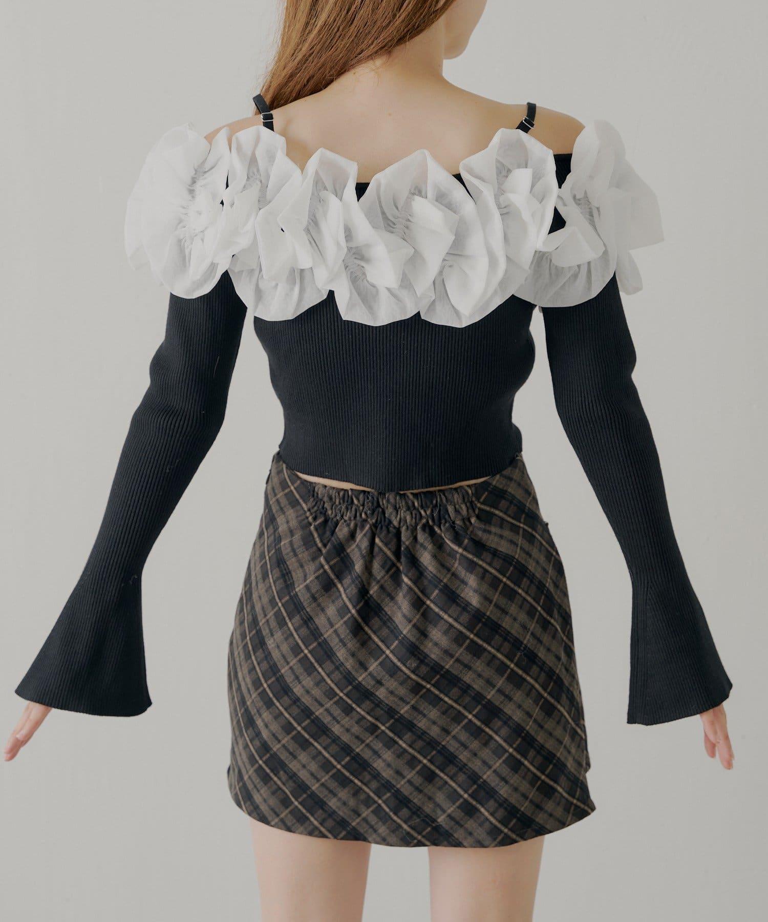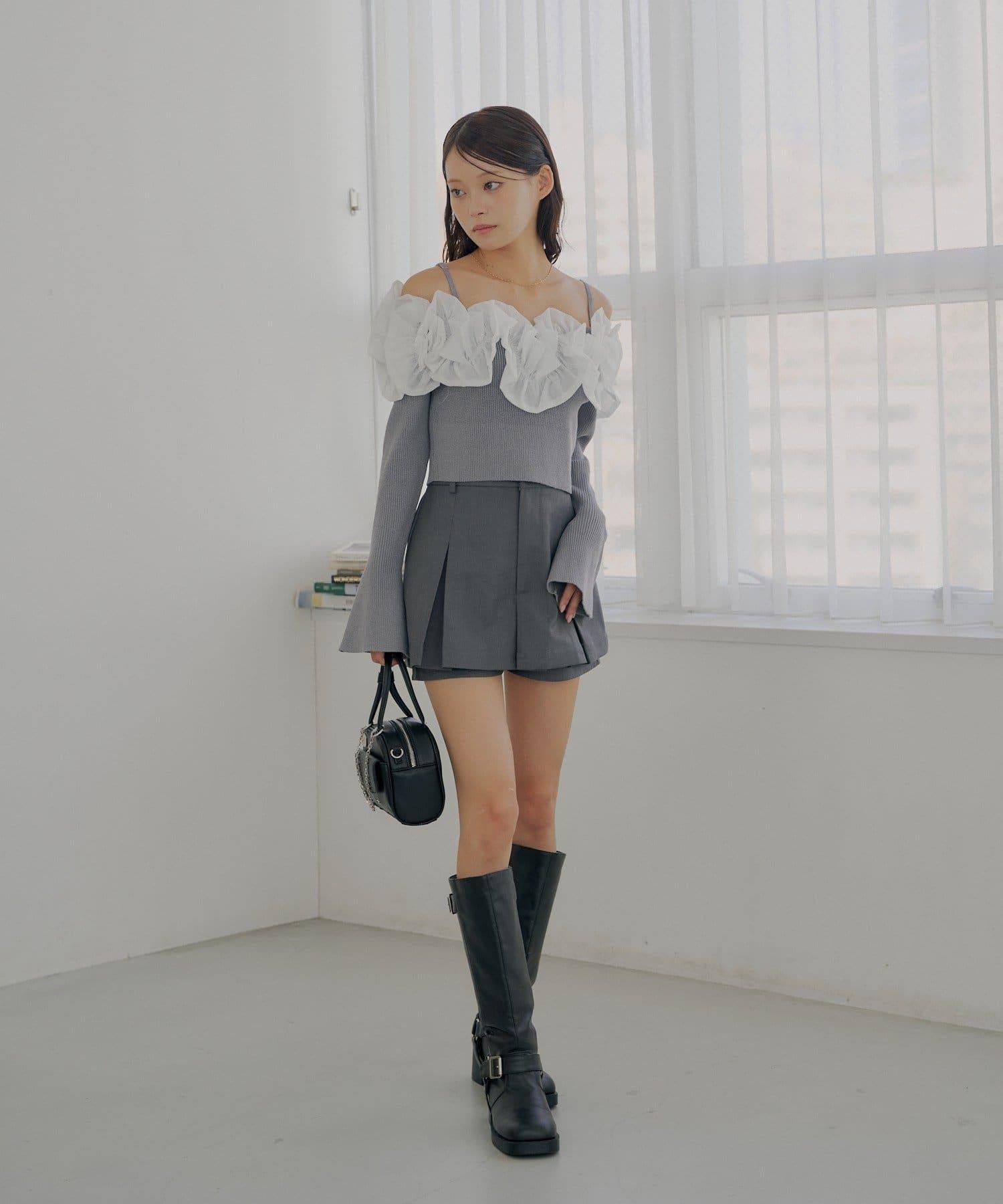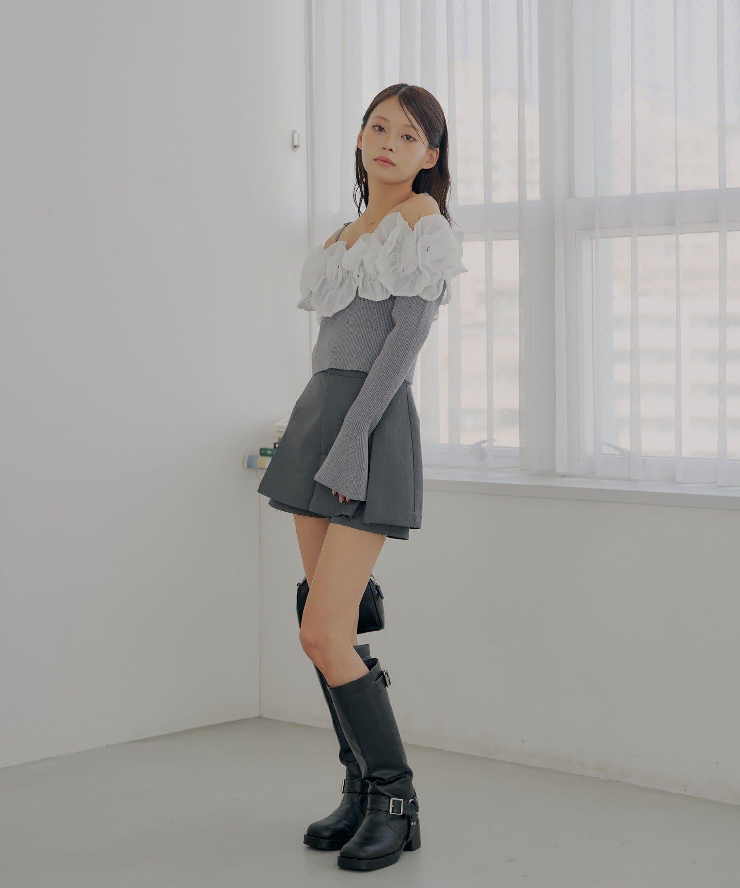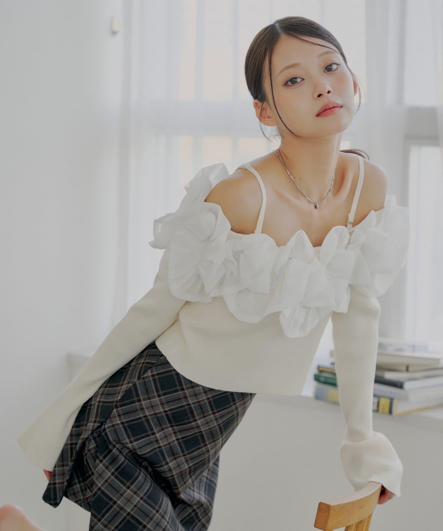 簡潔的羅紋針織衫與蓬鬆的荷葉邊形成鮮明對比,非常吸引人。