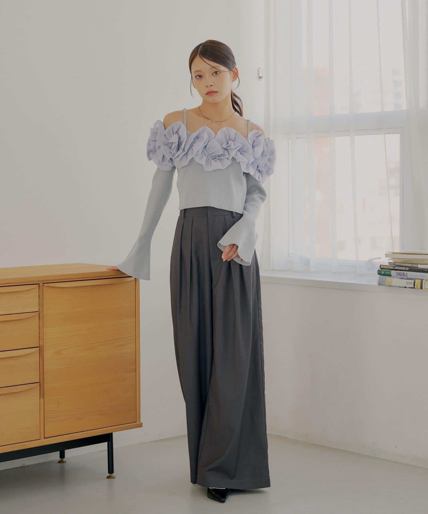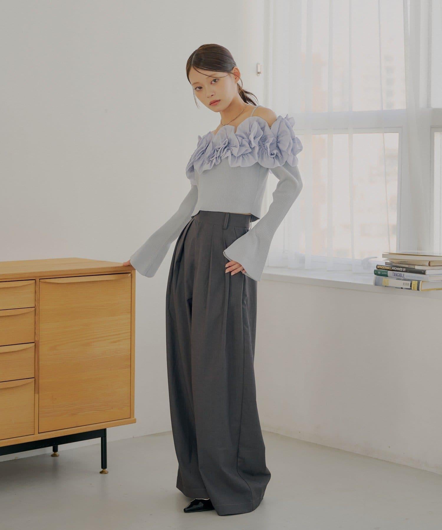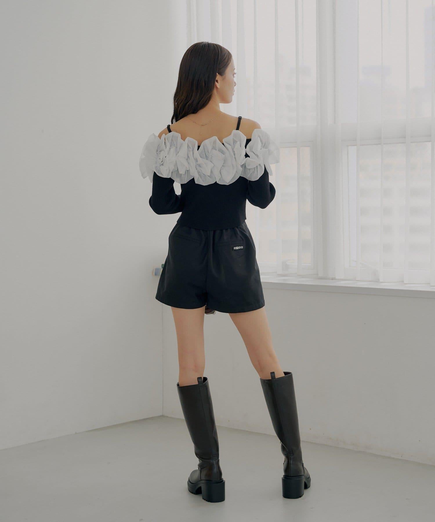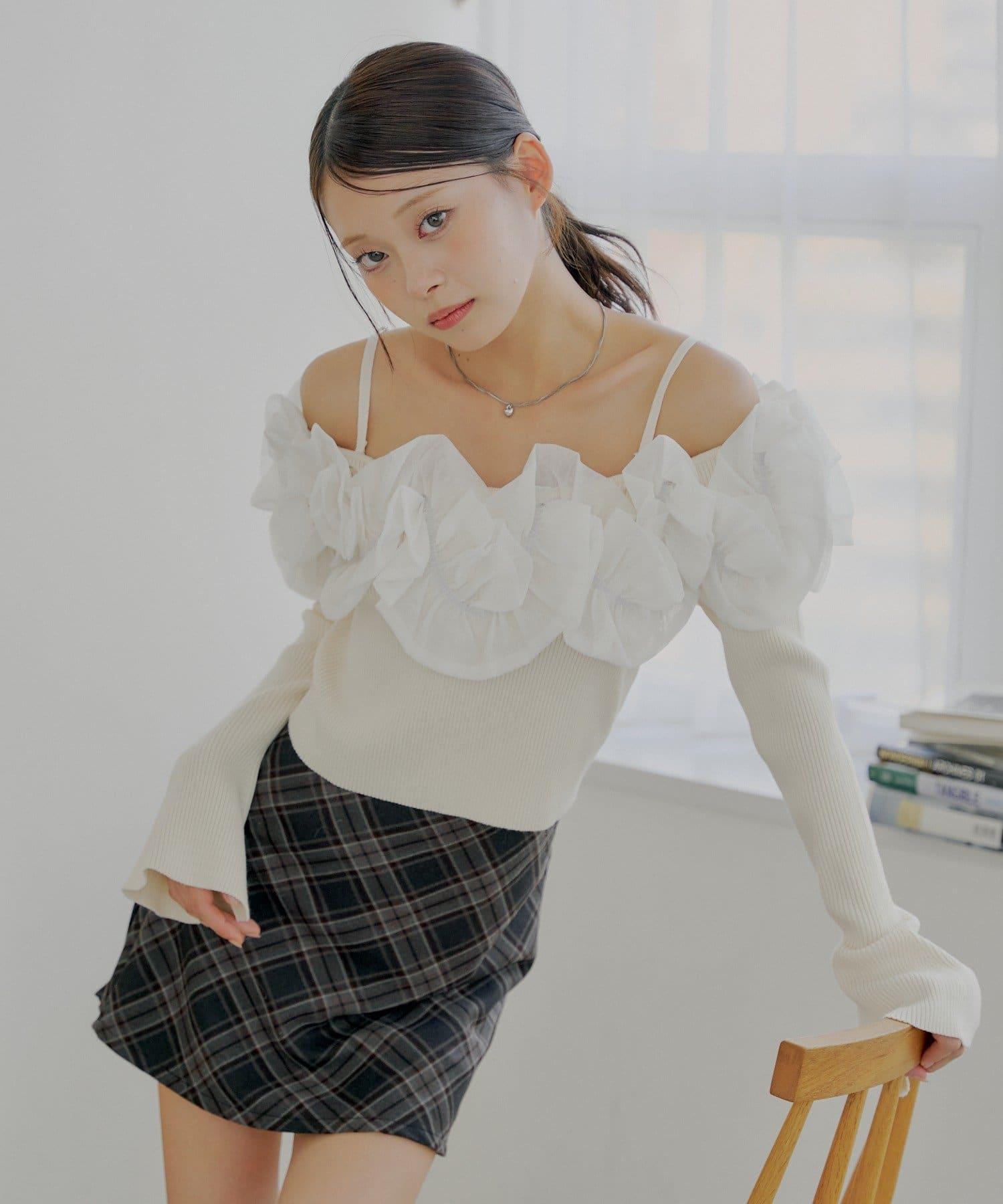 簡潔的羅紋針織衫與蓬鬆的荷葉邊形成鮮明對比,非常吸引人。
