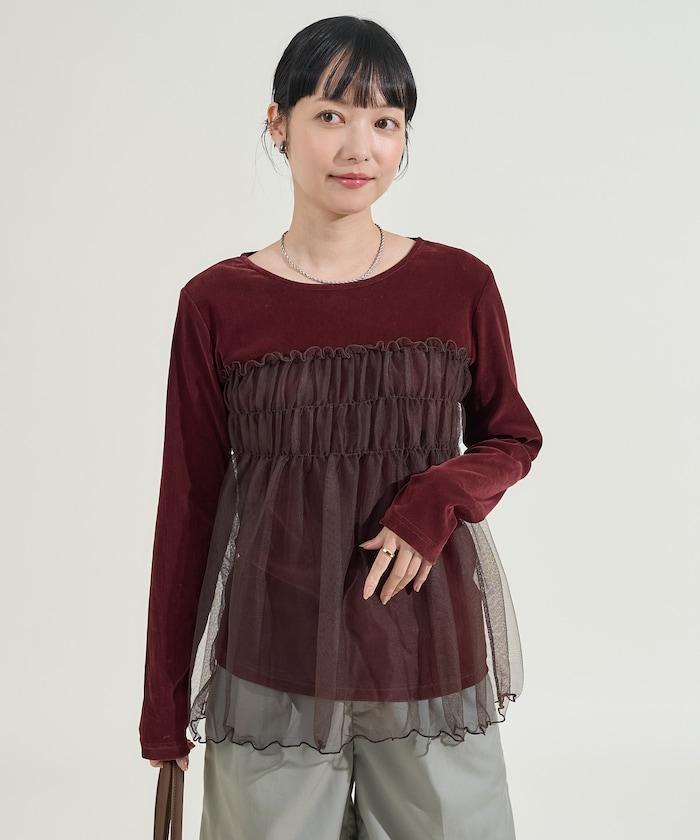 啞光絲絨質地和輕盈薄紗構成了這款不同材質對接剪裁縫製的上衣。