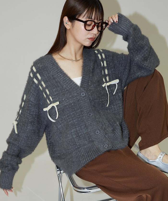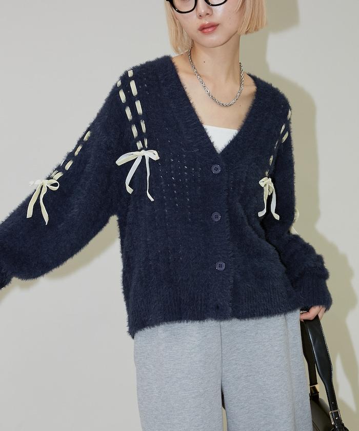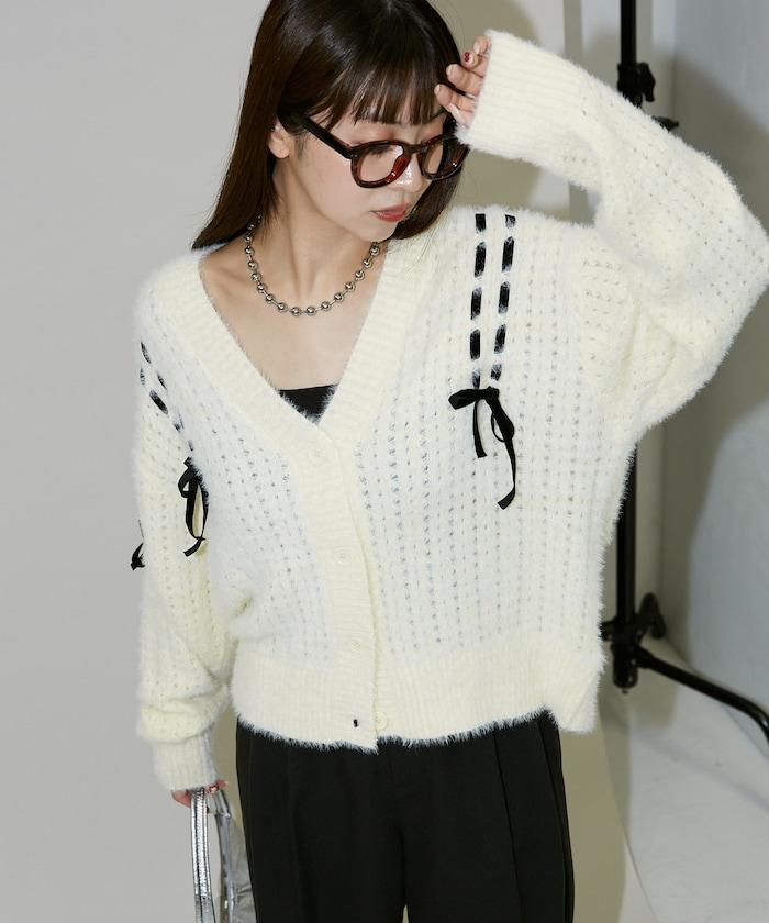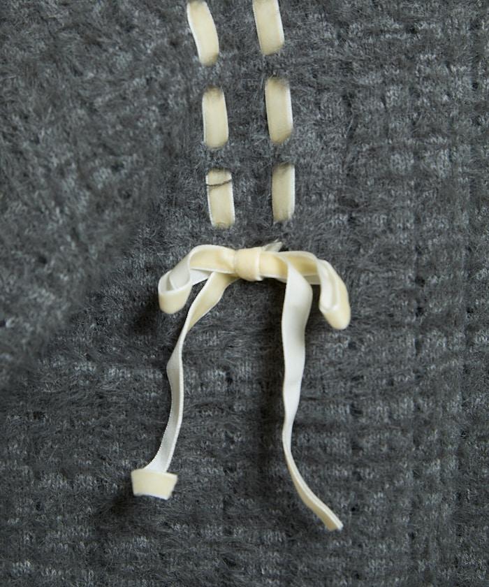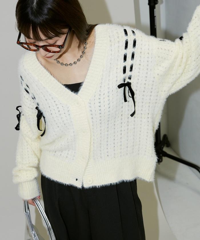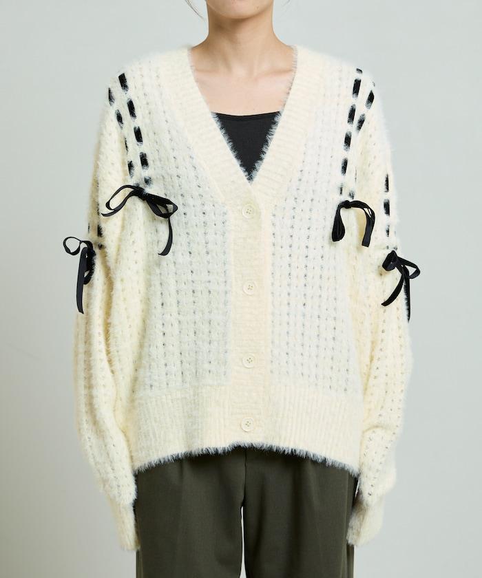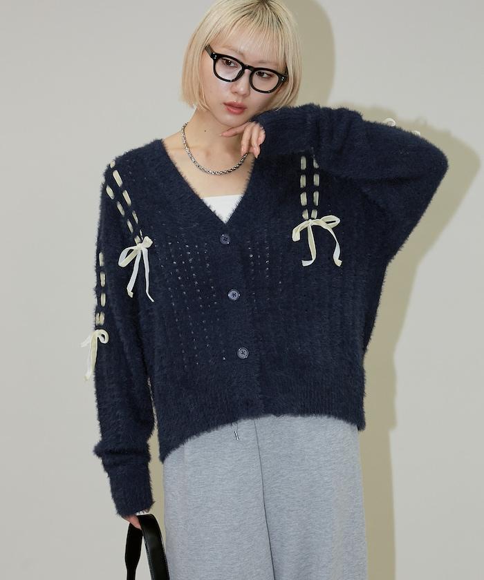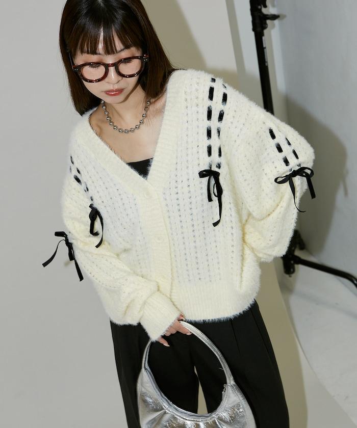 天鵝絨蝴蝶結編織羽毛針織開衫