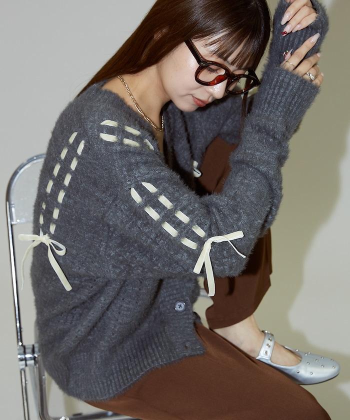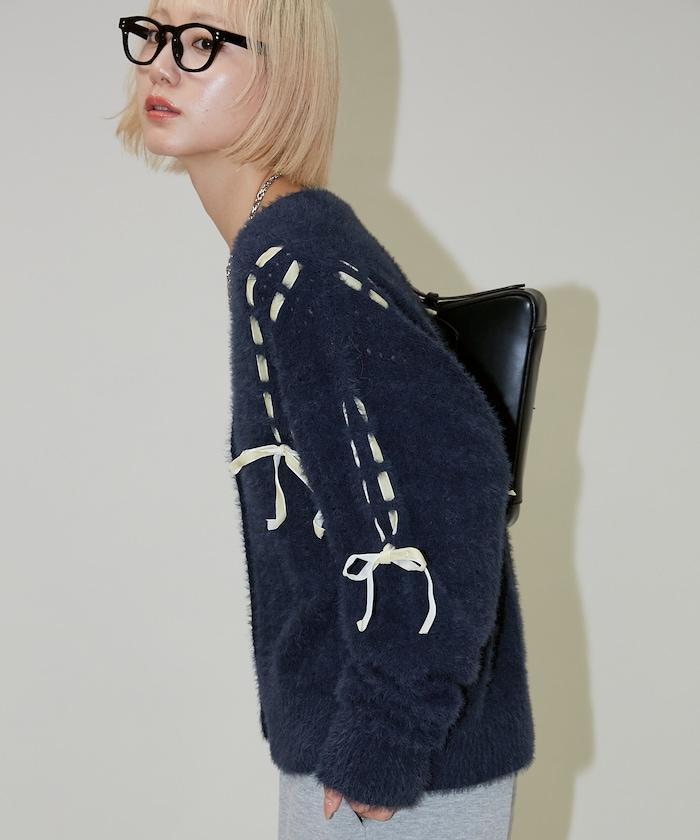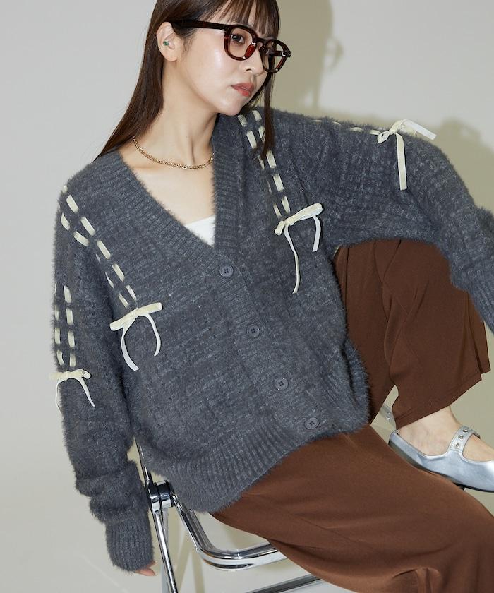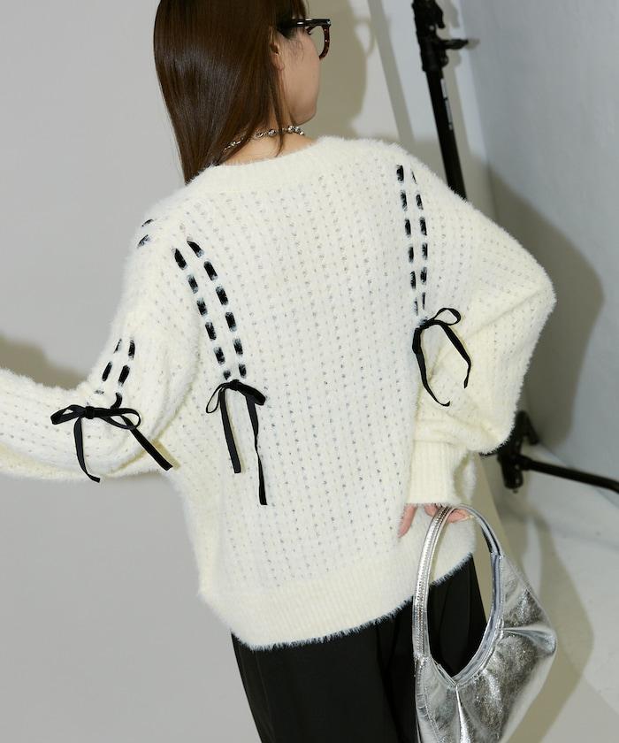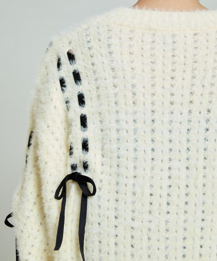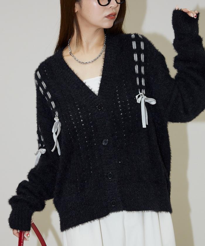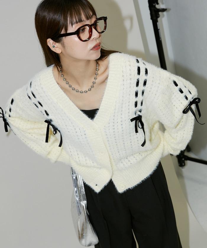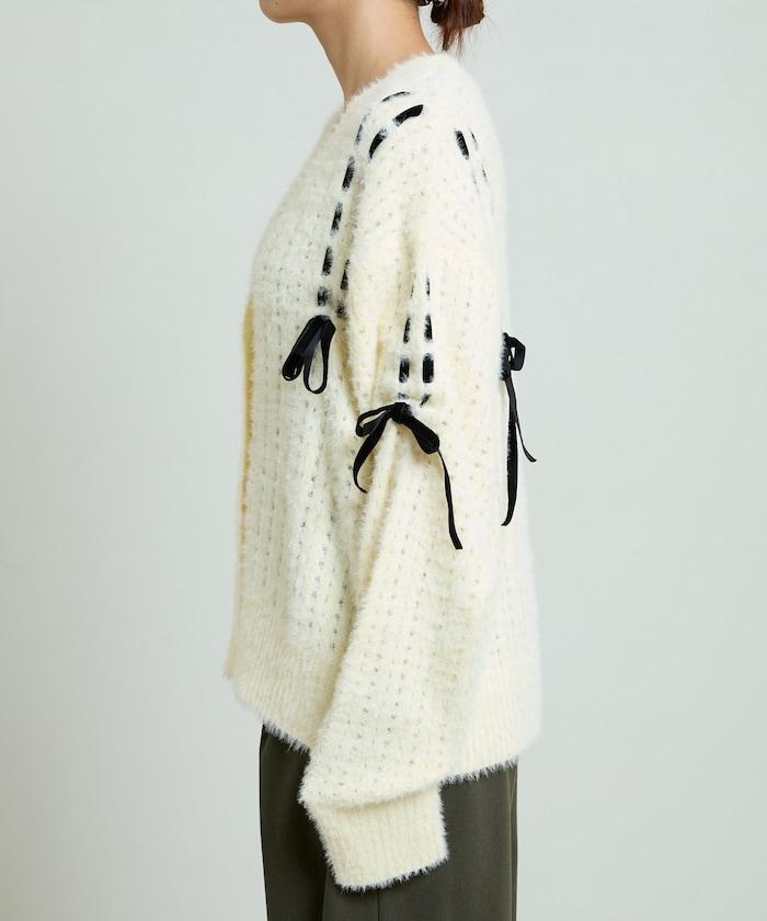 天鵝絨蝴蝶結編織羽毛針織開衫