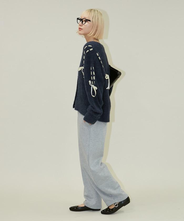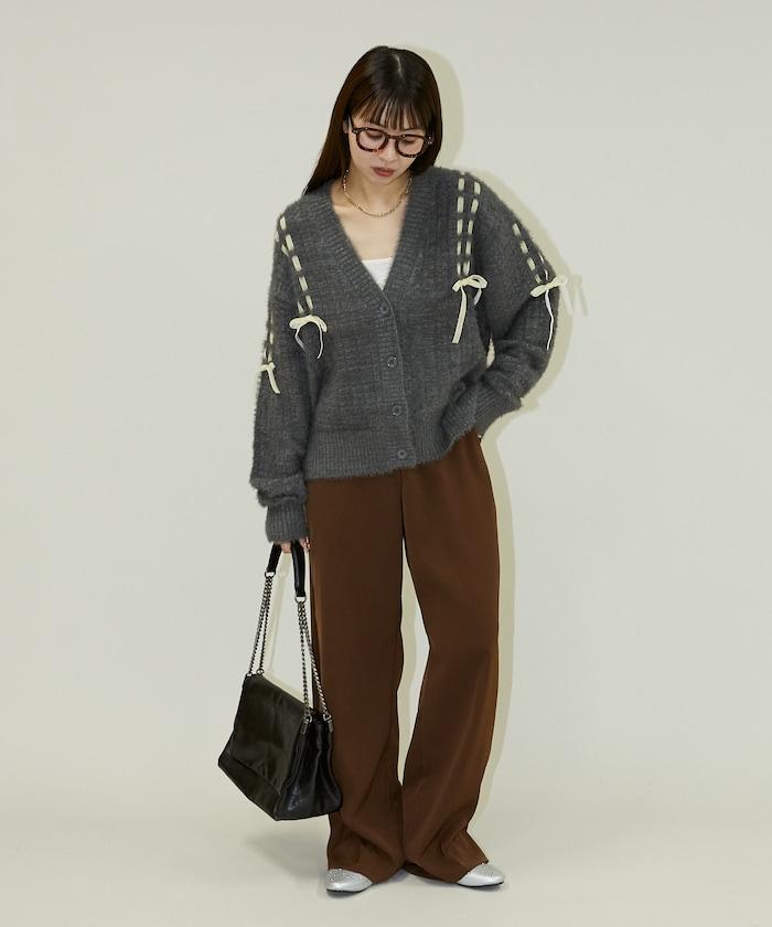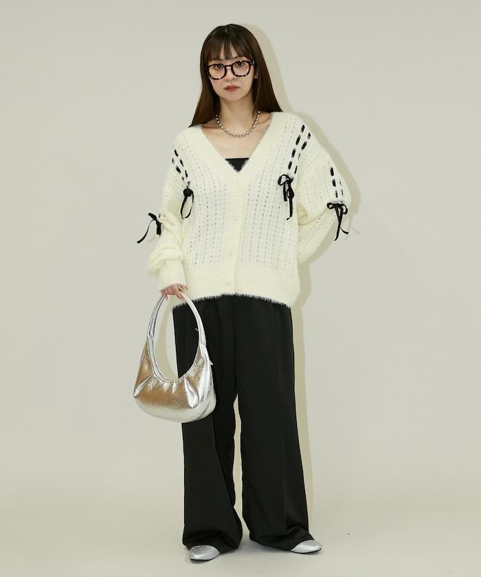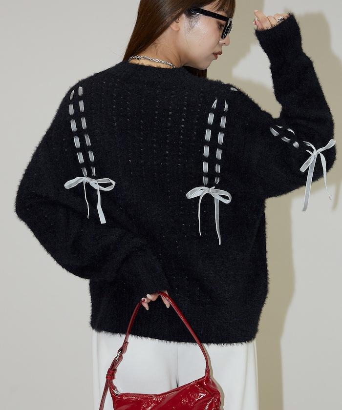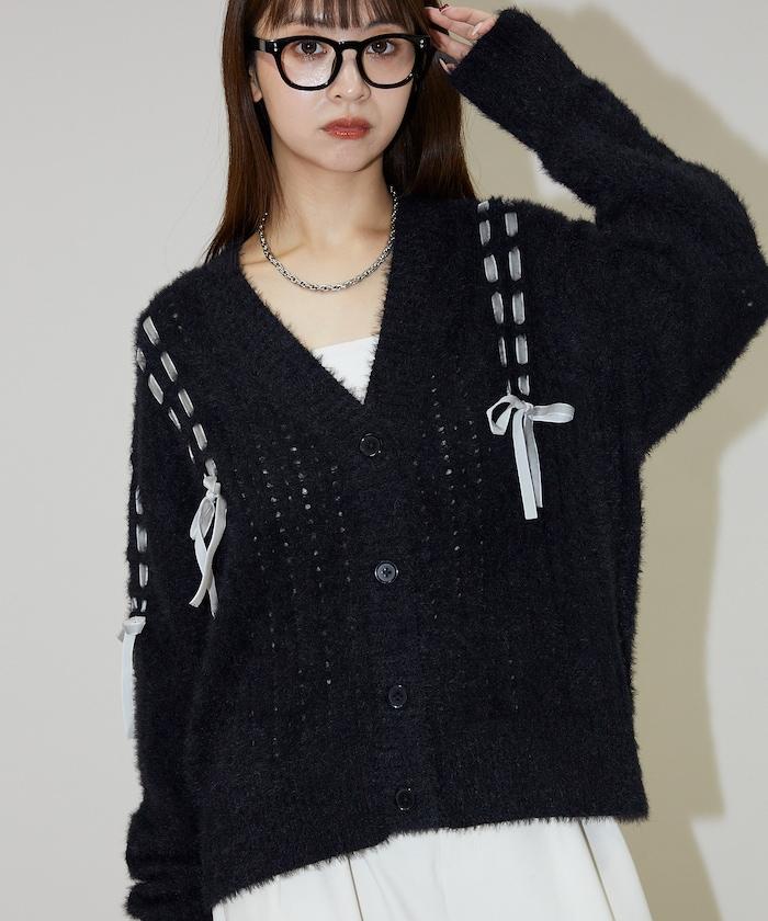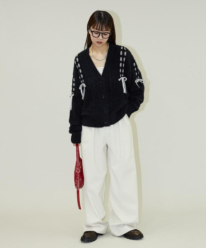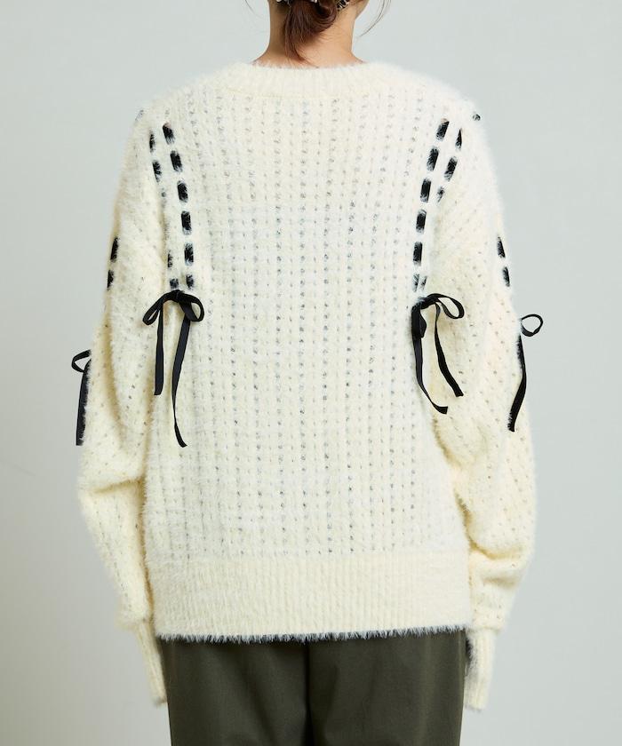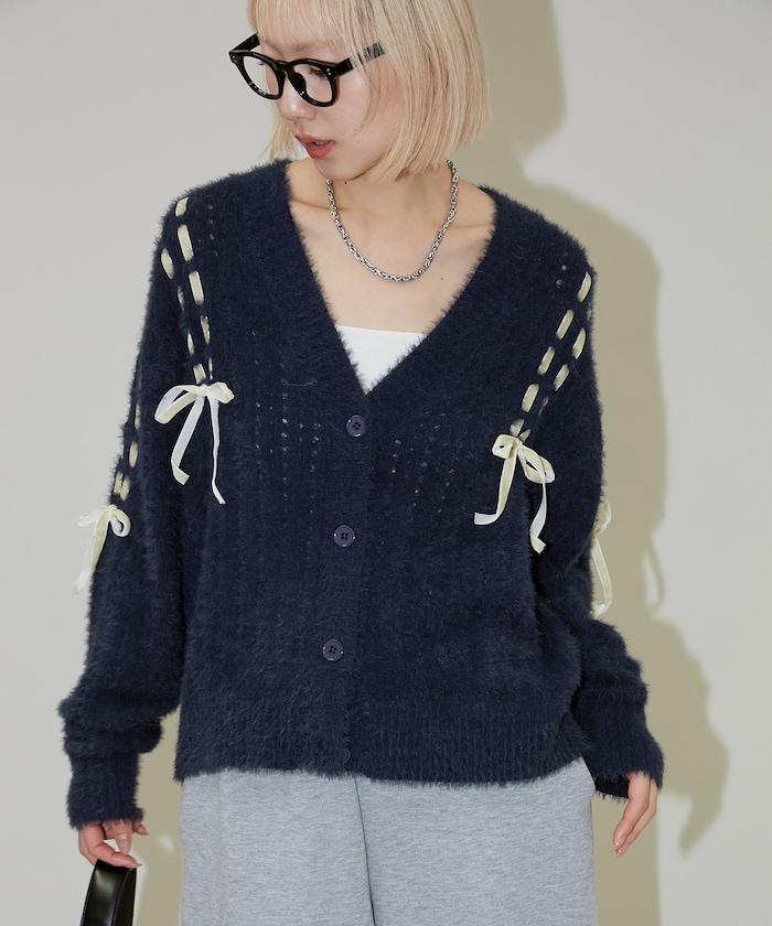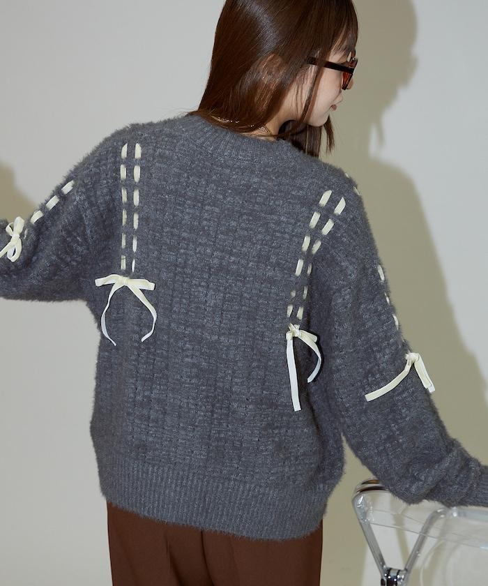 天鵝絨蝴蝶結編織羽毛針織開衫