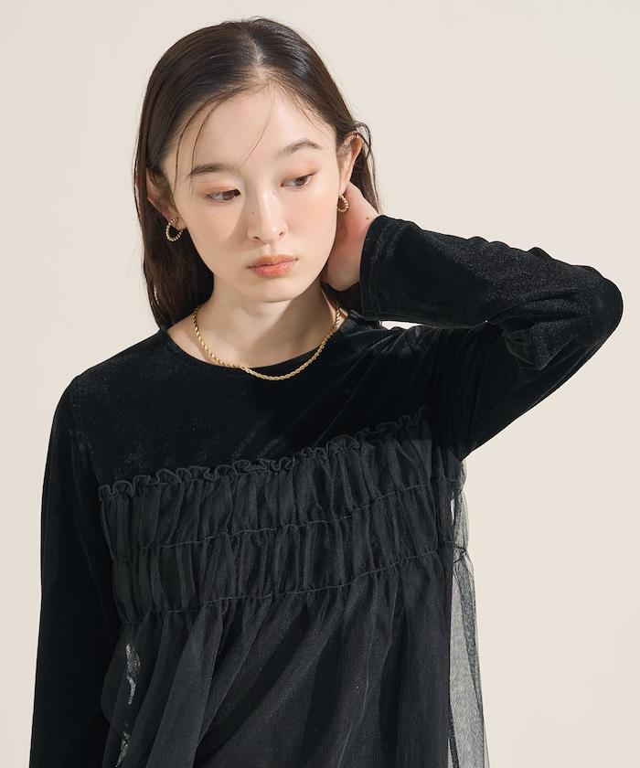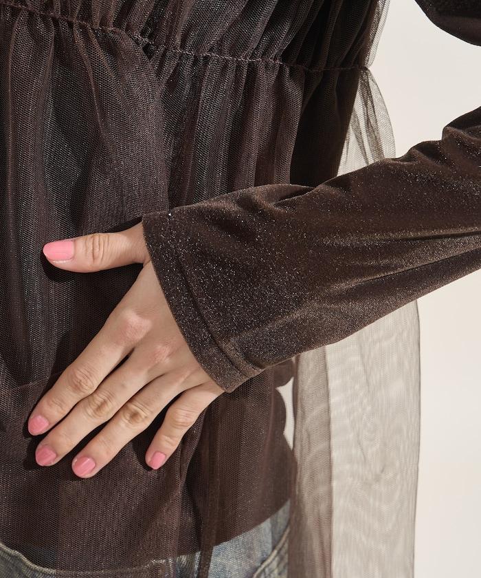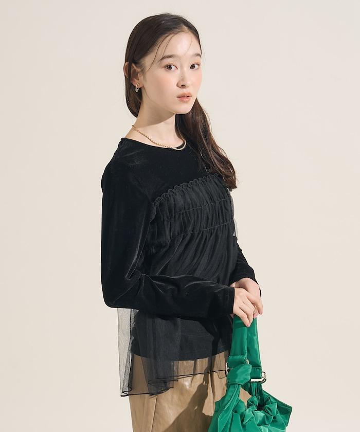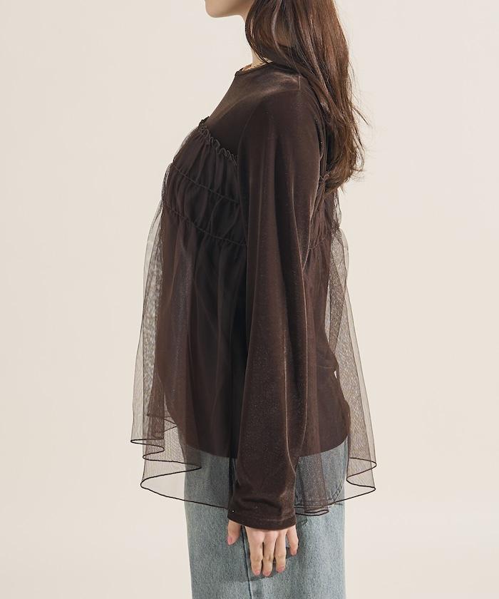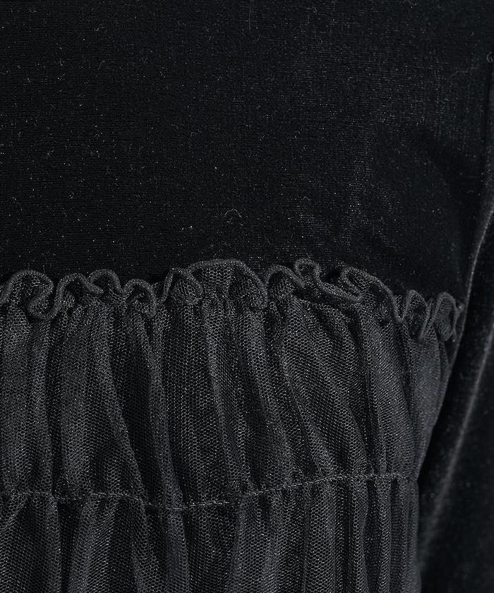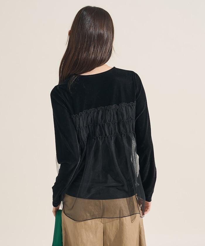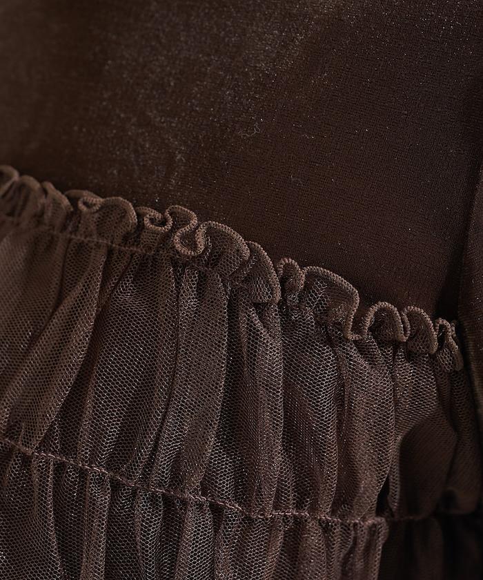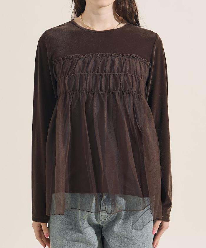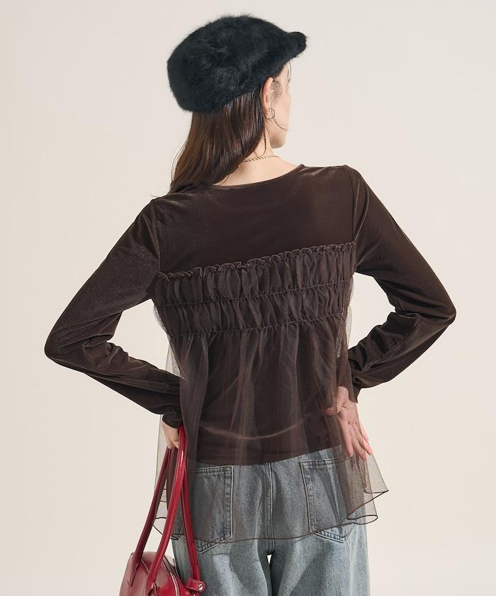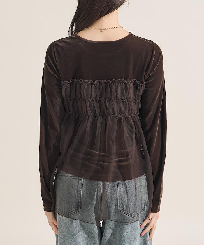 這款華麗的上衣由彈力天鵝絨針織面料和薄紗荷葉邊製成。