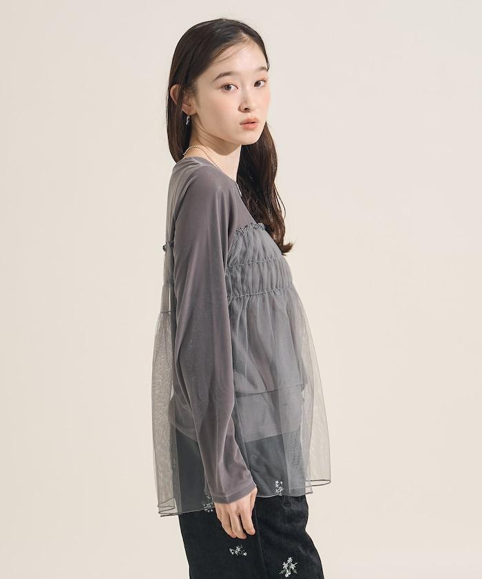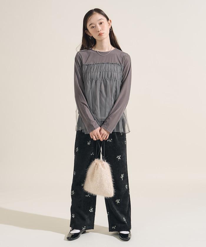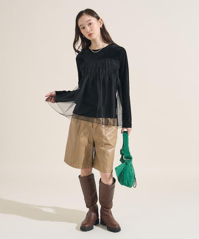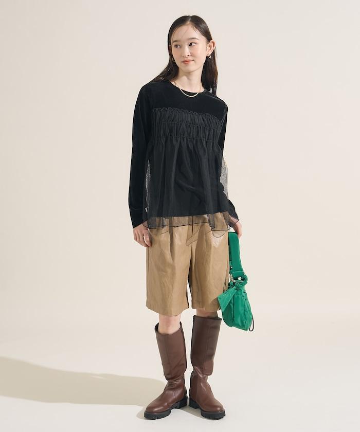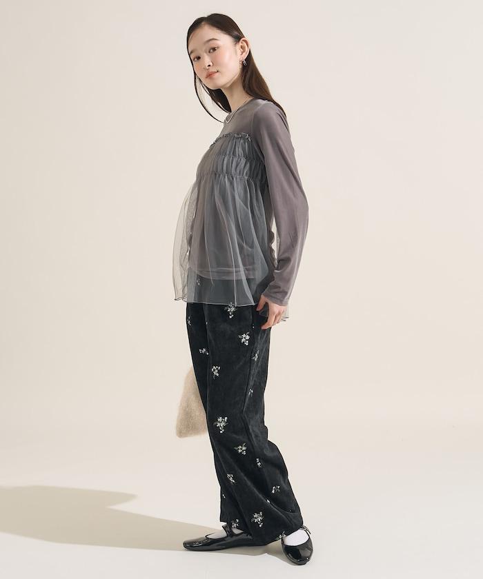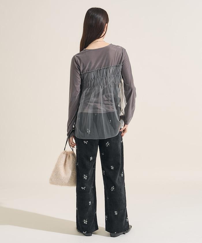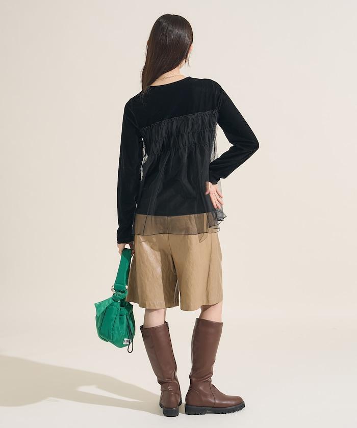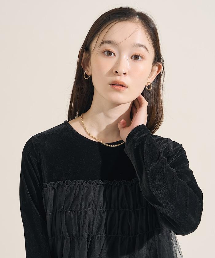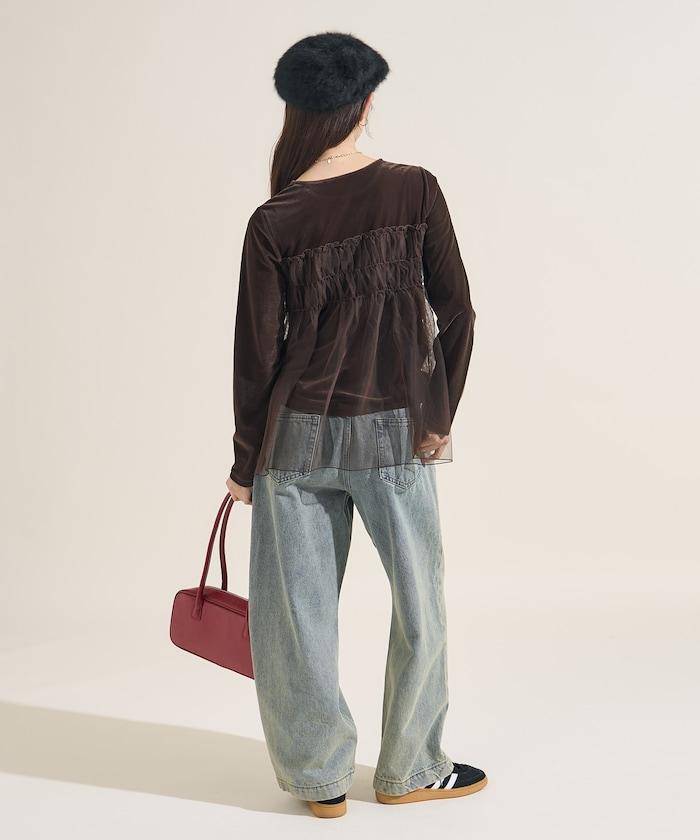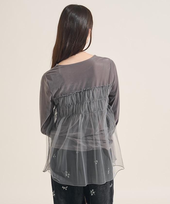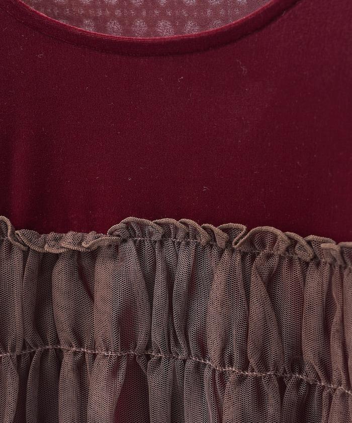 這款華麗的上衣由彈力天鵝絨針織面料和薄紗荷葉邊製成。