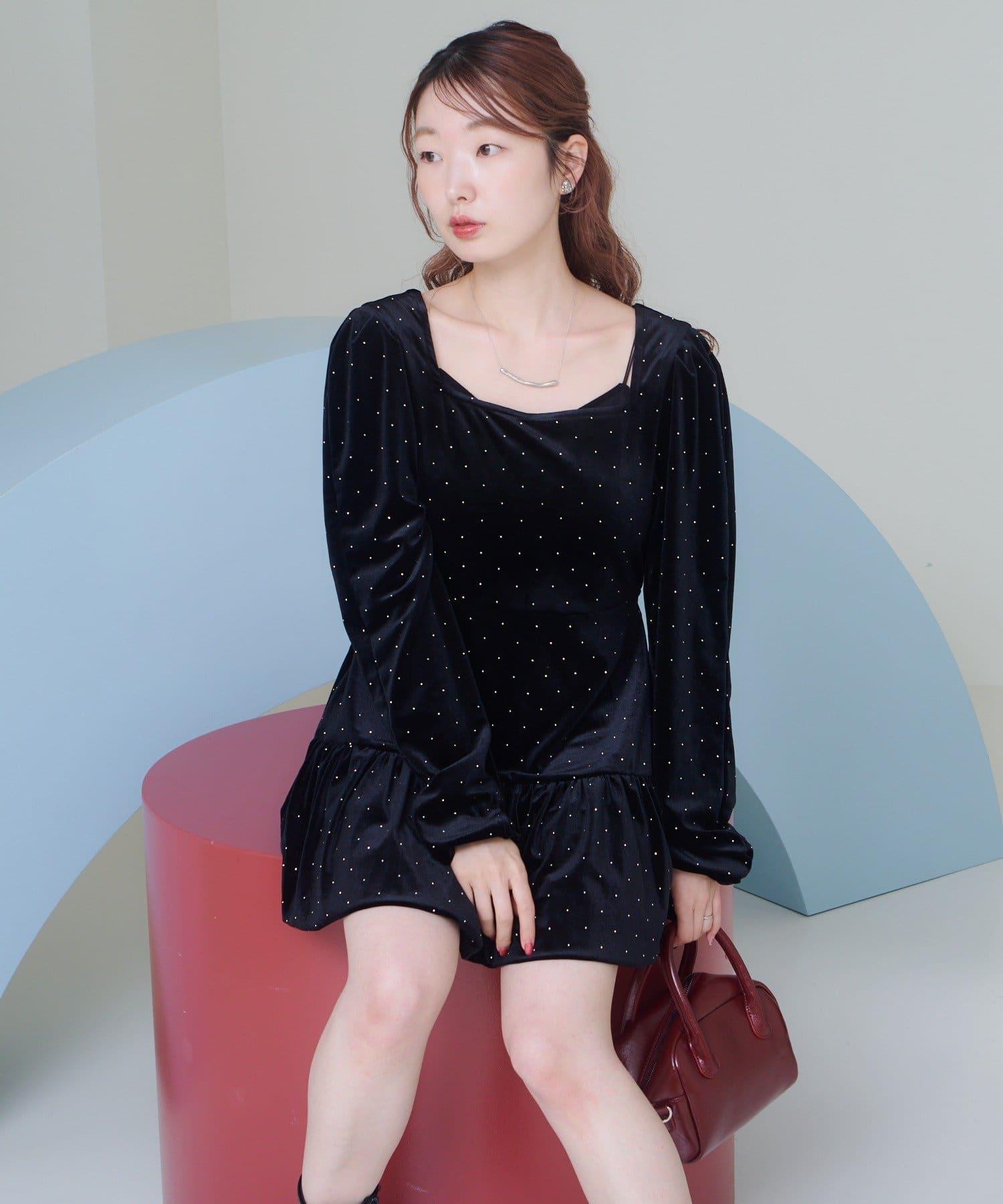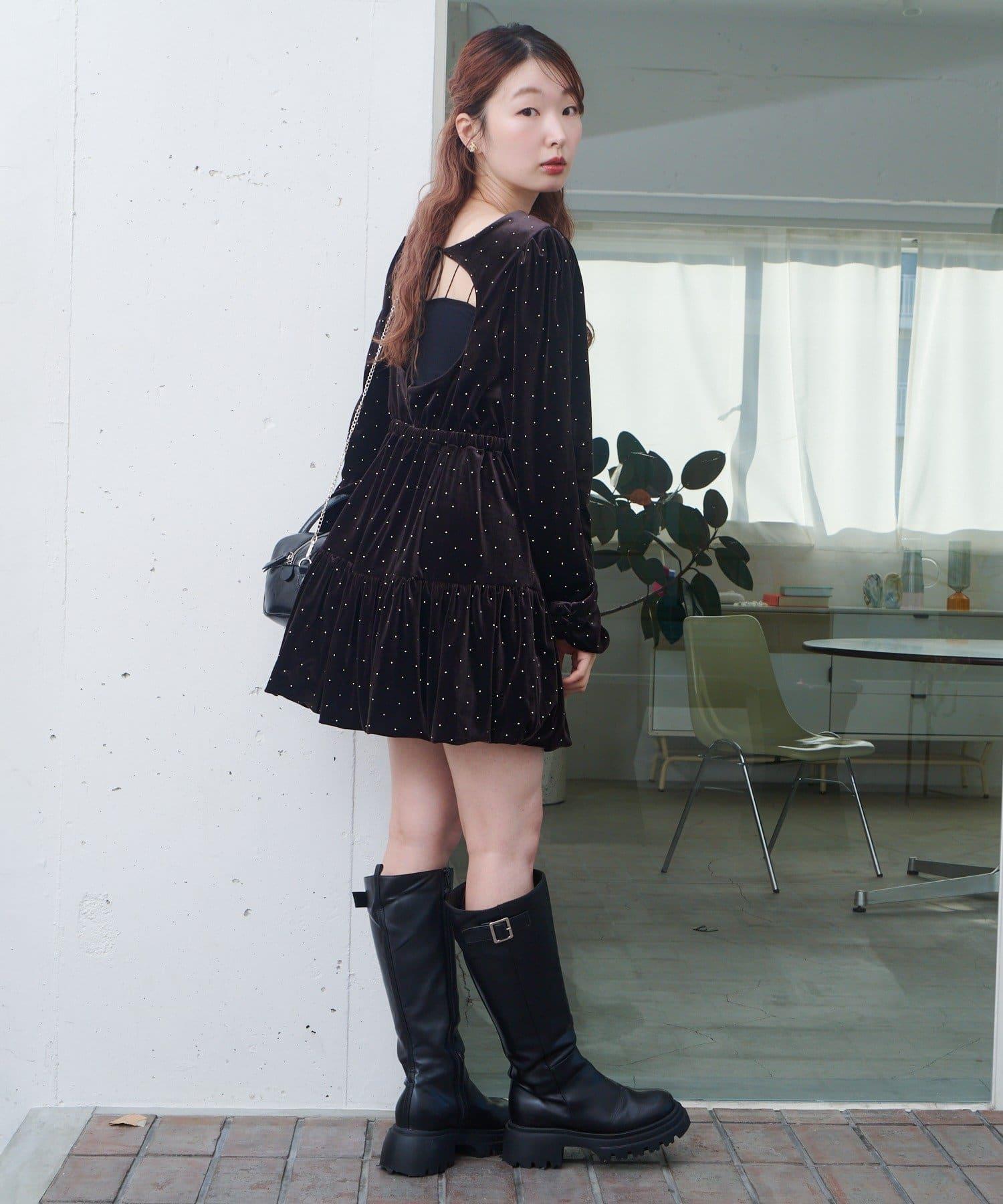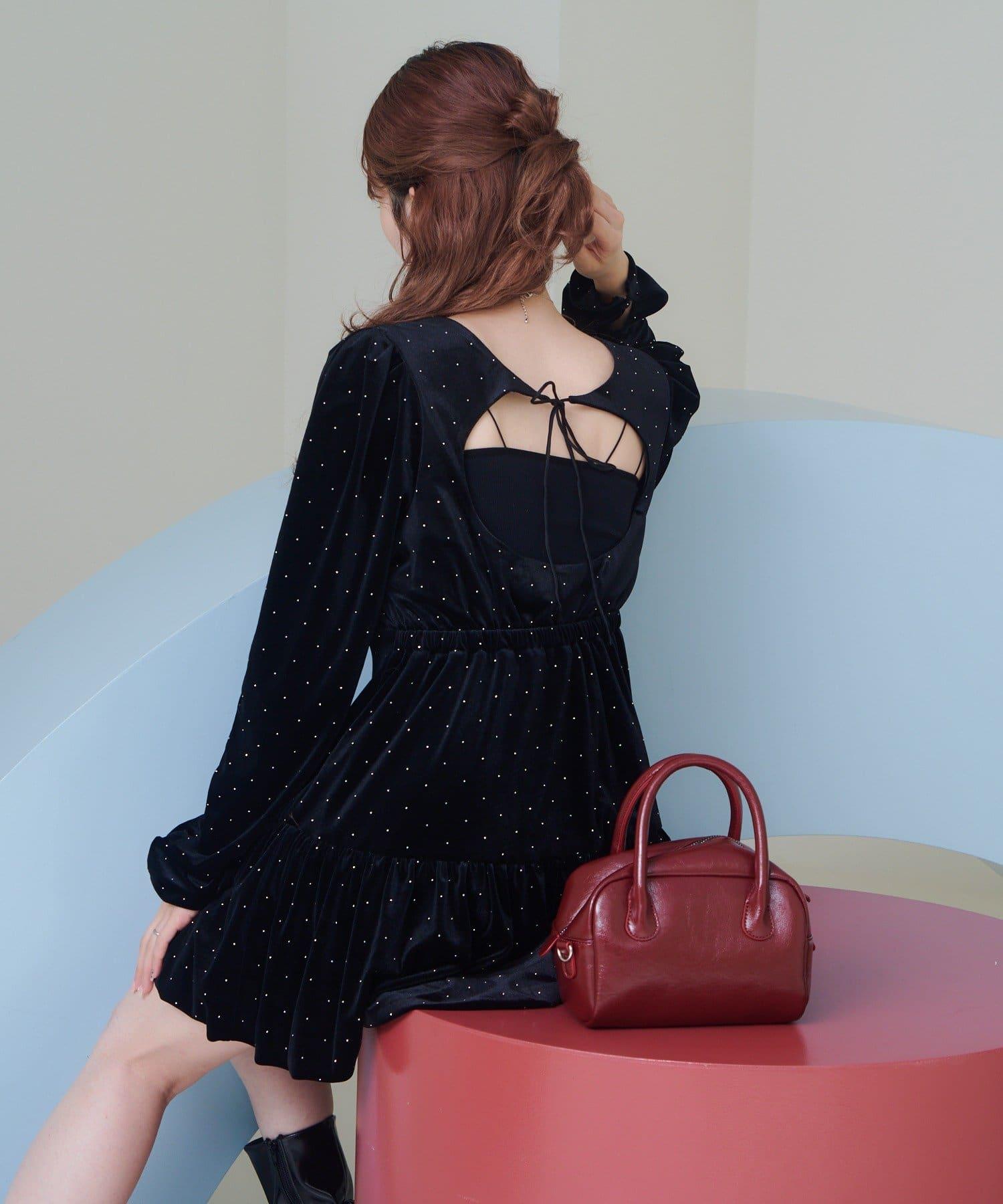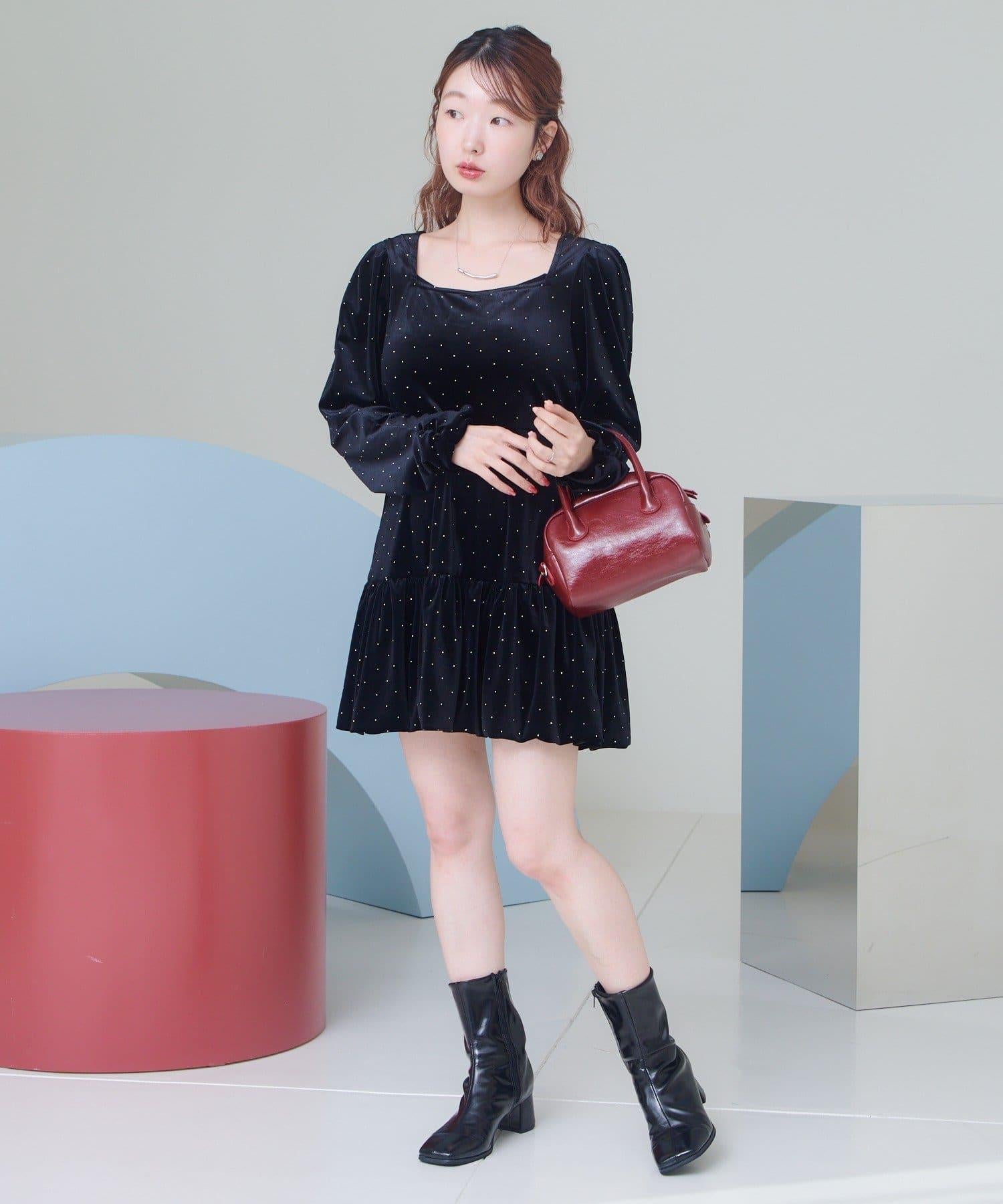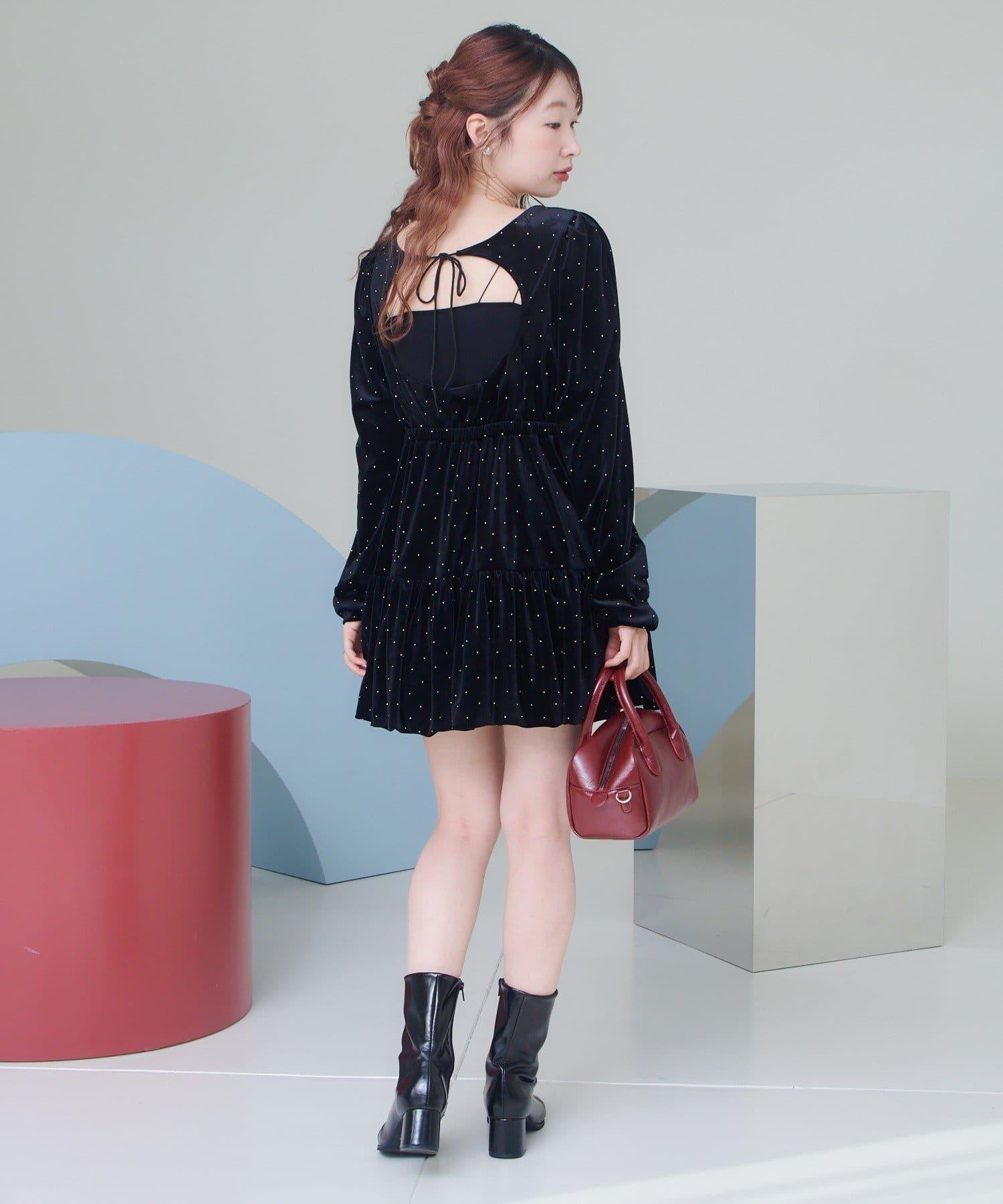 天鵝絨迷你連衣裙,飾有閃閃發光的精美鉚釘。